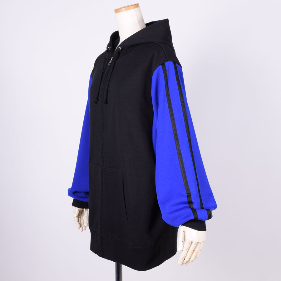 袖をジャージ生地で切り替えたジップアップタイプのスウェットフーディー。