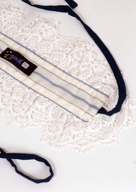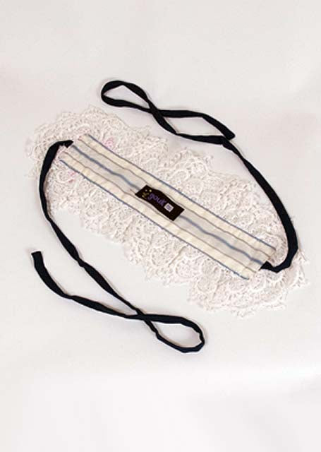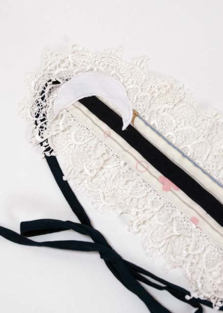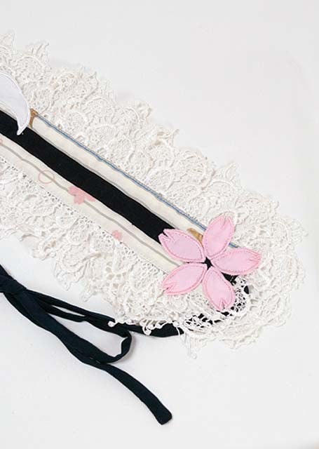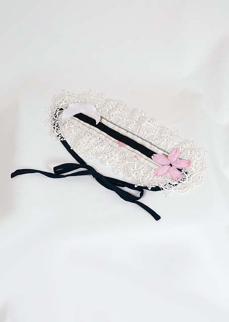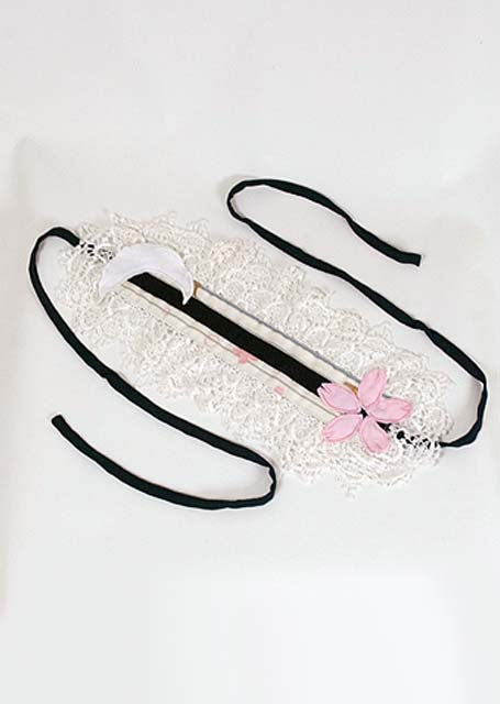永い月日を超えて美しく在る桜と月を、 ストライプの生地にプリントしたオリジナル和柄のヘッドドレスです。 結び紐部分は、薄い雲をイメージしたフハクの透けた生地で作っているので、 滑って解けてきたりする心配がありません。 <本体サイズ>幅:約15cm(レース含む) 長さ:約36cm(レース含む) 紐の長さ:約58cm