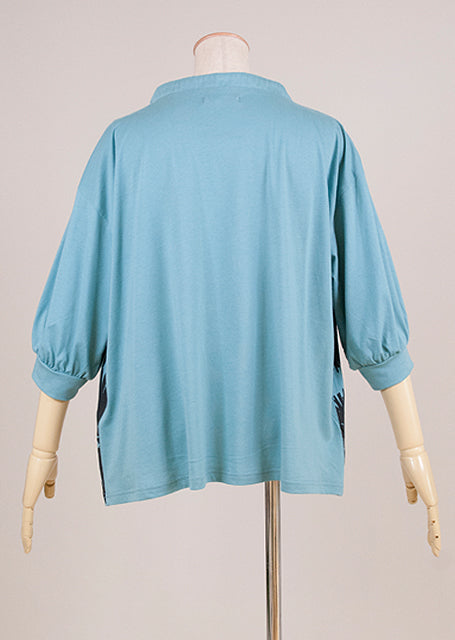 袖口はギャザーを寄せてありふわっとしたラインです。 ※プリント柄の見え方はそれぞれ異なります。 <本体サイズ>肩幅:約57cm バスト:約130cm 着丈:約62cm 袖丈:約31cm 腕回り:約44cm <本体素材A>綿100%