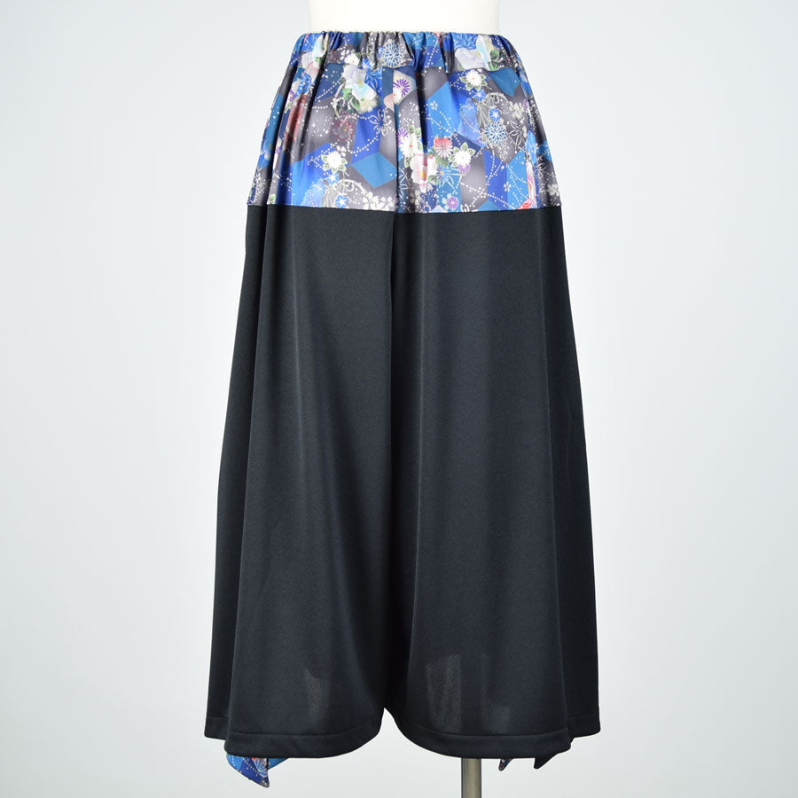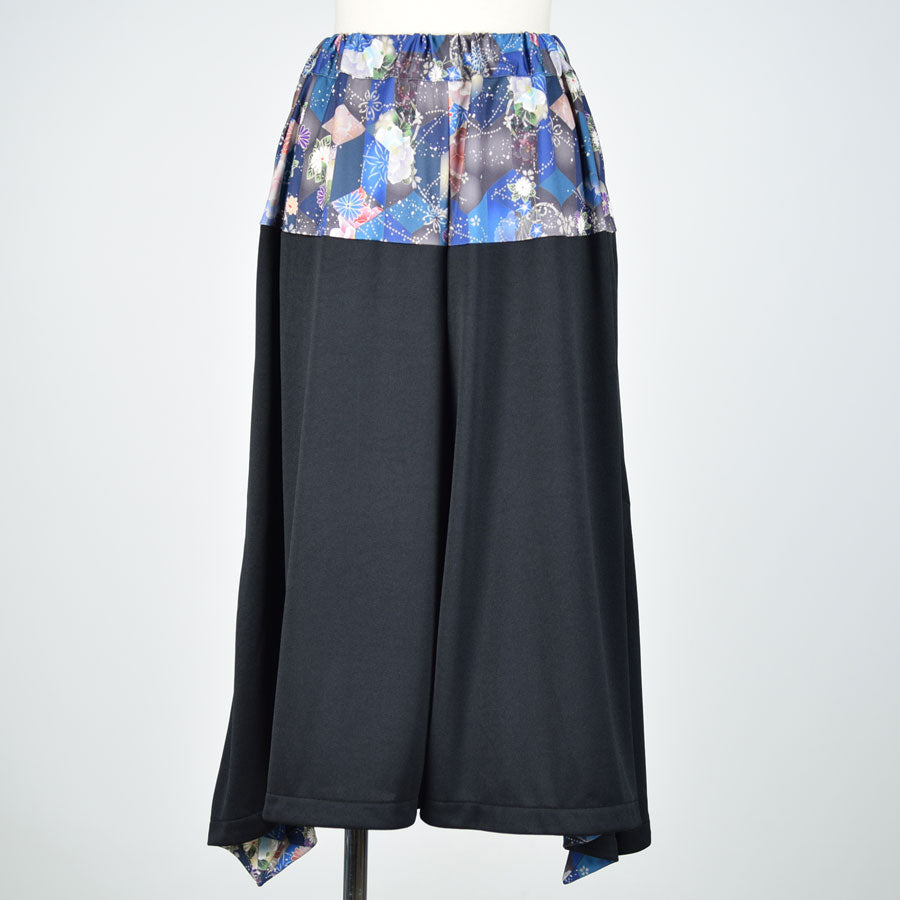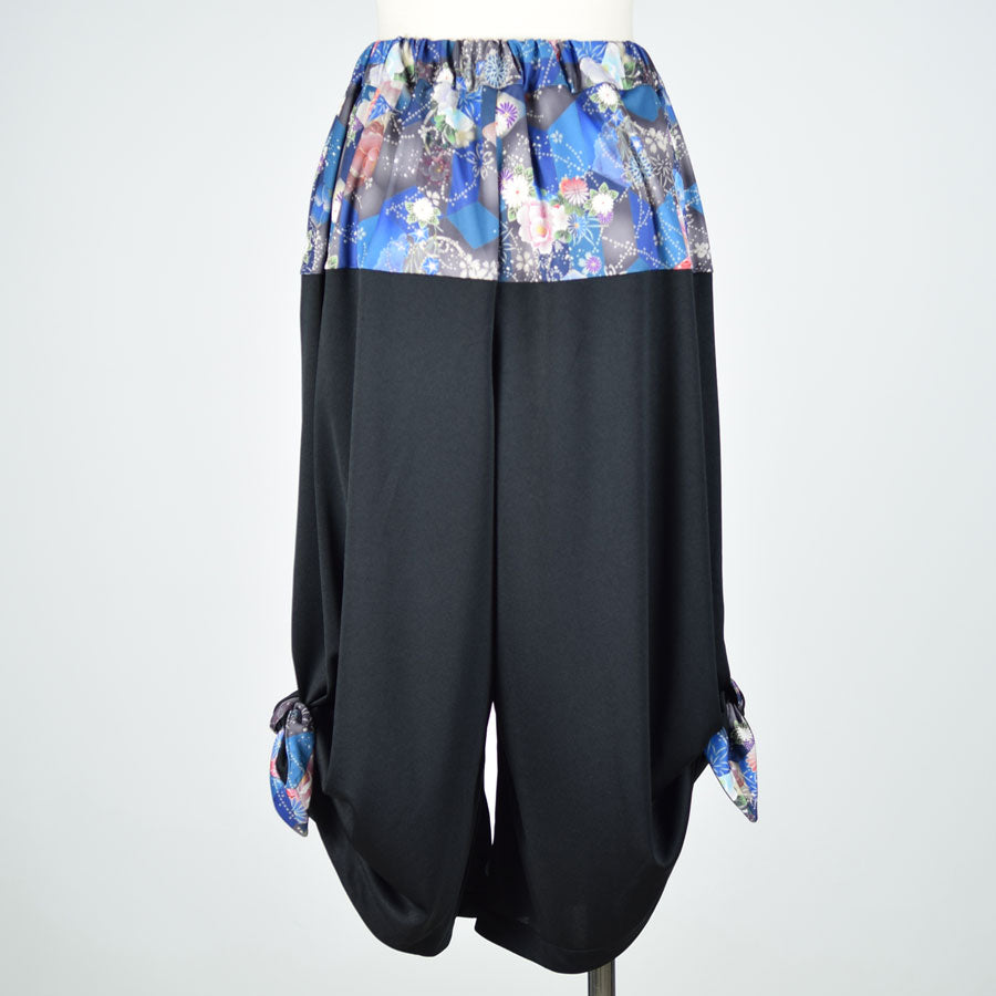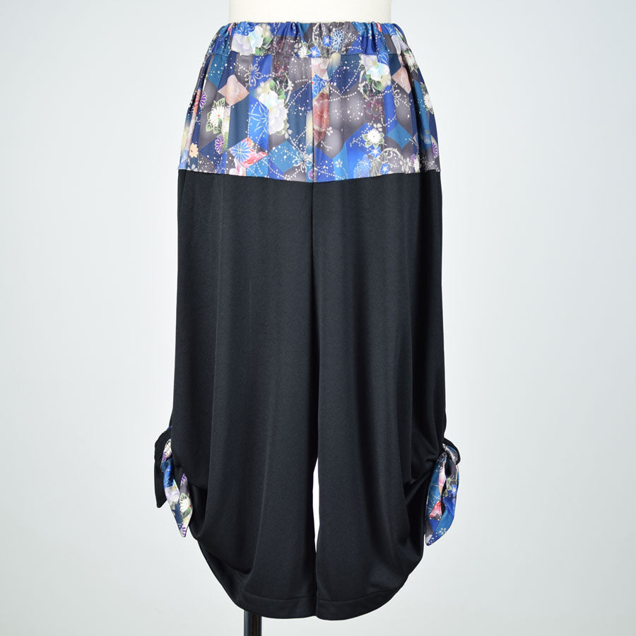 ウエスト周りの和柄がトップスなどの裾から少し見えるので、2枚重ねているようなコーディネートができるパンツです。