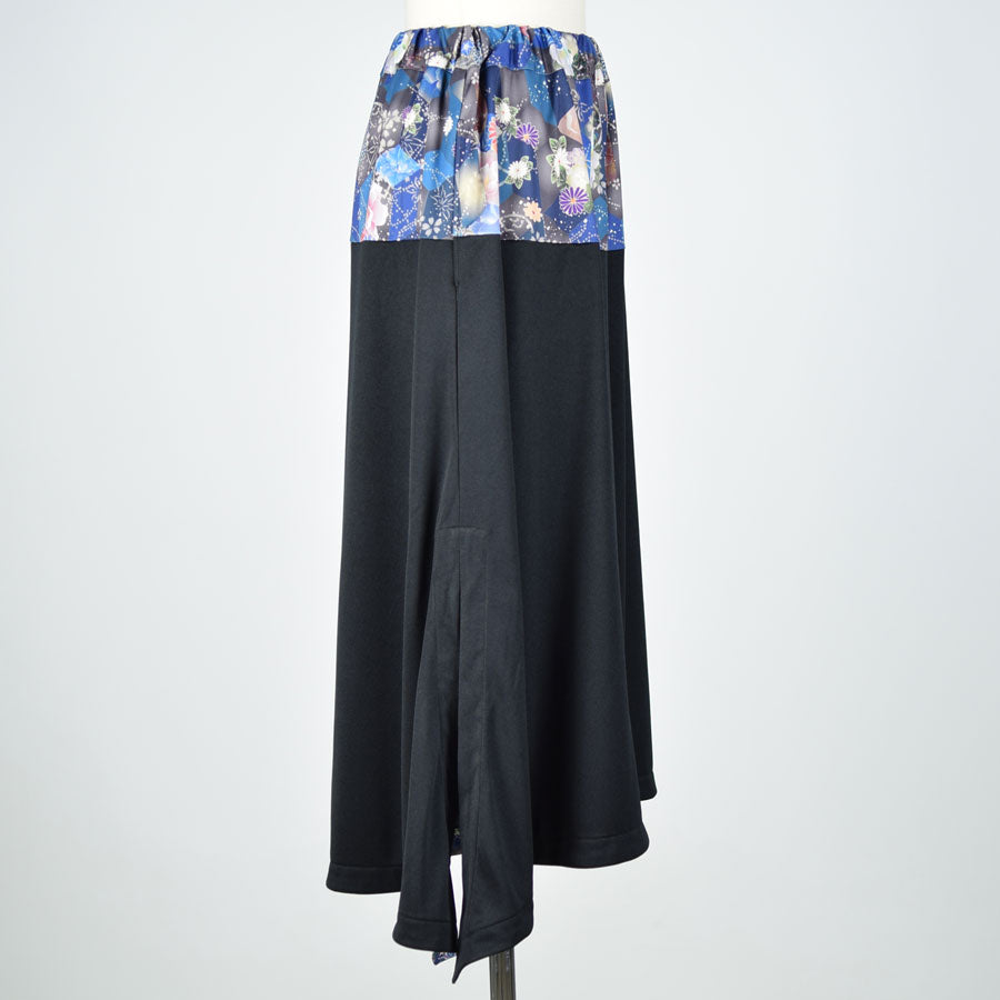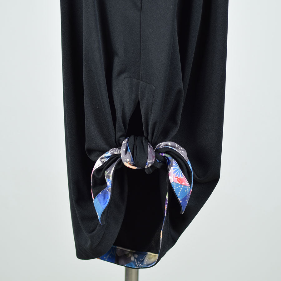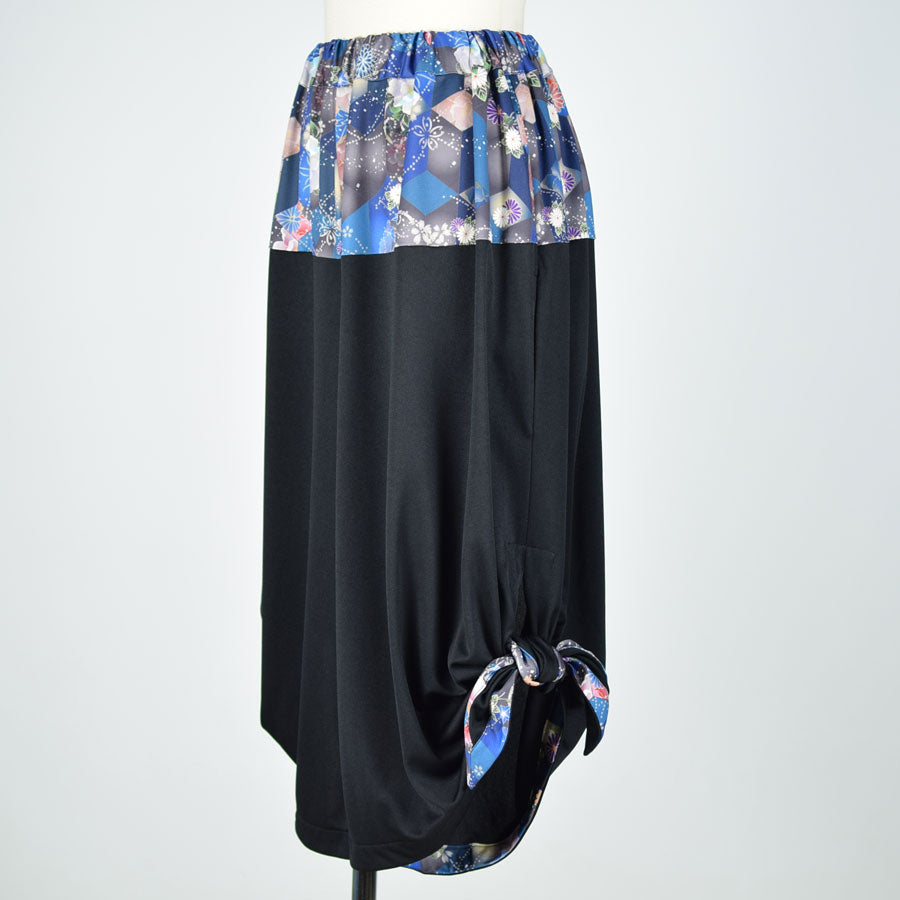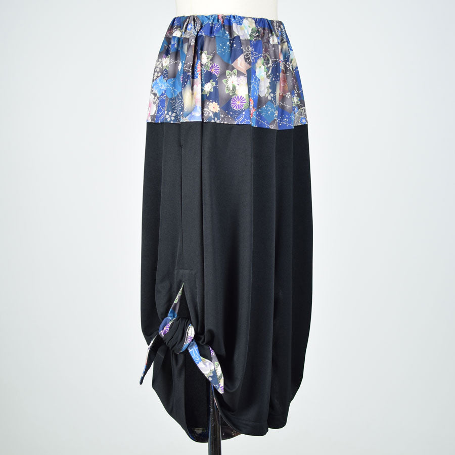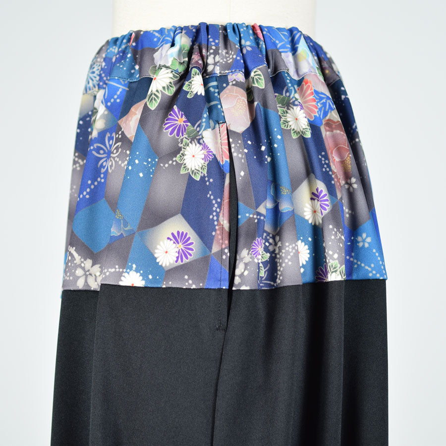 ウエスト周りの和柄がトップスなどの裾から少し見えるので、2枚重ねているようなコーディネートができるパンツです。