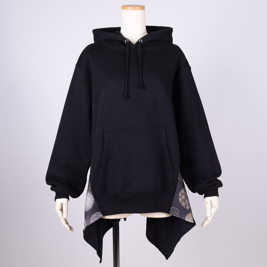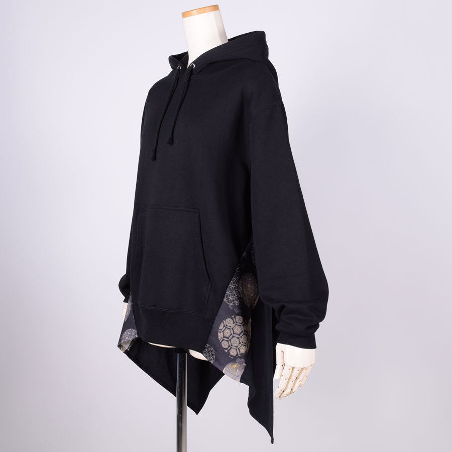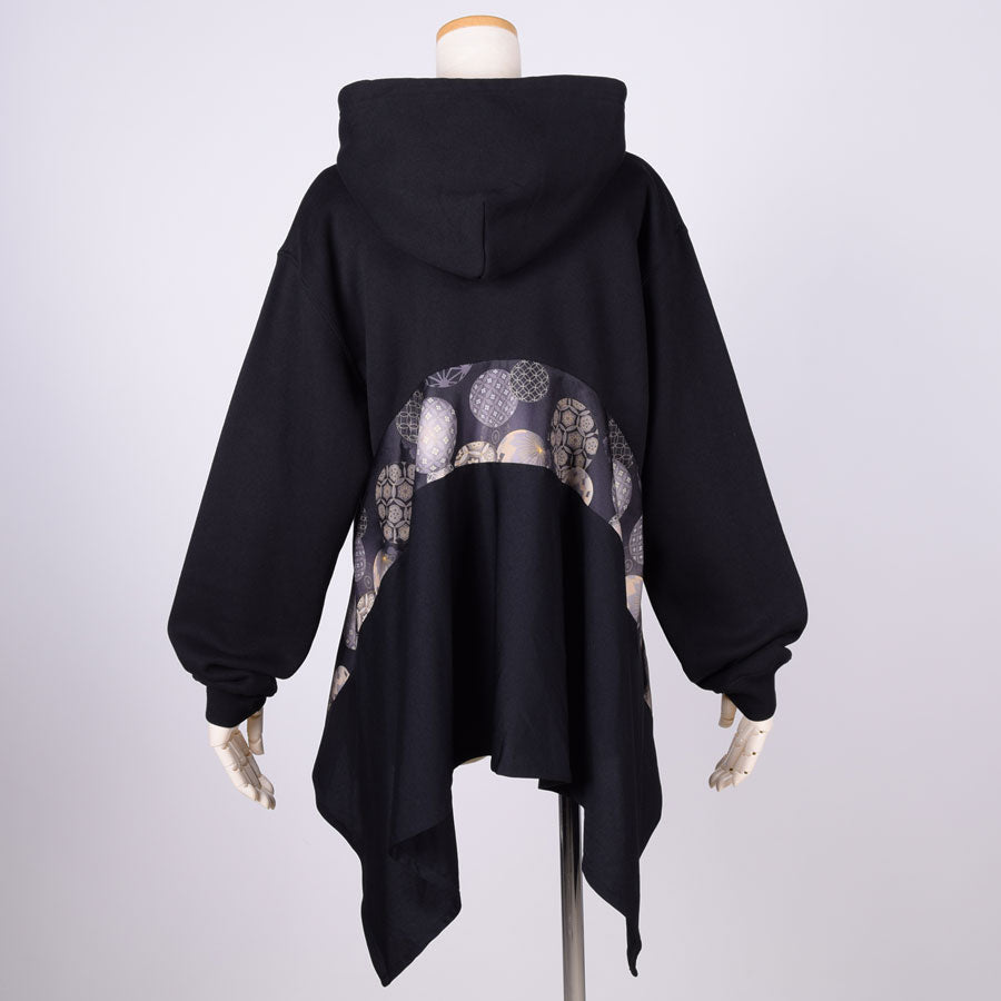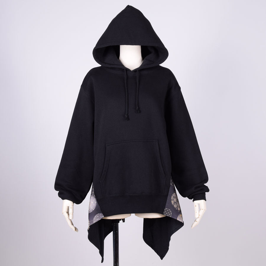 両脇が長めになっていて後ろを和柄と無地で切り替えひらひらとさせたフーディです。