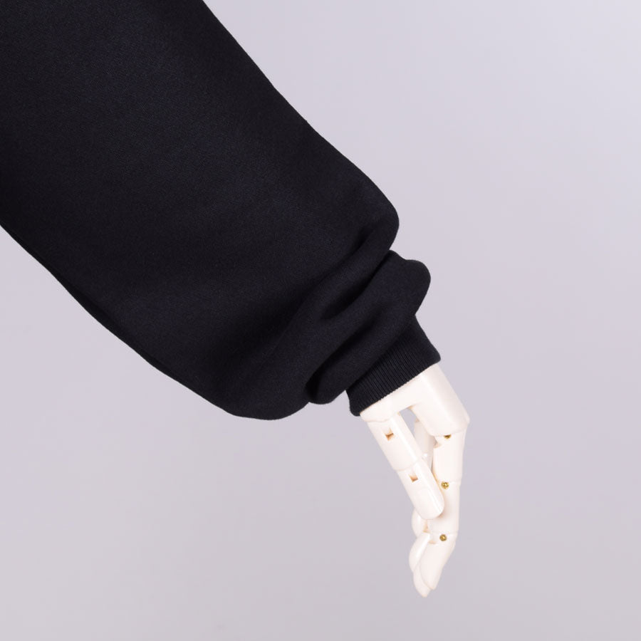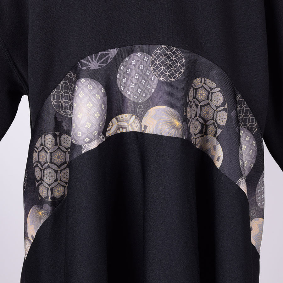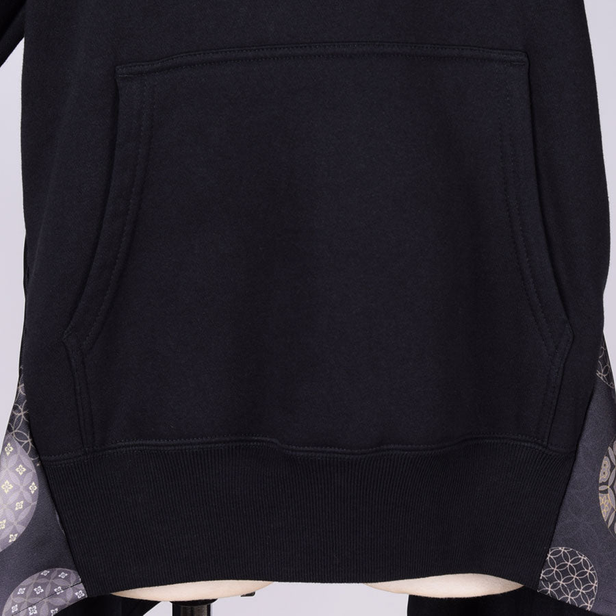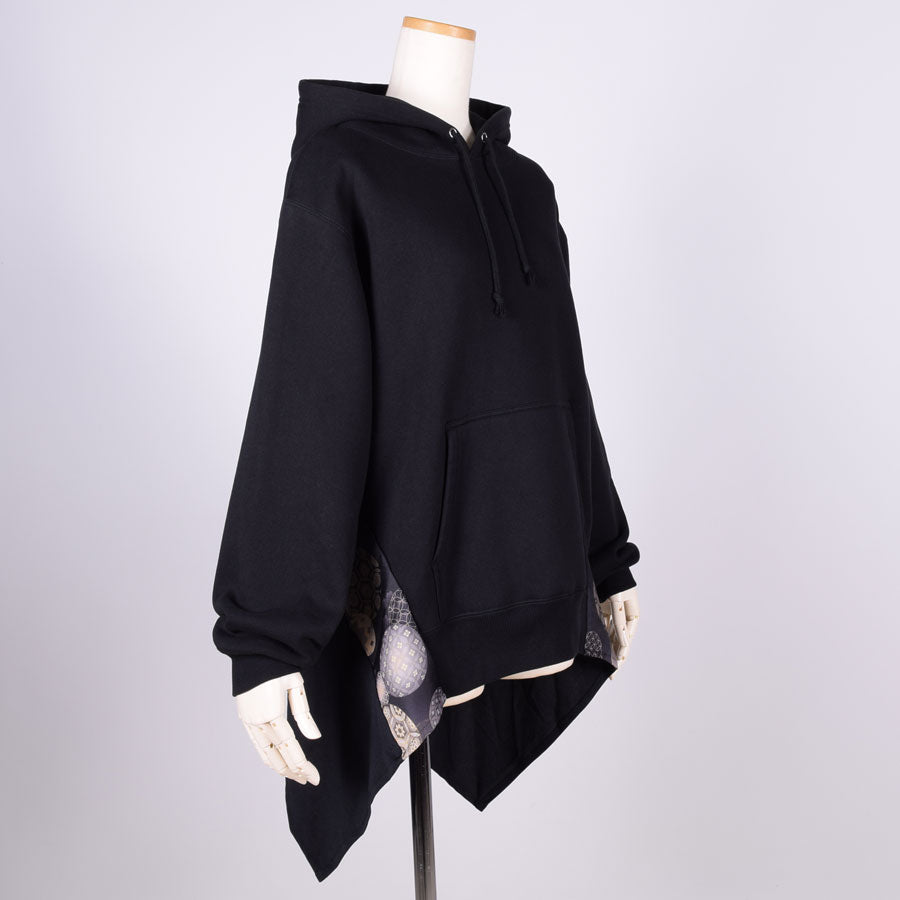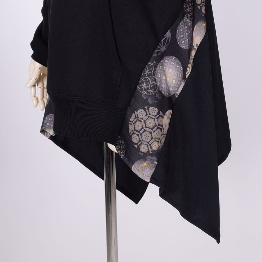 両脇が長めになっていて後ろを和柄と無地で切り替えひらひらとさせたフーディです。
