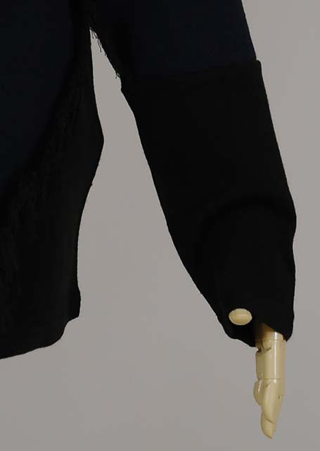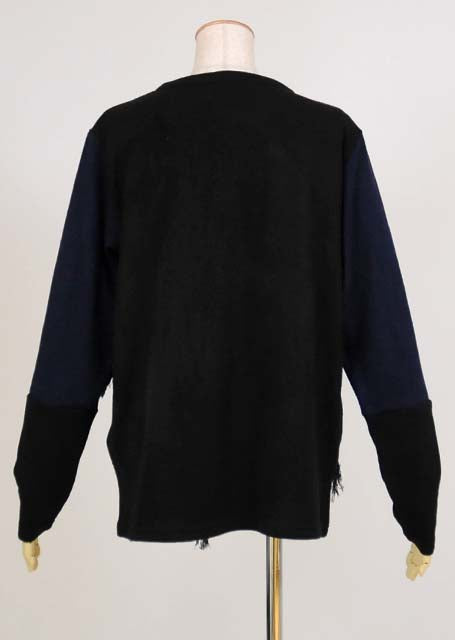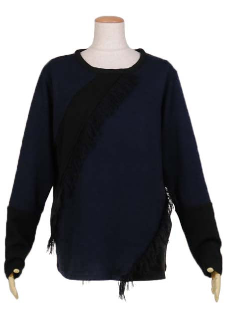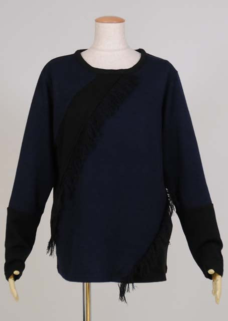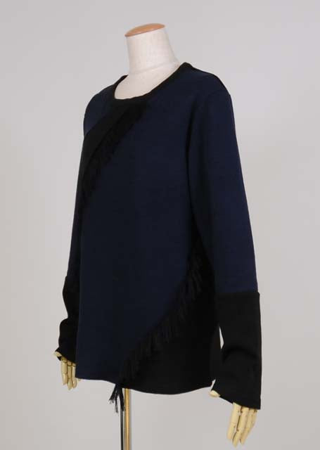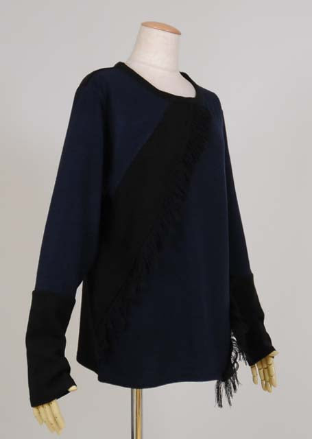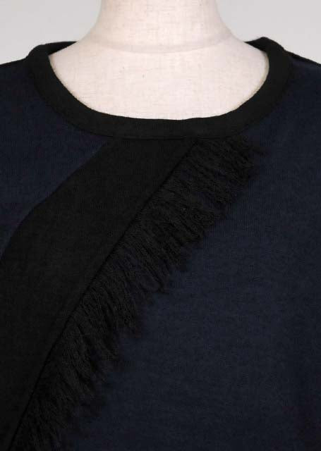 黒と紺の薄手ニット生地を切り替えて生地を解いたフリンジを付けたTシャツ