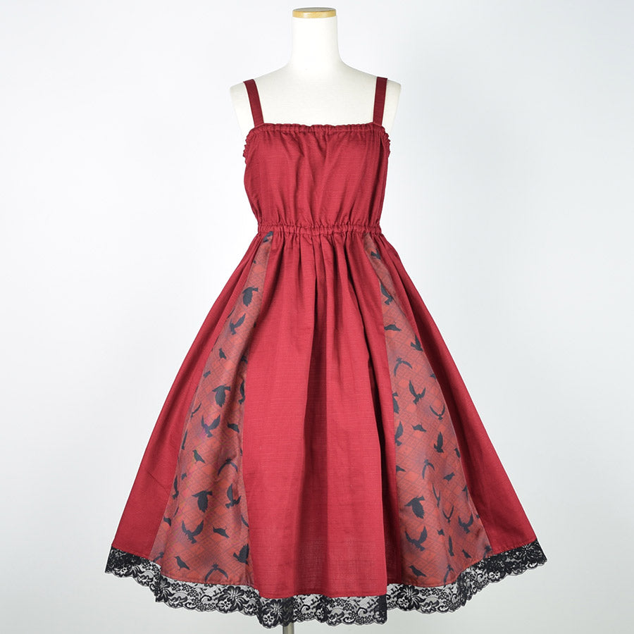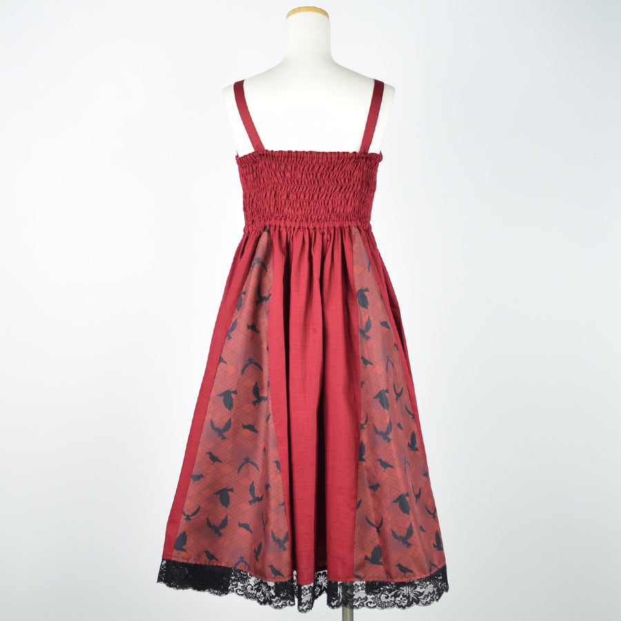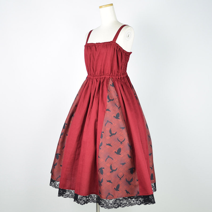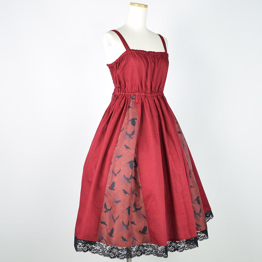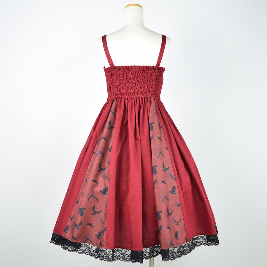 無地のシャンタン生地をデザインの主に用いたジャンパースカート。
