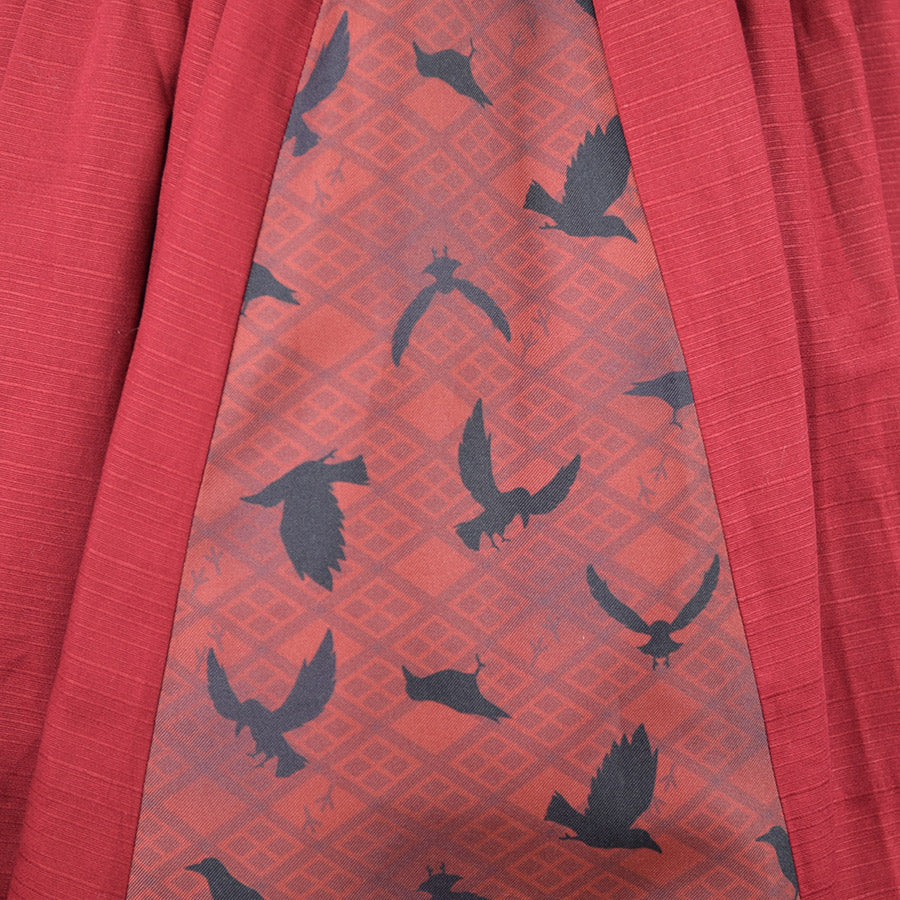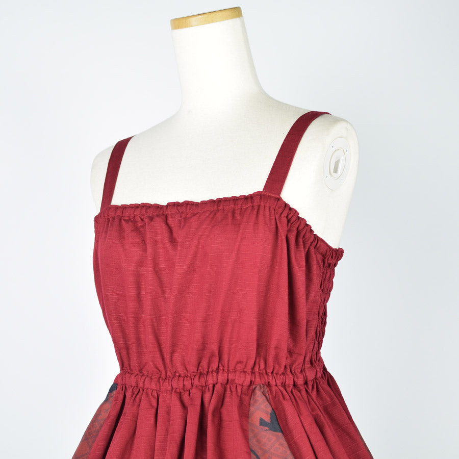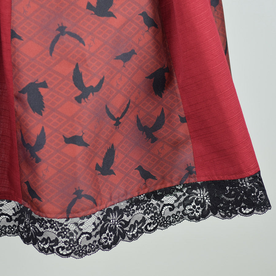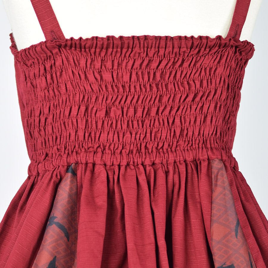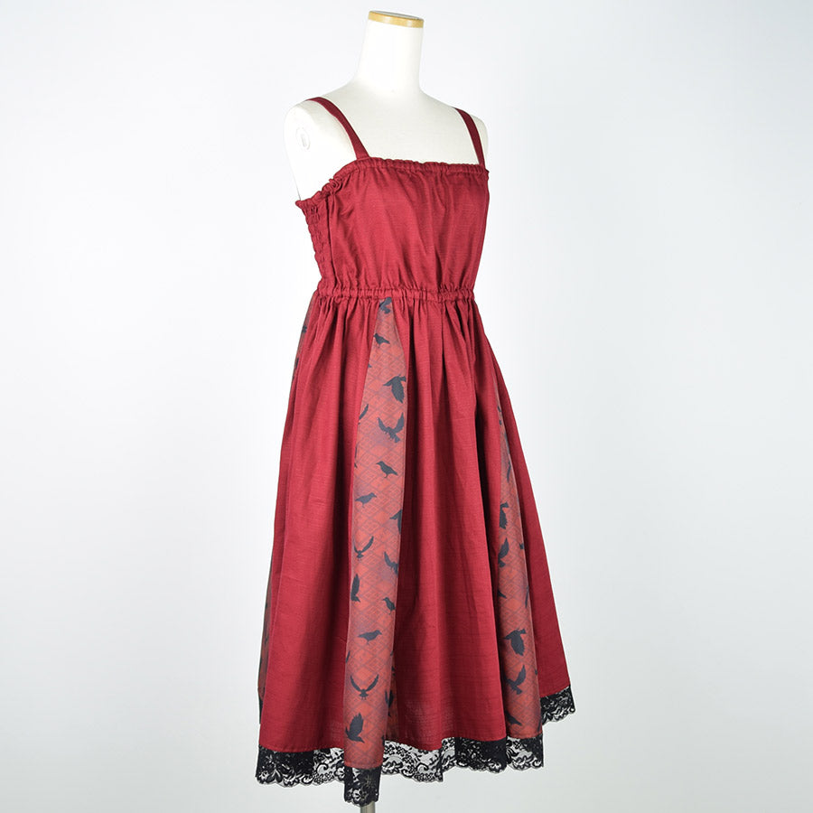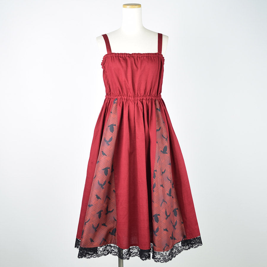 無地のシャンタン生地をデザインの主に用いたジャンパースカート。