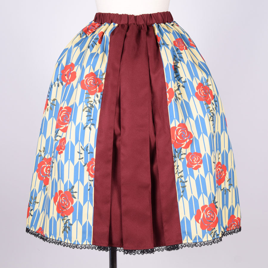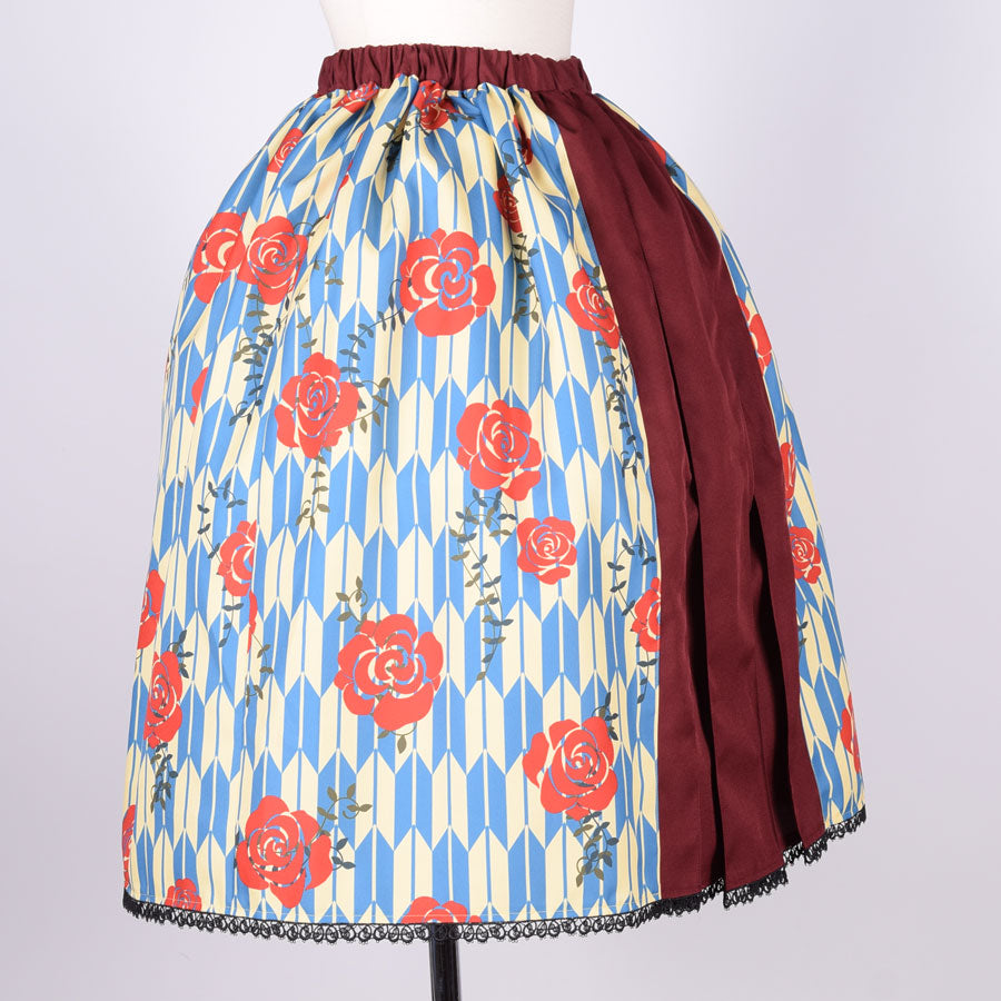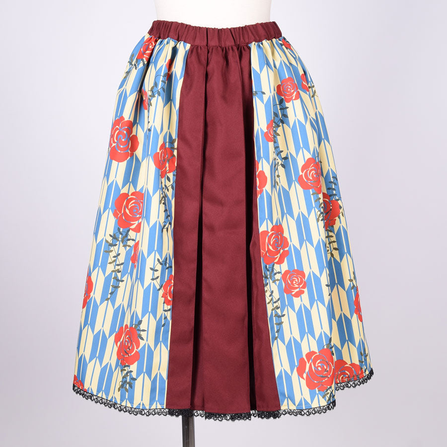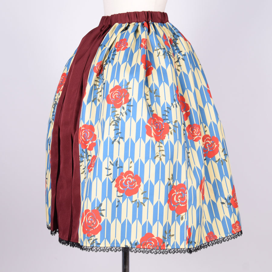 フロントにシャンタン生地のプリーツを使用し、モリグチカのテキスタイルと和のスタイリングをあわせたスカート。