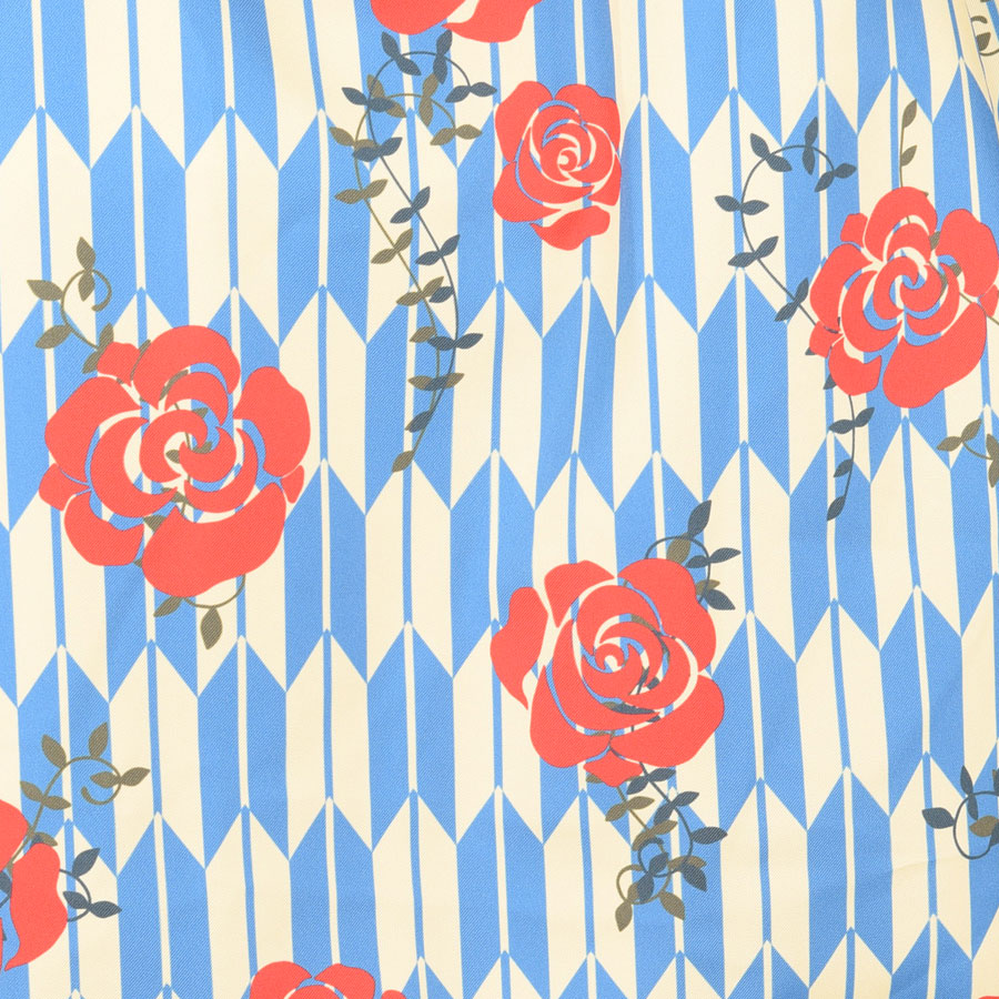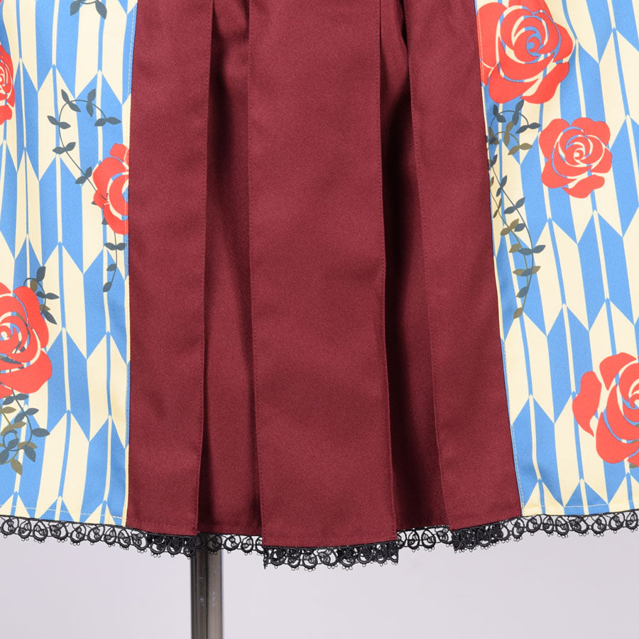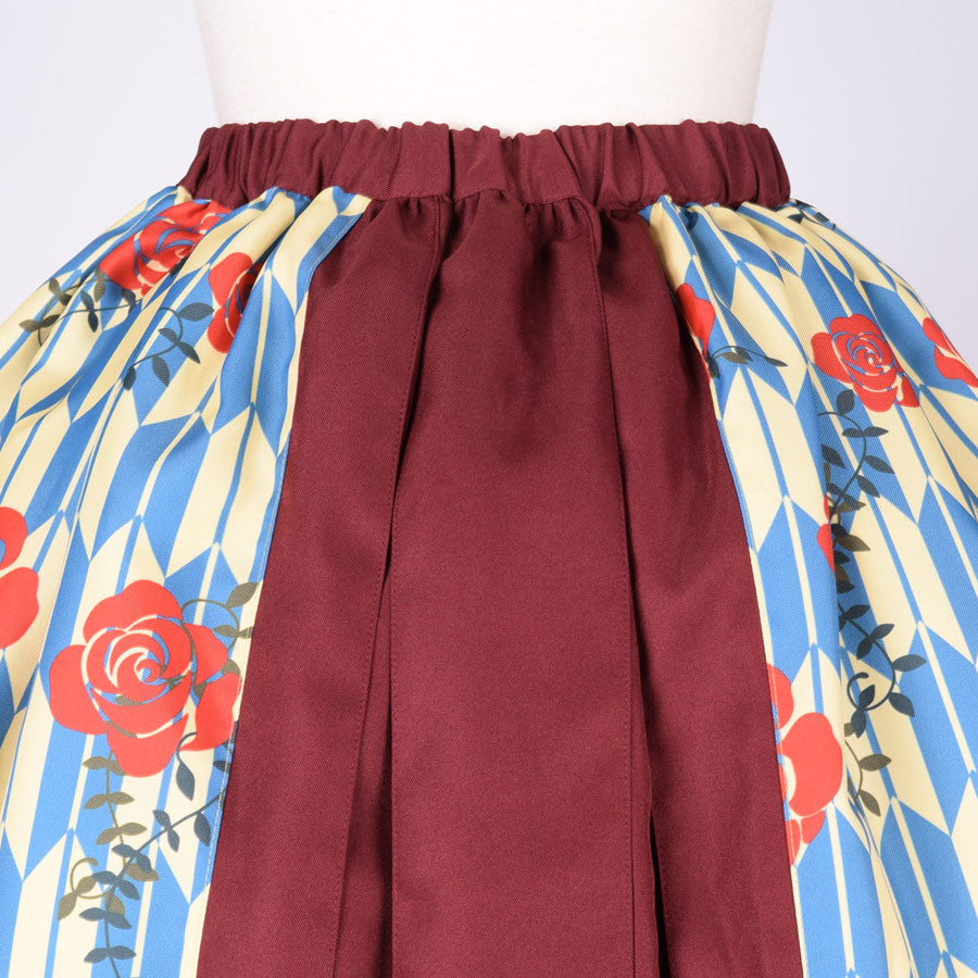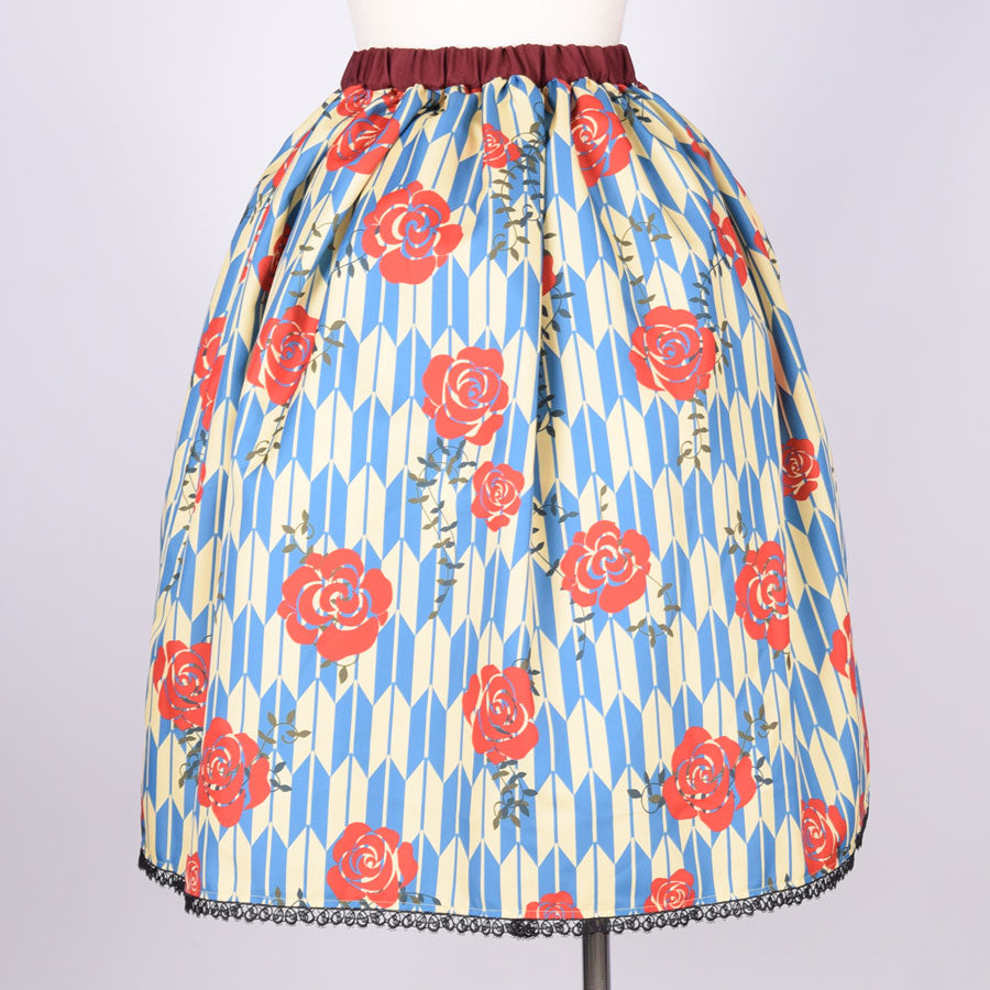 フロントにシャンタン生地のプリーツを使用し、モリグチカのテキスタイルと和のスタイリングをあわせたスカート。