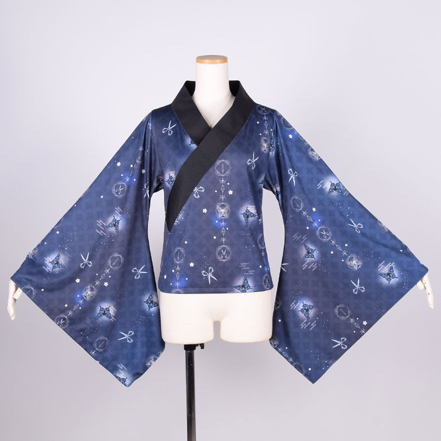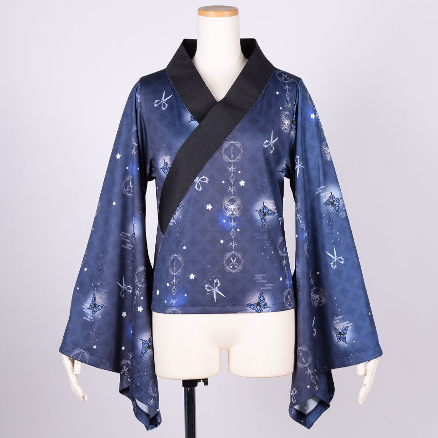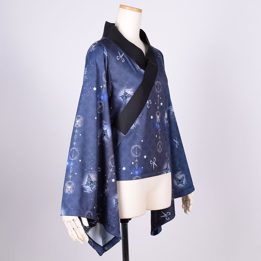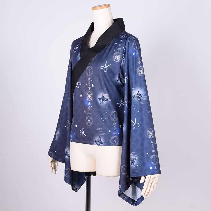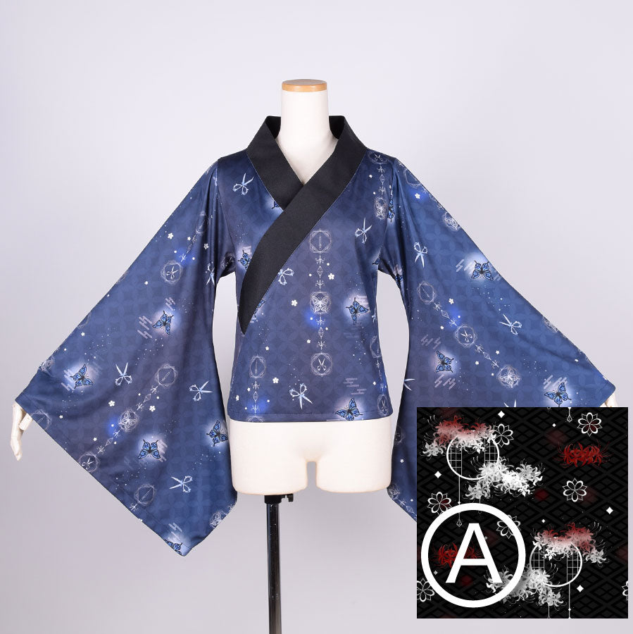 総柄の着物袖トップスで、伸縮性のある生地を使用しています。