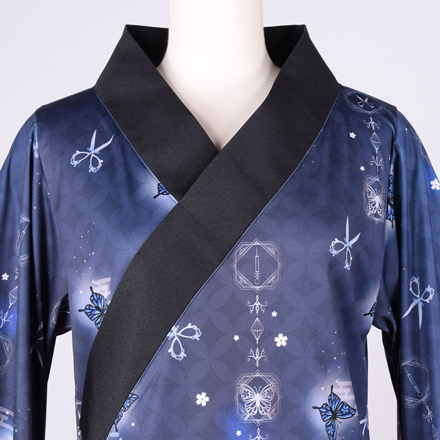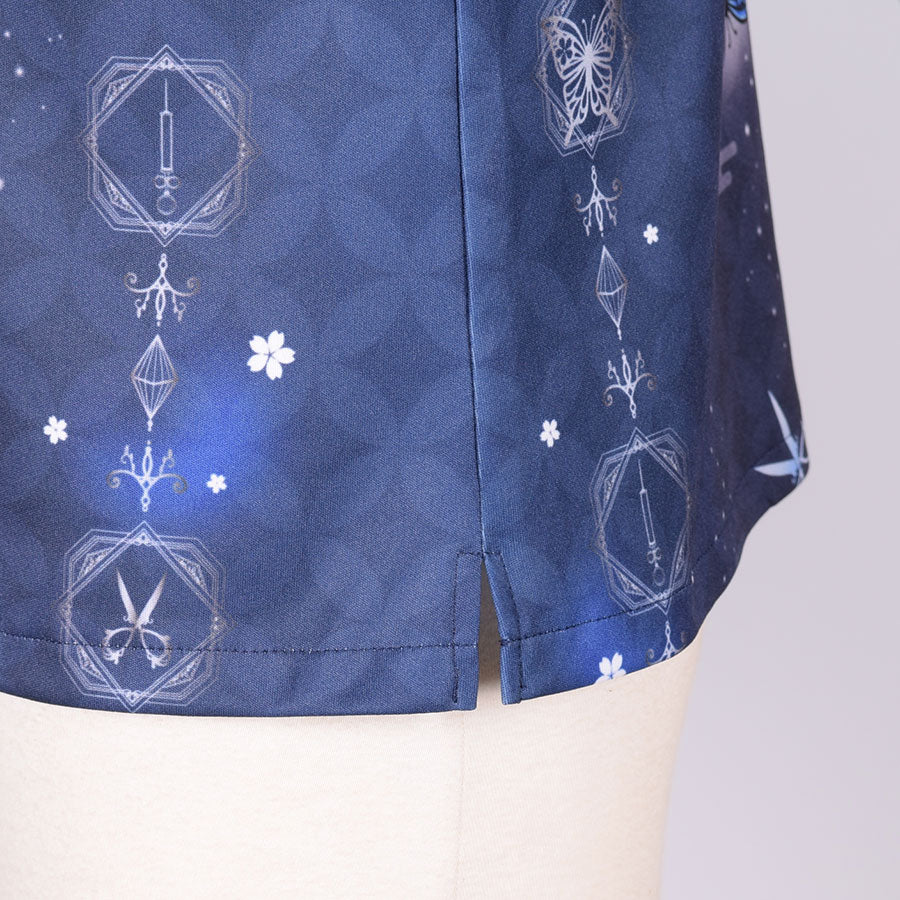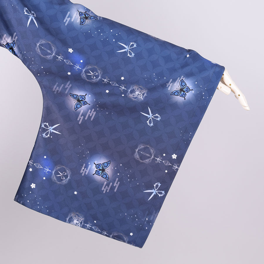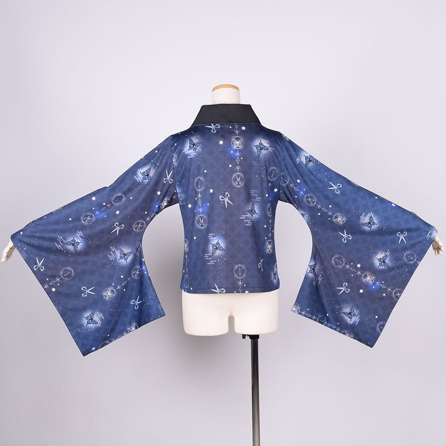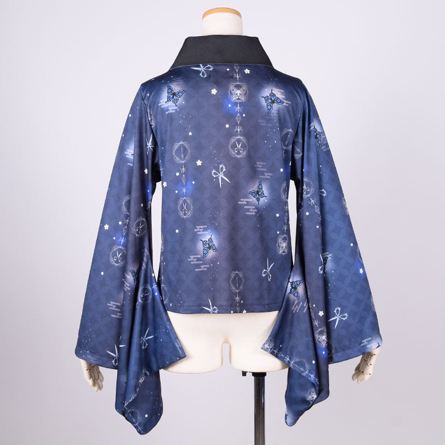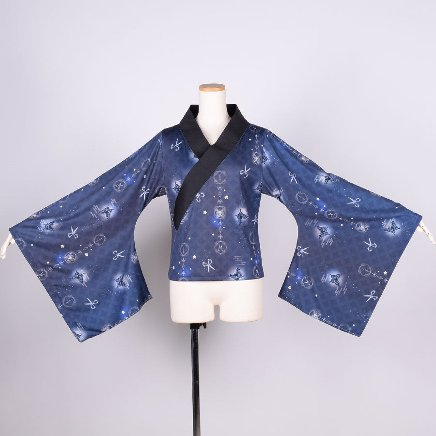 総柄の着物袖トップスで、伸縮性のある生地を使用しています。