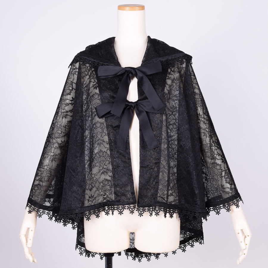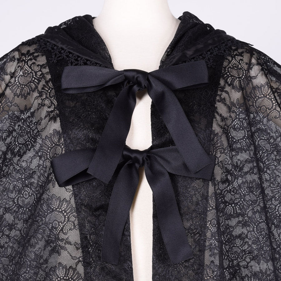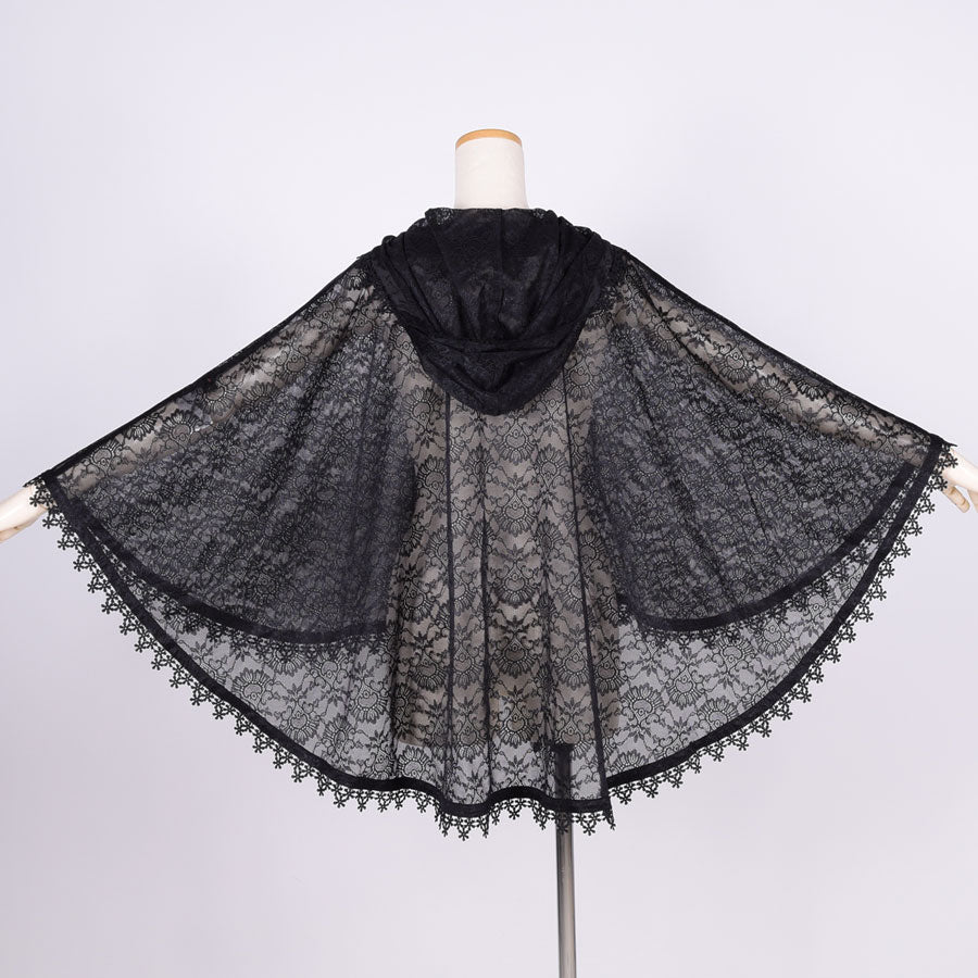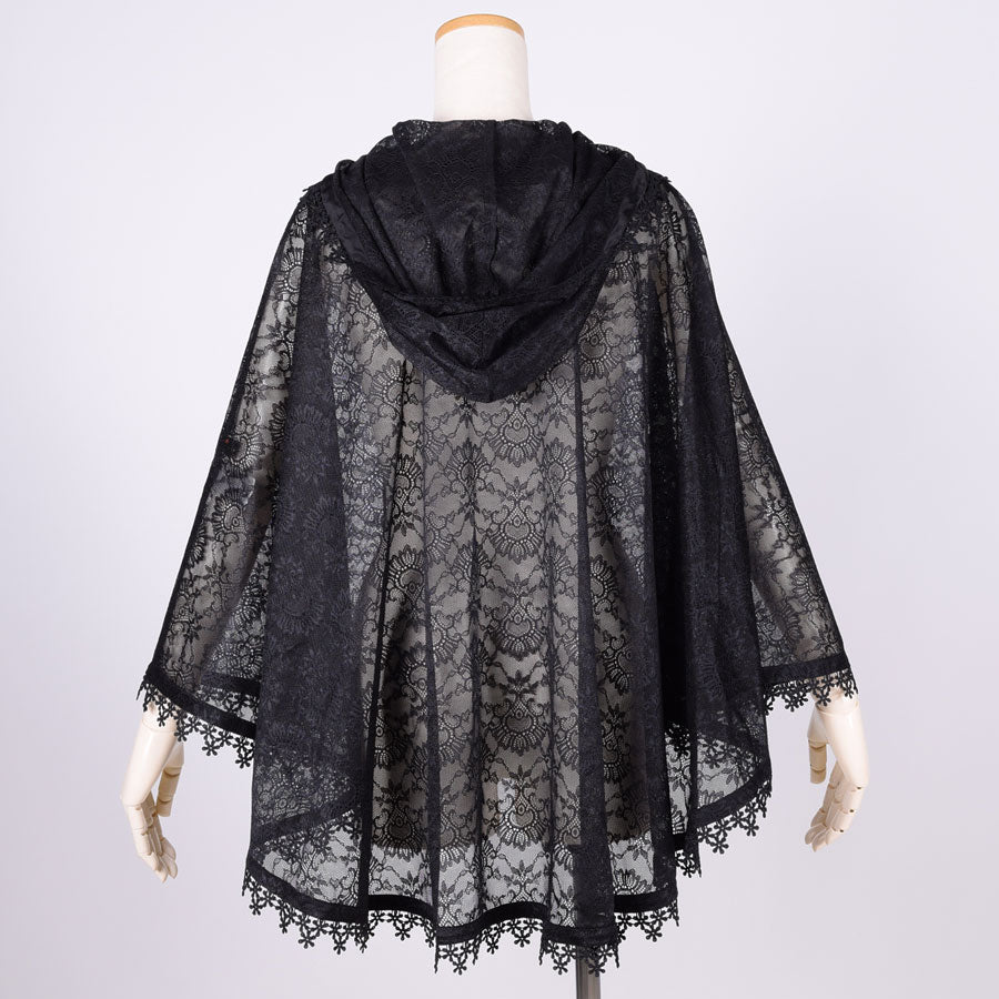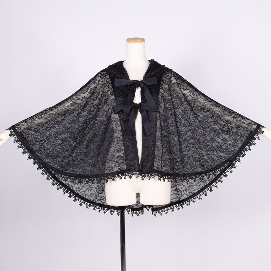 伸縮性のあるレース生地で仕立てた、フード付きのケープです。