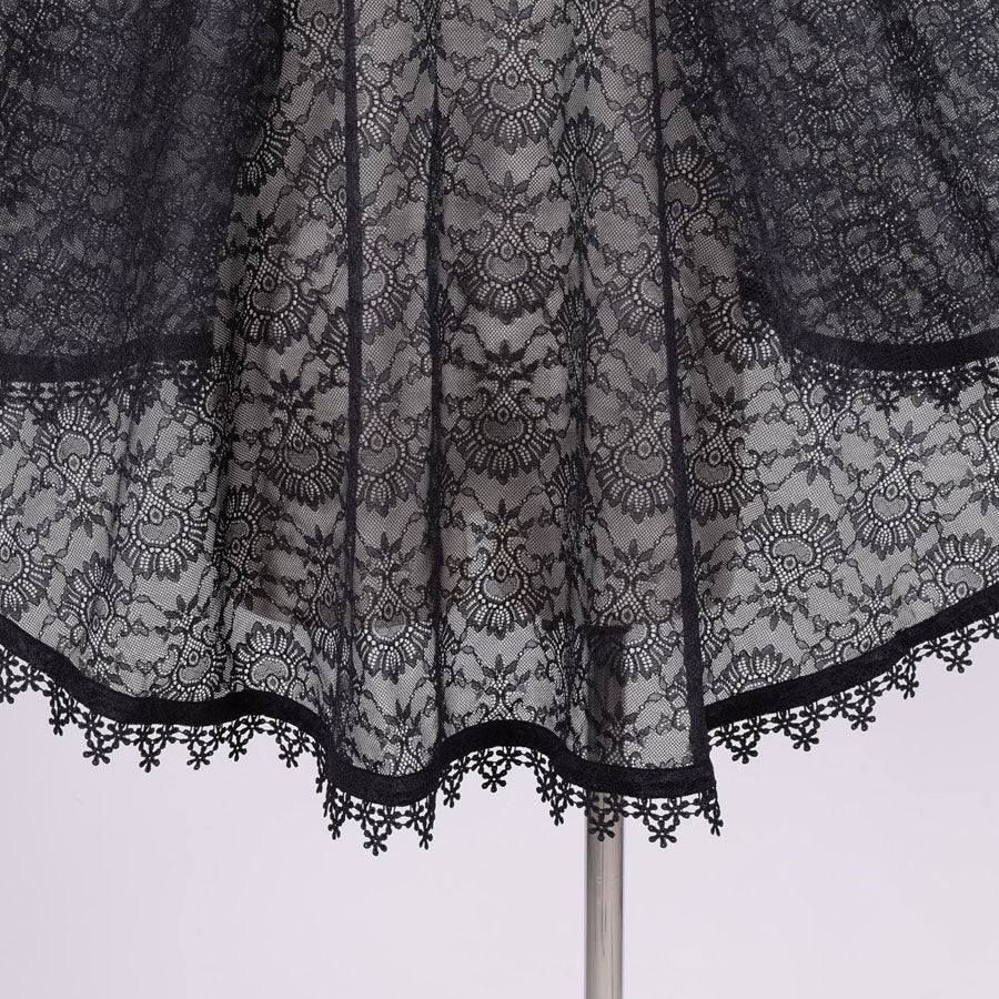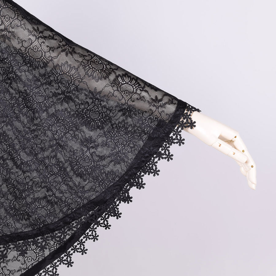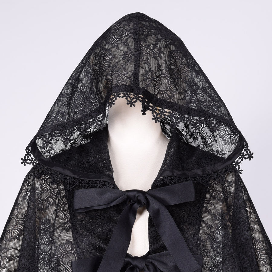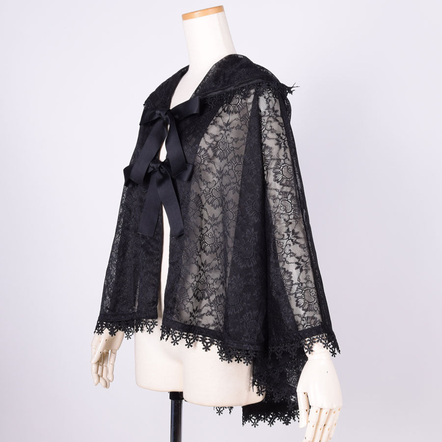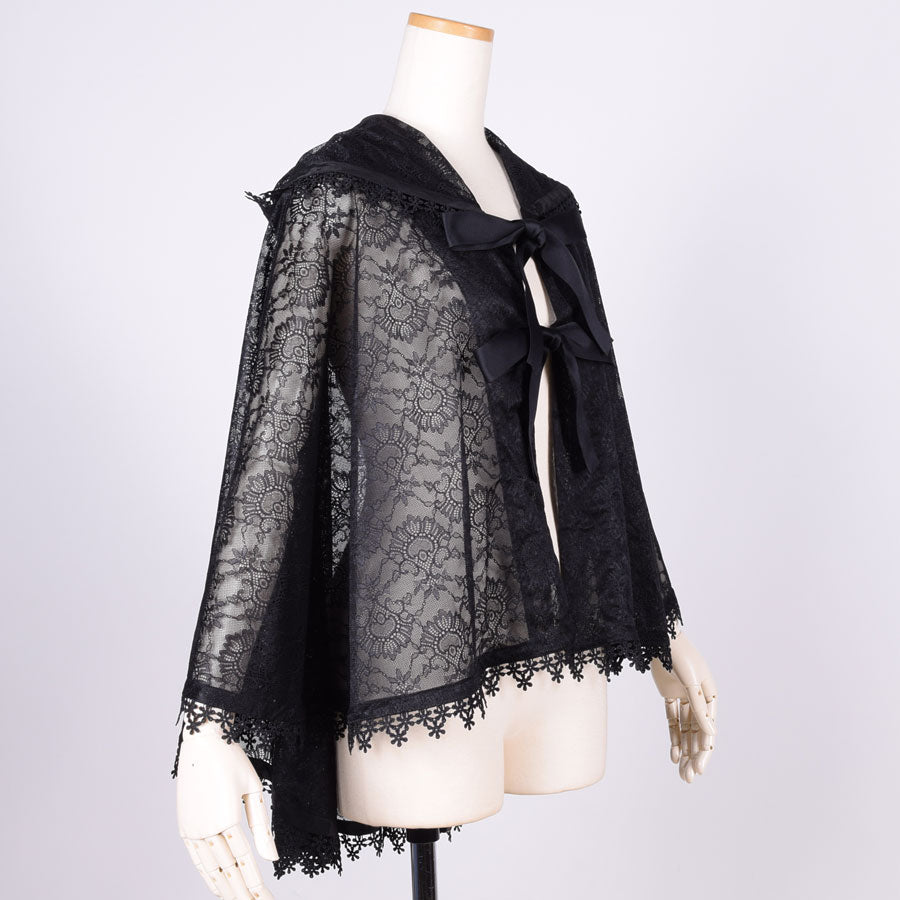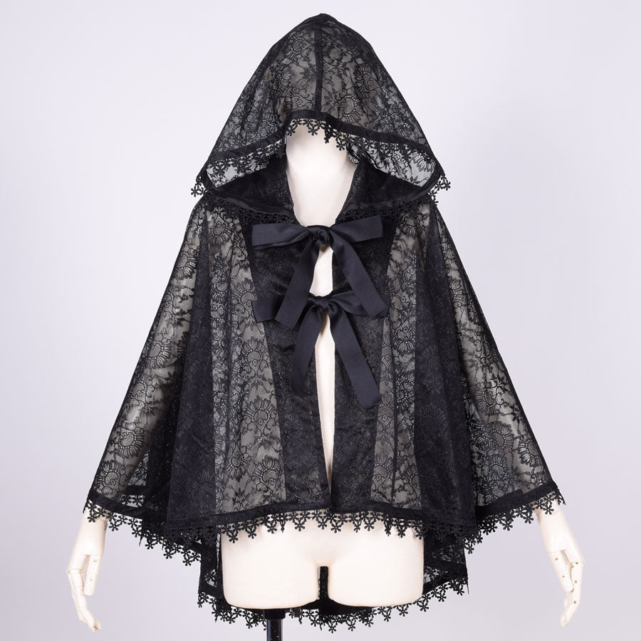 伸縮性のあるレース生地で仕立てた、フード付きのケープです。