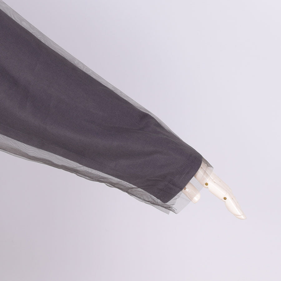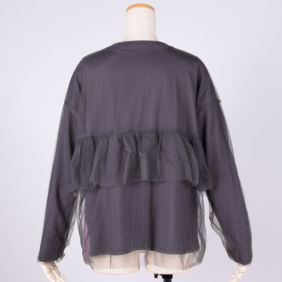 左側に流れるように竜巻桜の切り替えが入り、重ねたチュールでトーンが落ちたように見えるトップス。