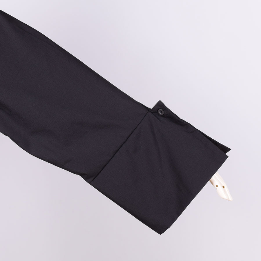 広い幅のカフスがポイントのスタンドカラーシャツ。