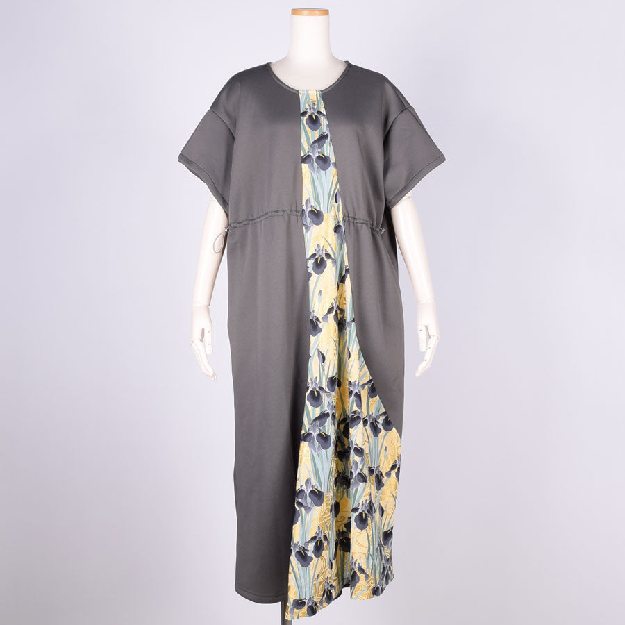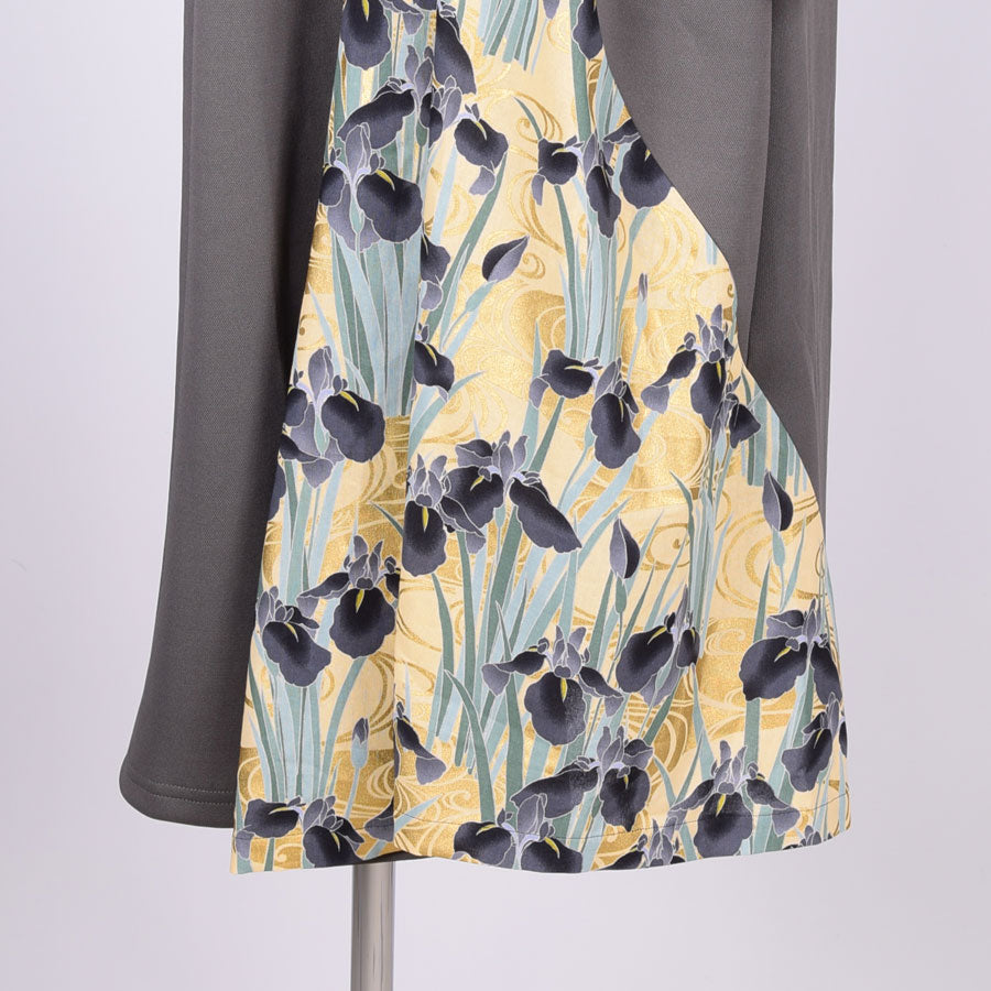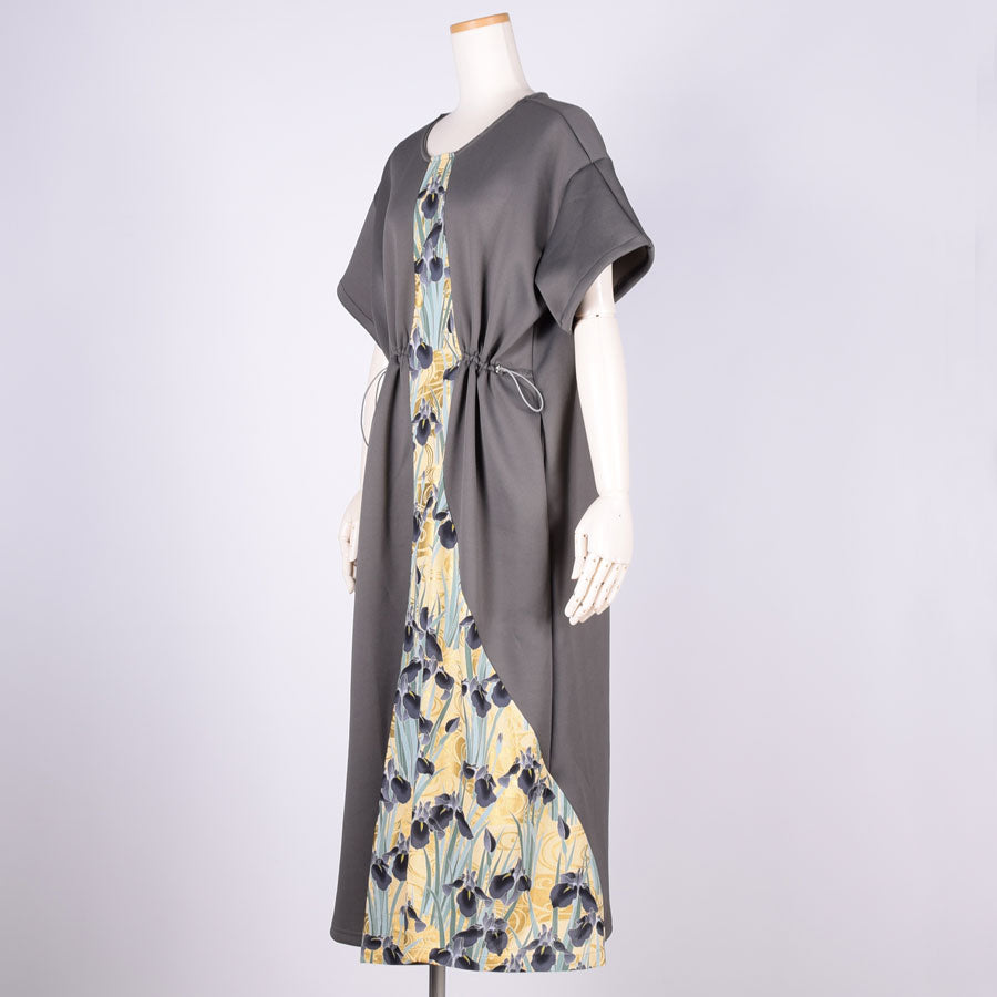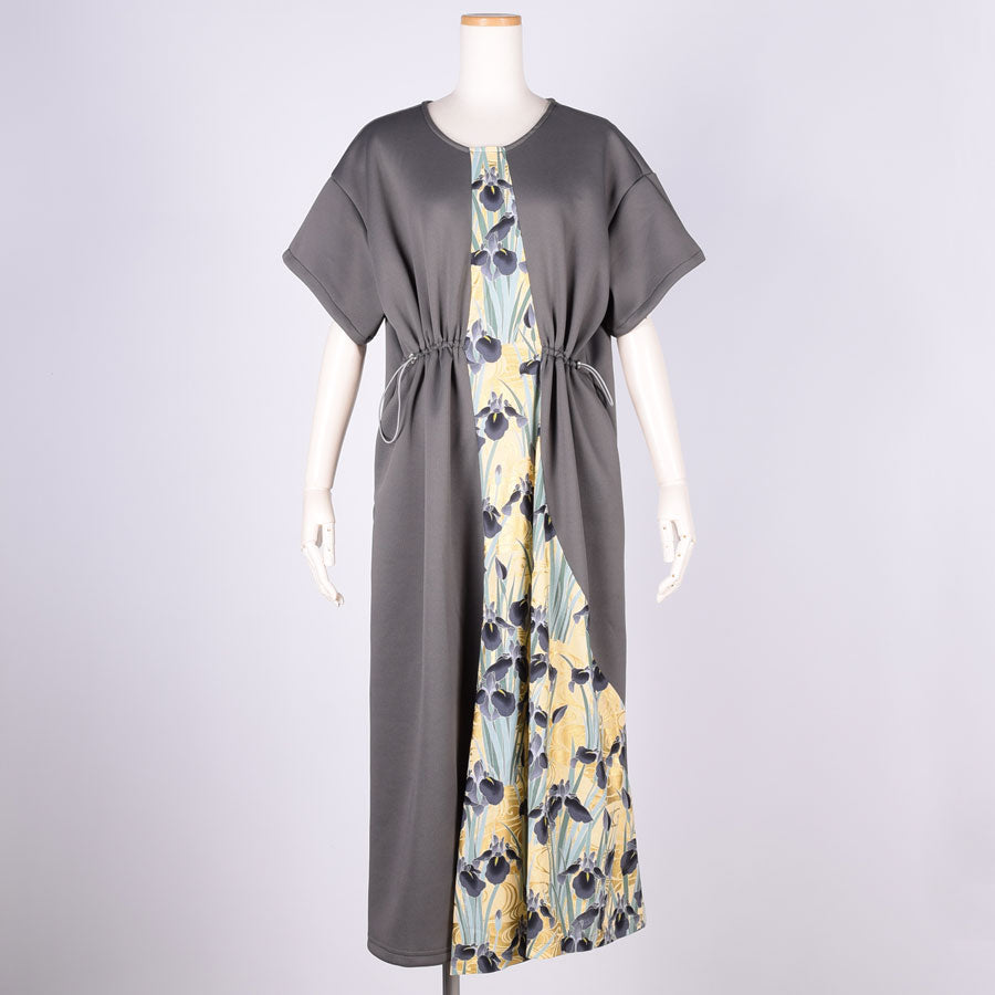前に流れる様に日本画のような菖蒲の和柄を切り替えたワンピース。