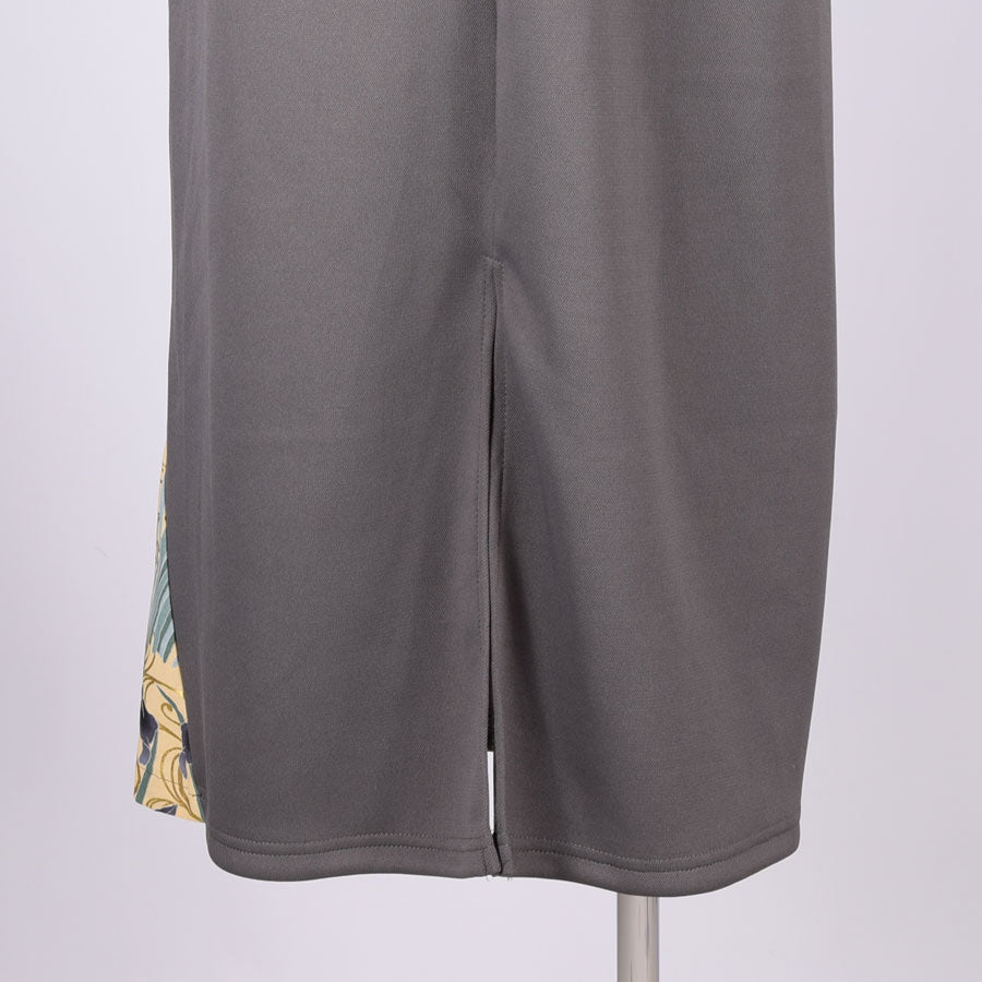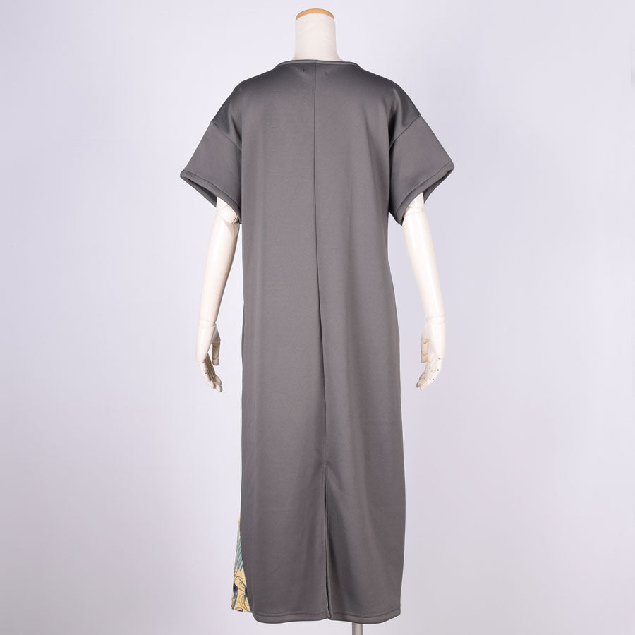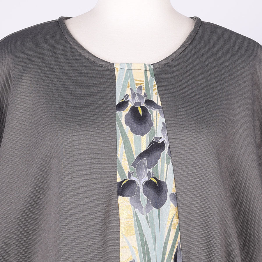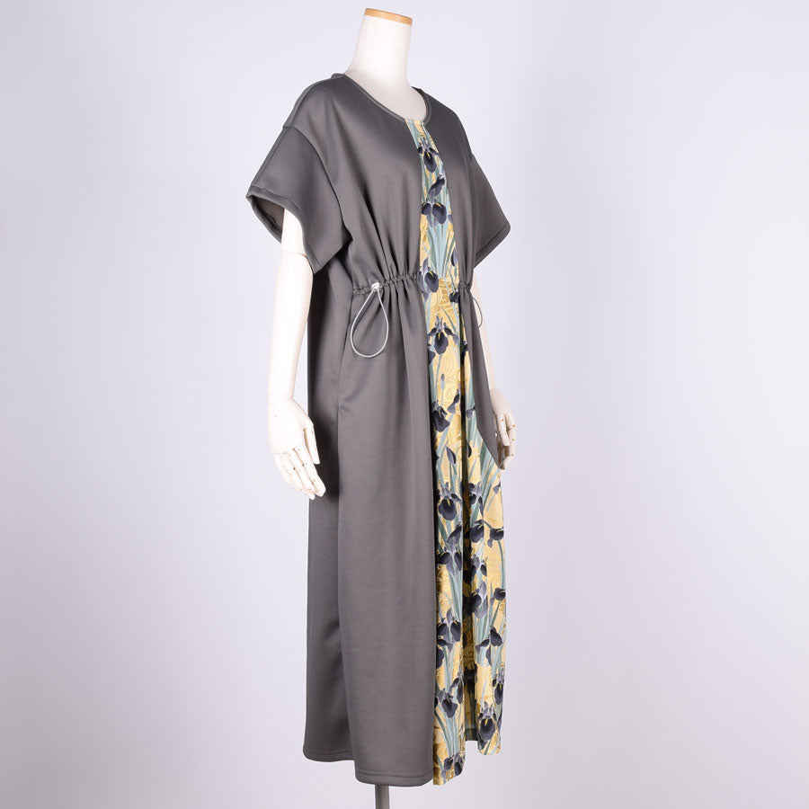 前に流れる様に日本画のような菖蒲の和柄を切り替えたワンピース。