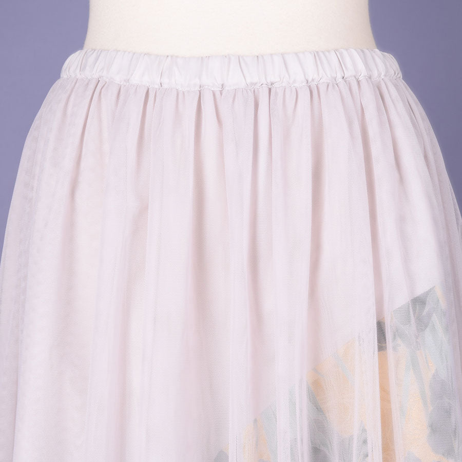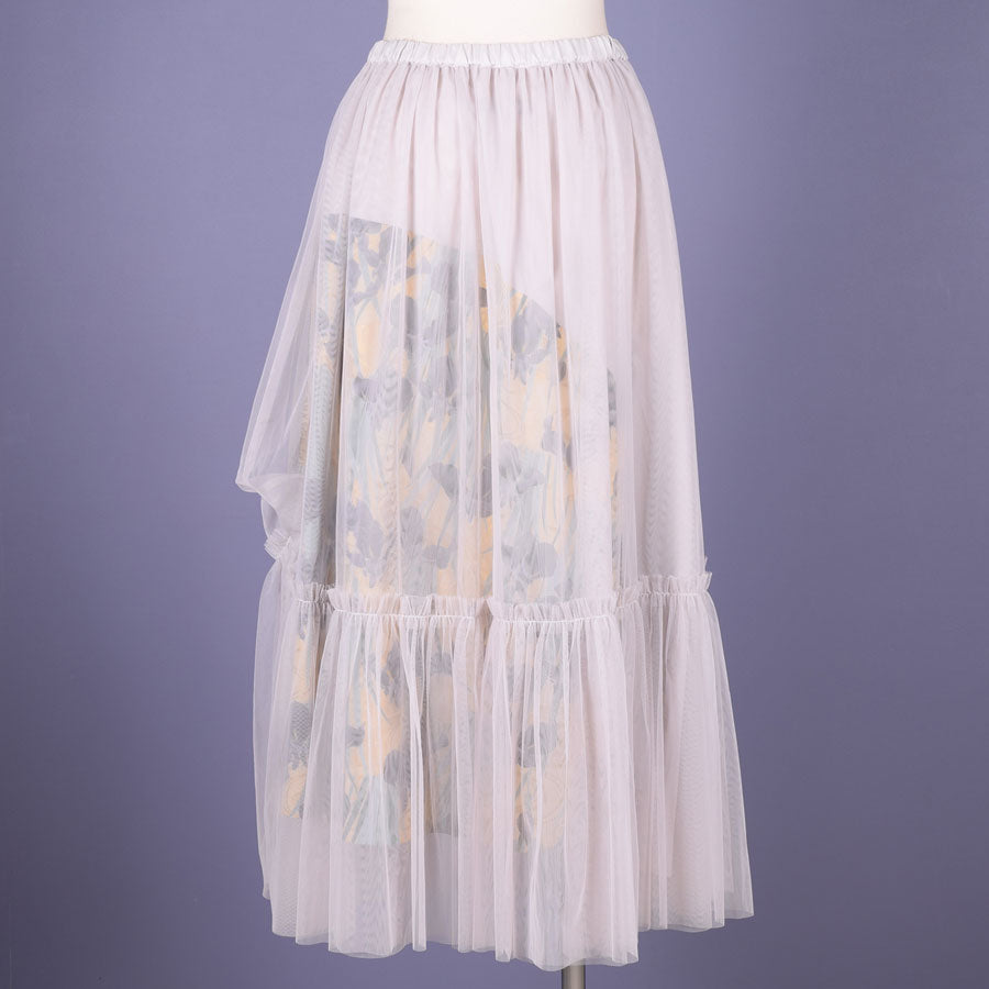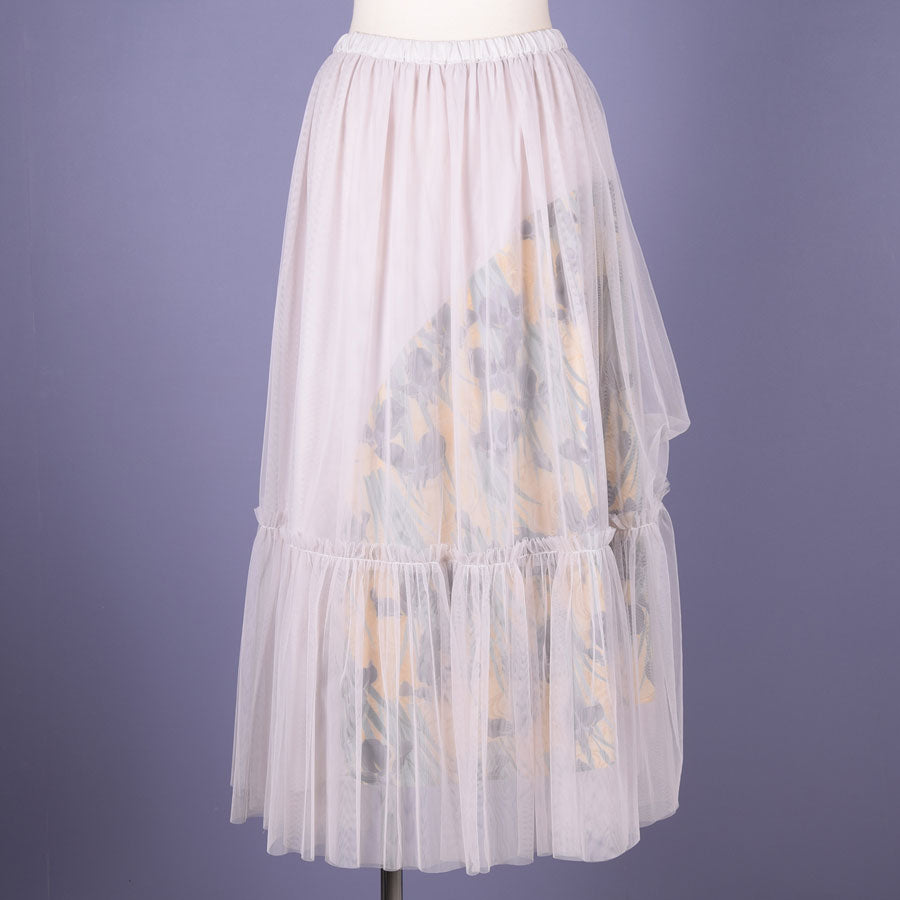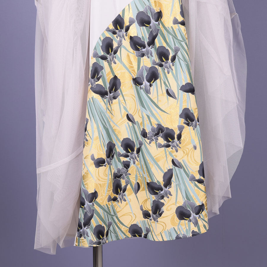 日本画のような菖蒲の和柄を斜めに丸っぽく切り替えた裏地のチュールスカート。