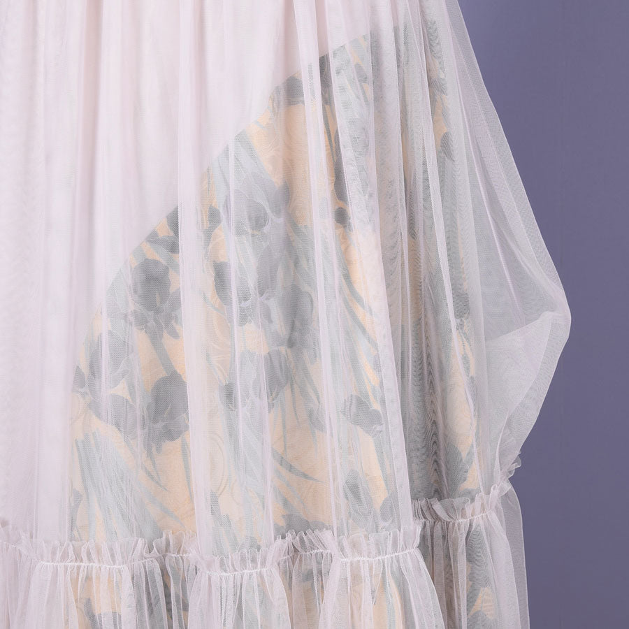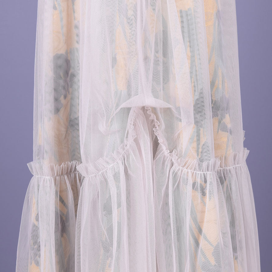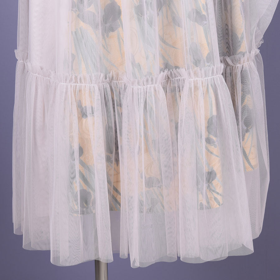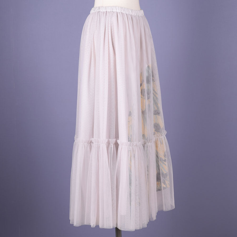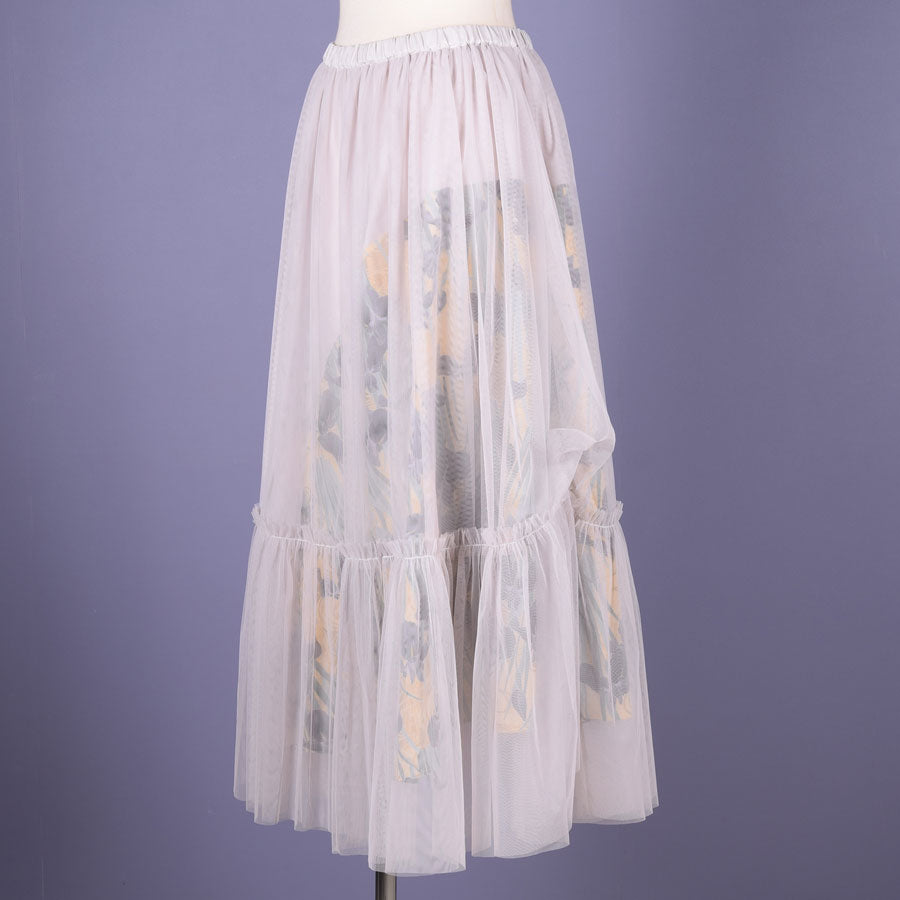 日本画のような菖蒲の和柄を斜めに丸っぽく切り替えた裏地のチュールスカート。