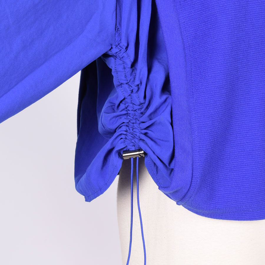 両脇を紐で引っ張り上げてくしゃくしゃとするようなデザインのトップス。