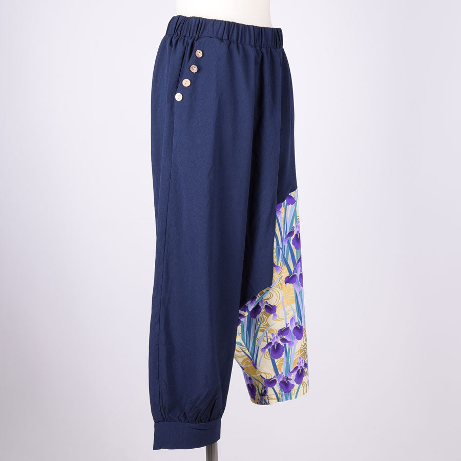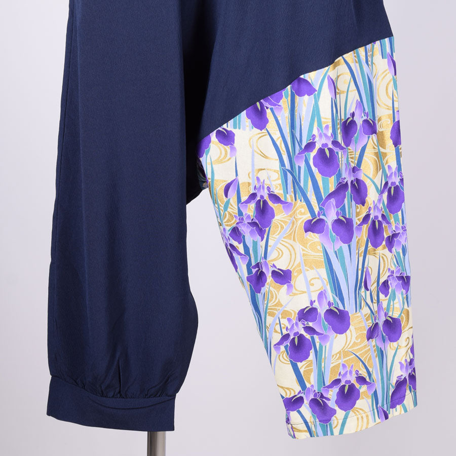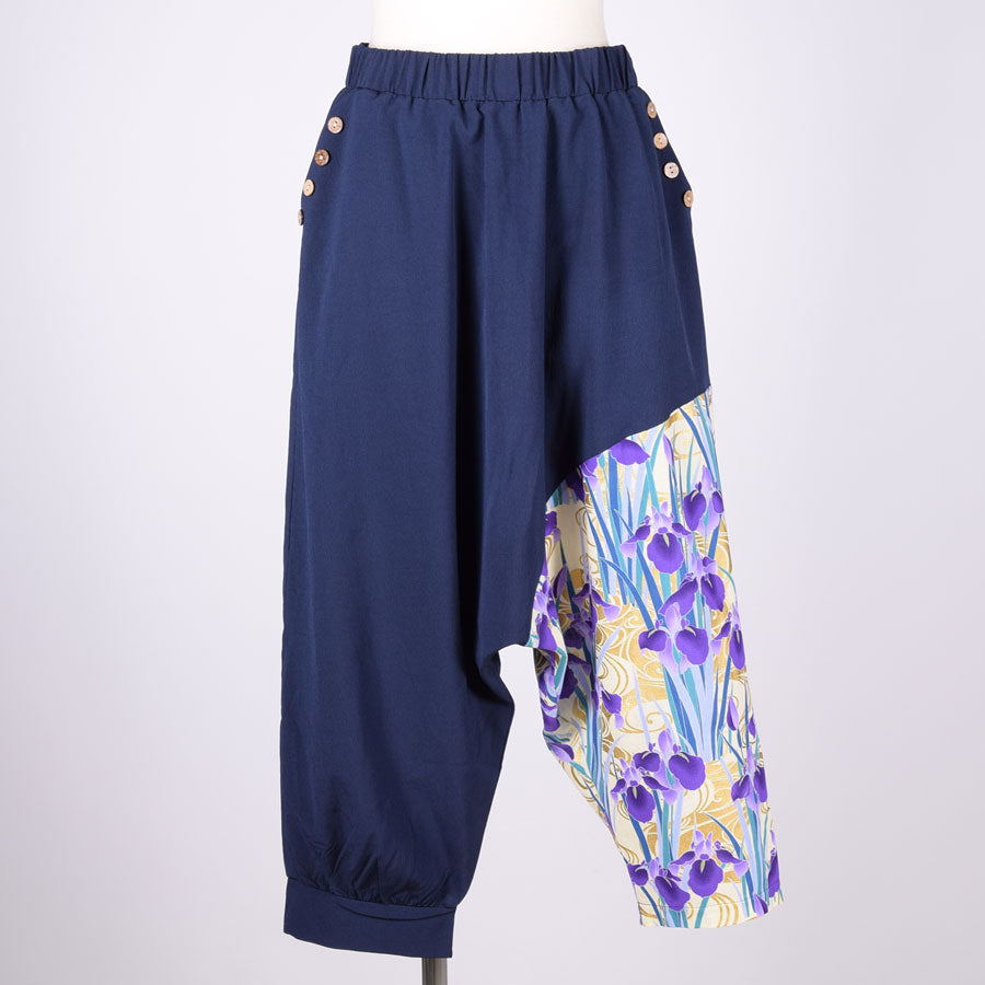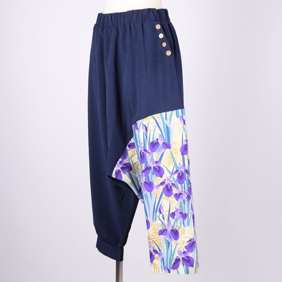 左足を日本画のような菖蒲の和柄で切り替えたサルエルパンツ。