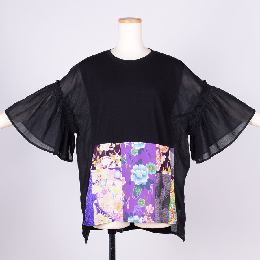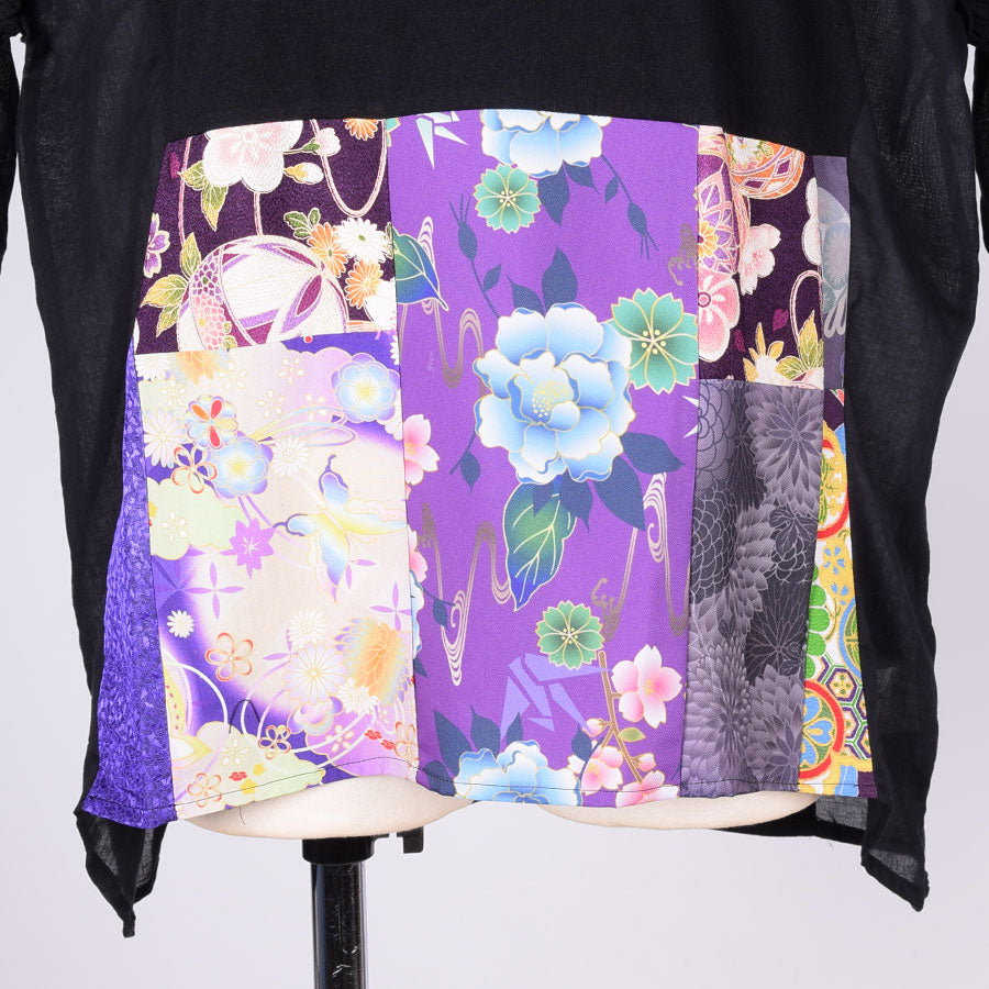 紫系の色々な和柄をはぎ合わせた生地を前見頃の裾に切り替えたトップス。
