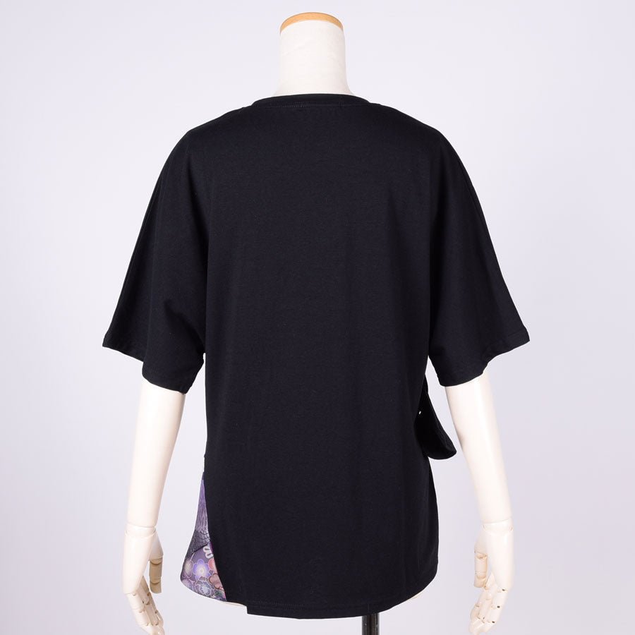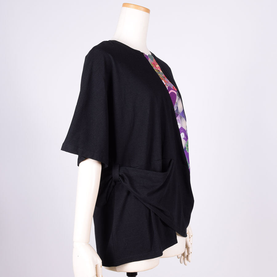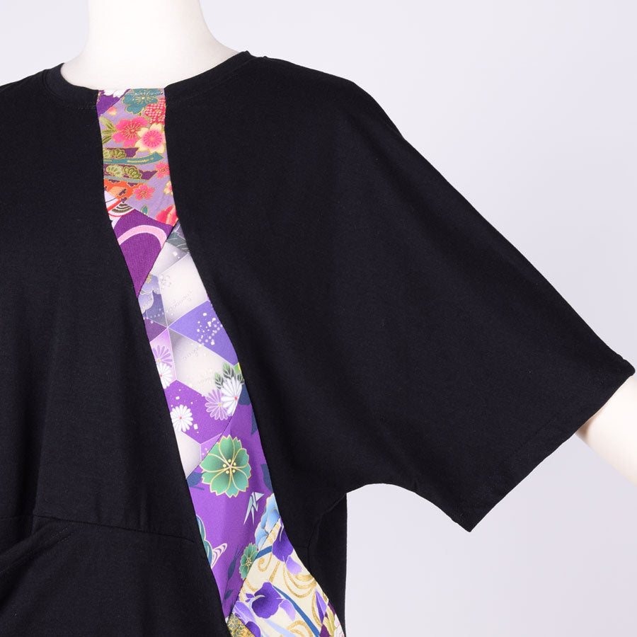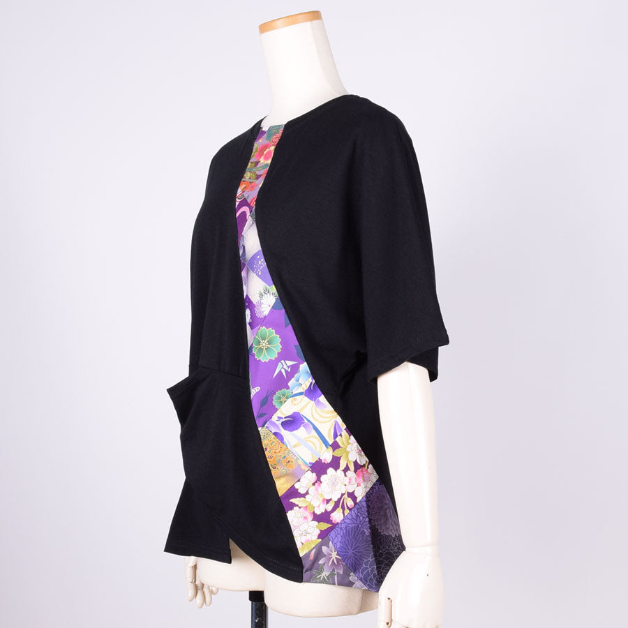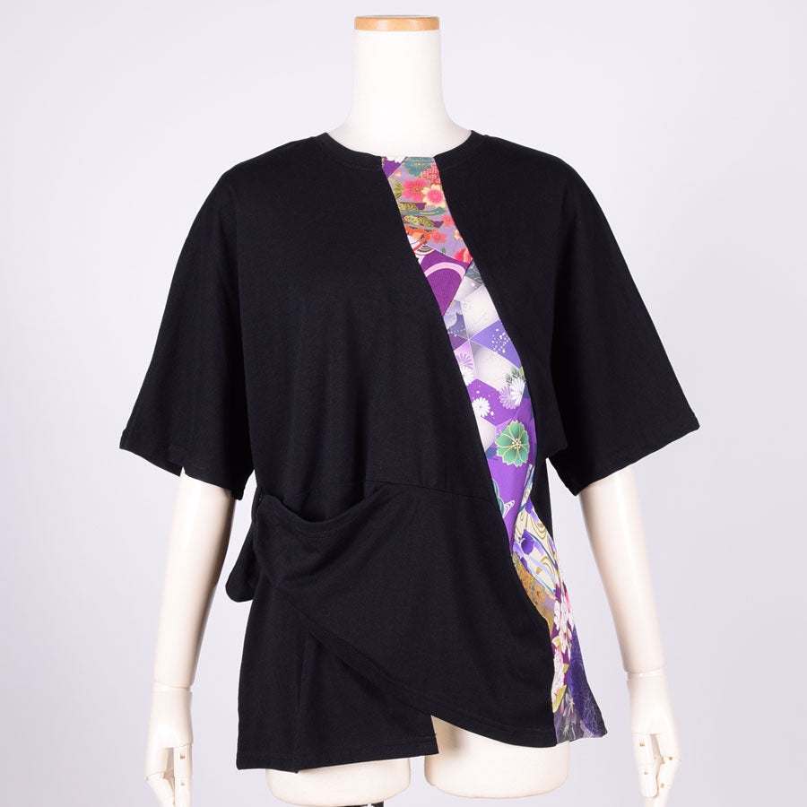 紫系の色々な和柄をはぎ合わせた生地を左側に切り替えたトップス。
