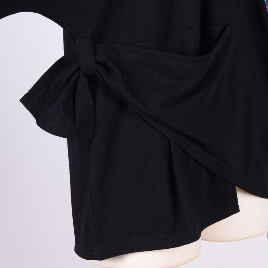 前の縫い目を途中で止めていてその部分を紐で縛って形を色々と遊べる様なデザインにしています。
