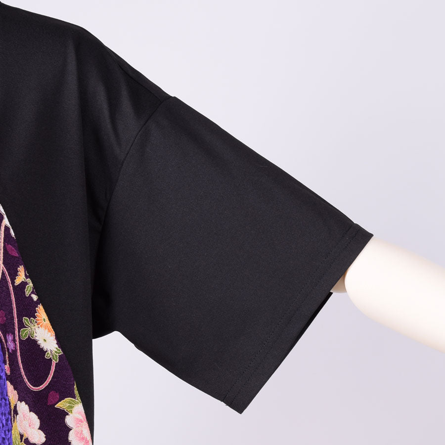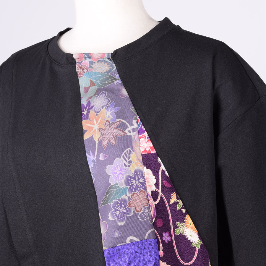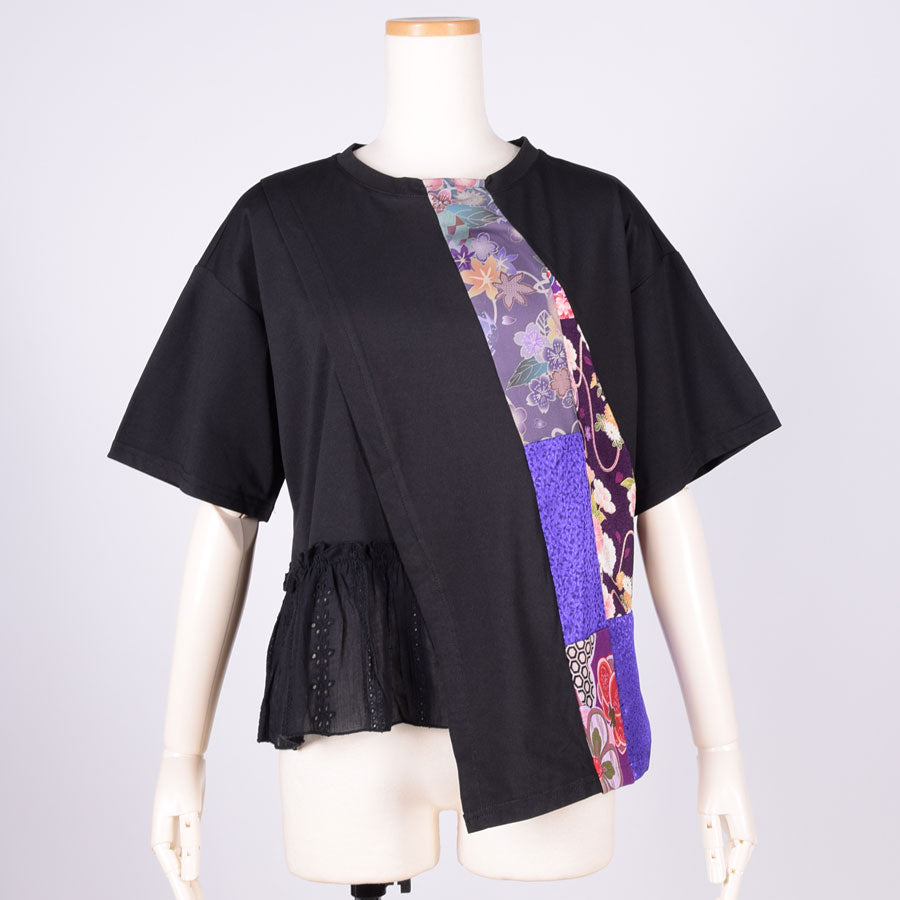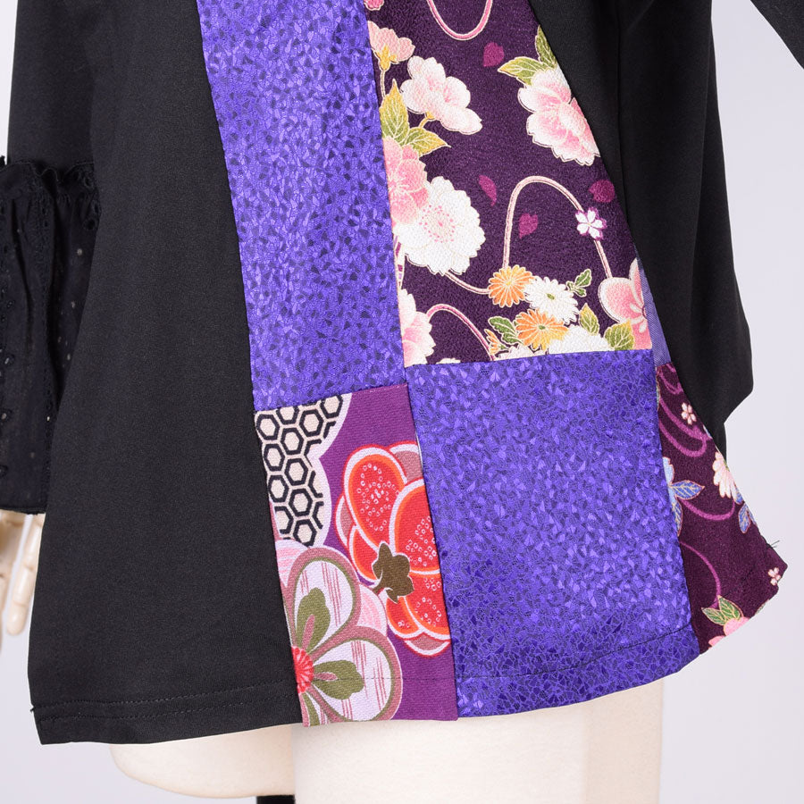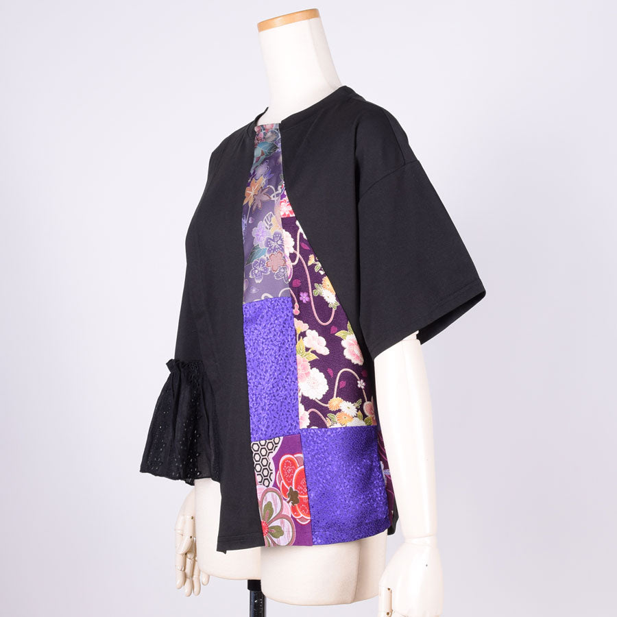 紫系の色々な和柄をはぎ合わせた生地を左側に切り替えたトップス。