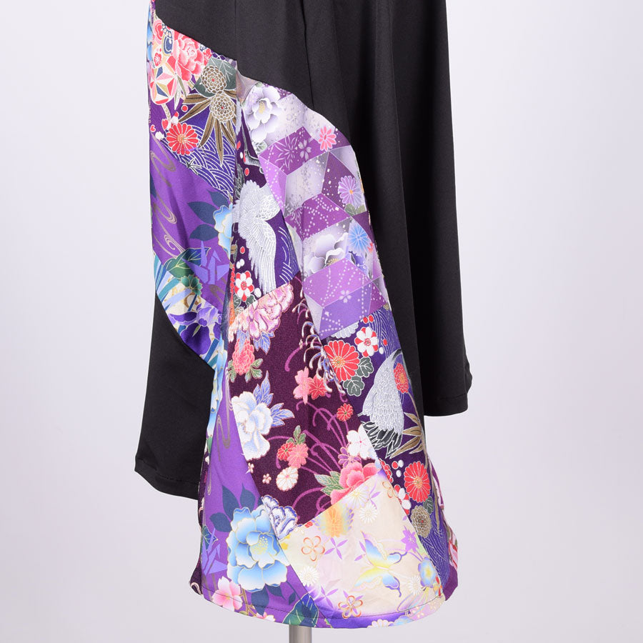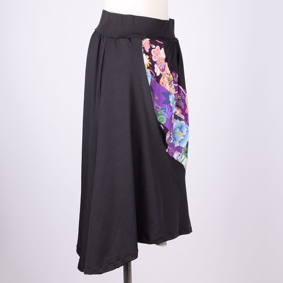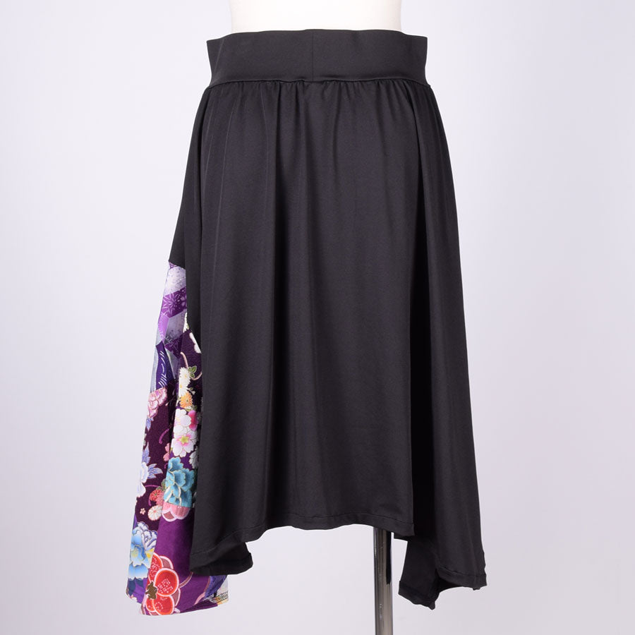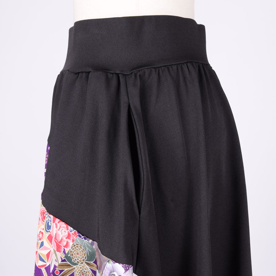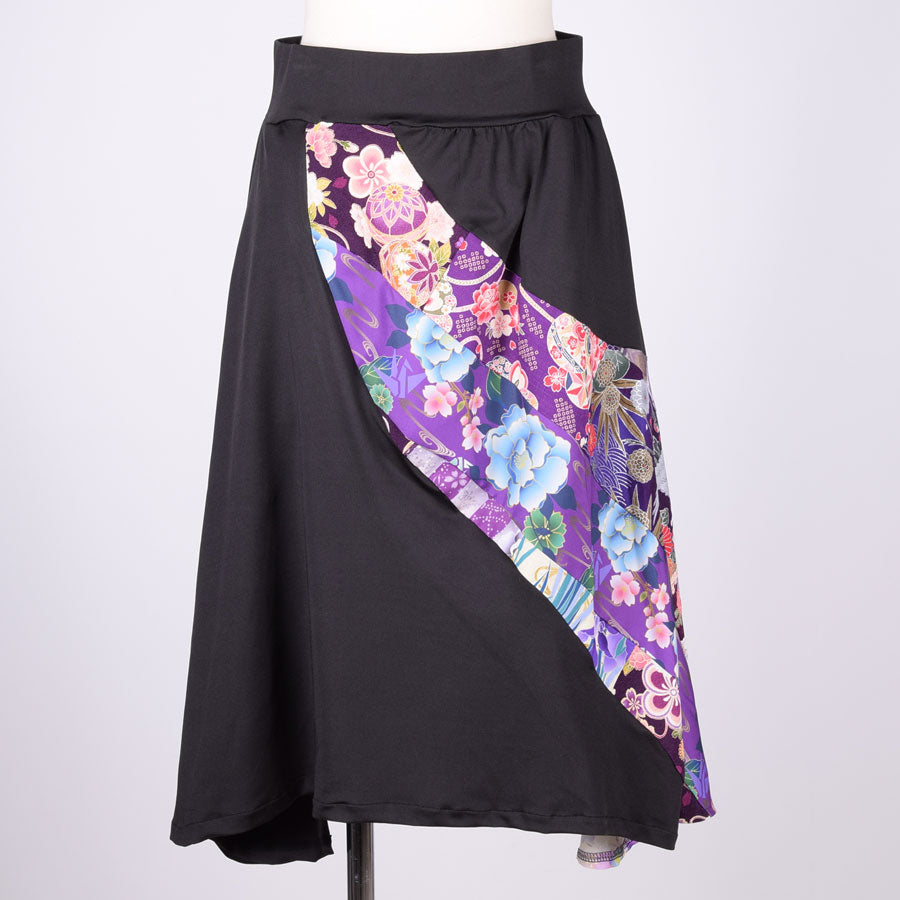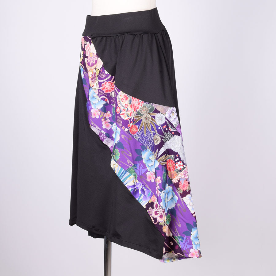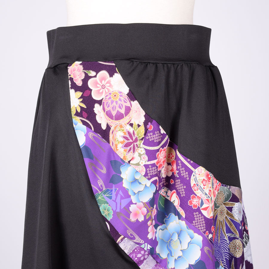 紫系の色々な和柄をはぎ合わせた生地を斜めに切り替えたスカート。