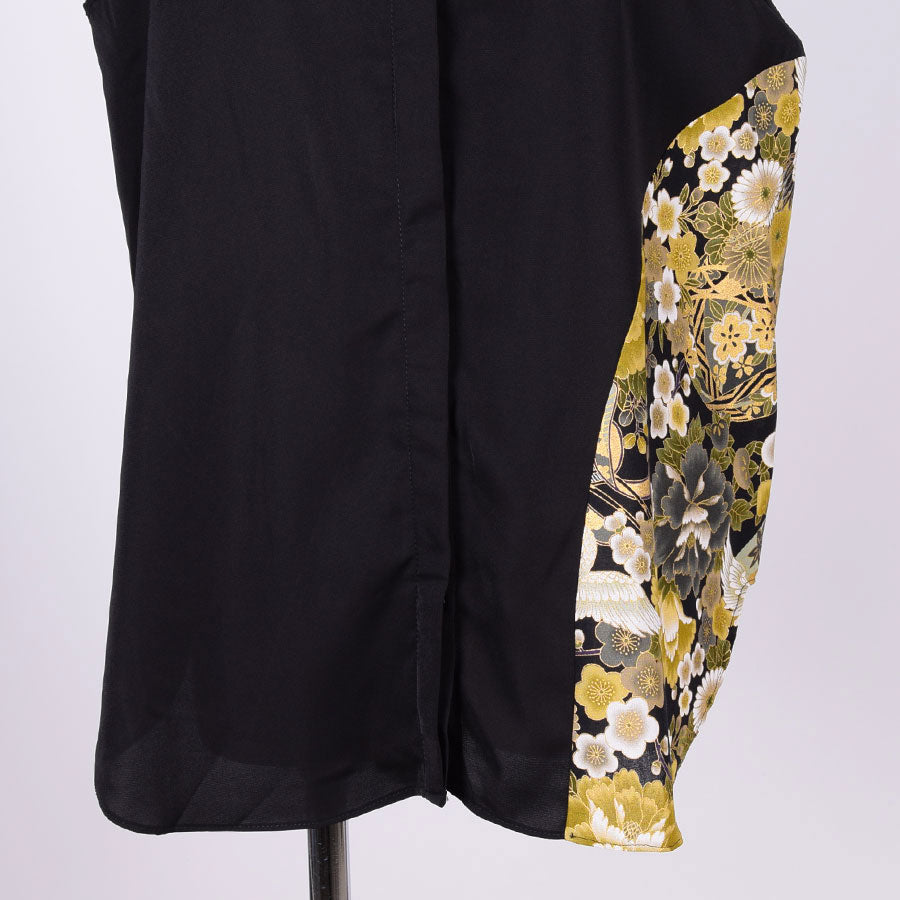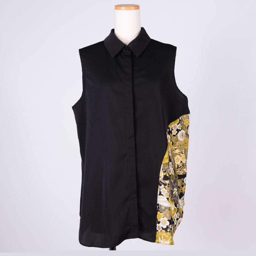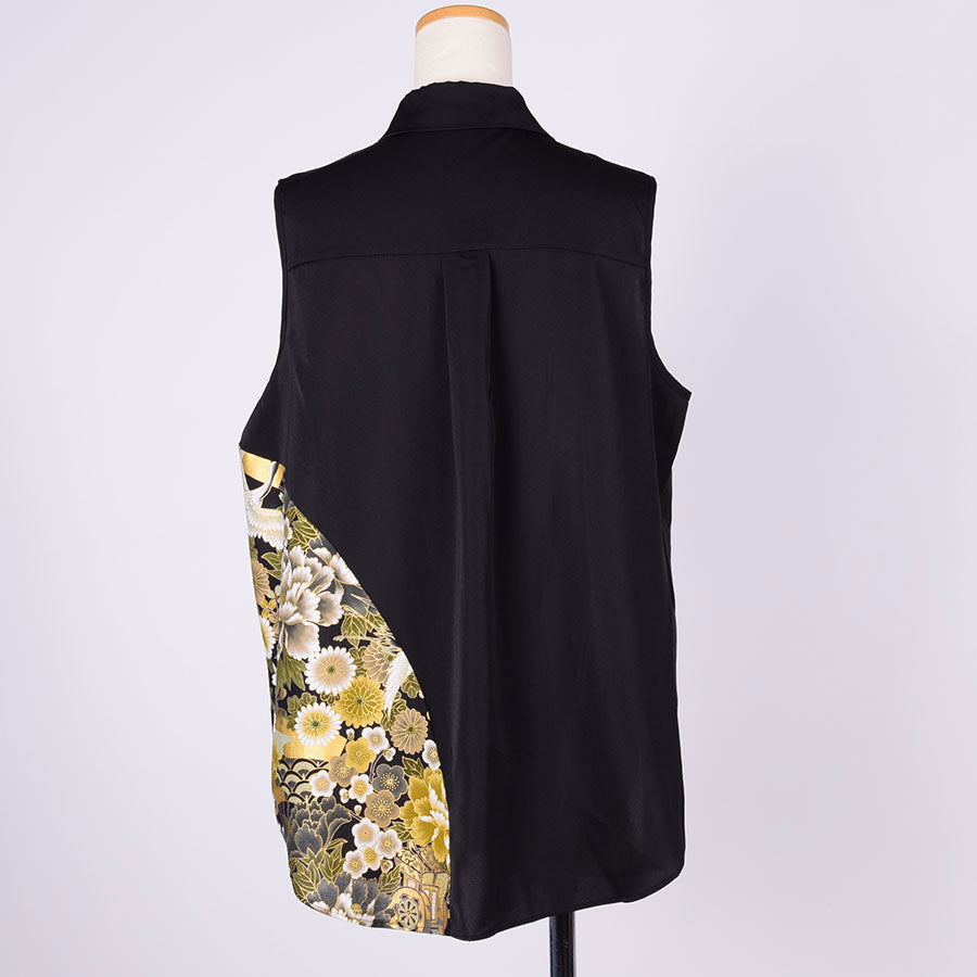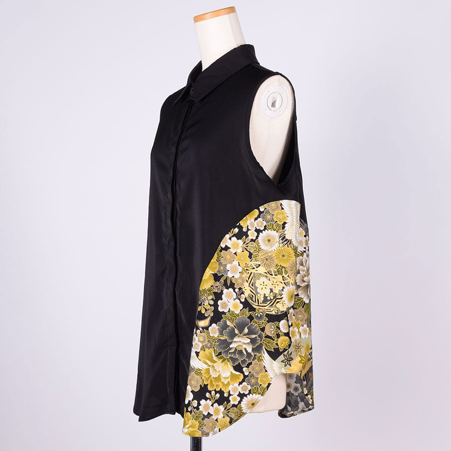 左脇にぐるっと曲線で黒地に鶴、牡丹、菊、桜、梅、扇などの吉祥文様が入った和柄を切り替えたノースリーブのシャツ。