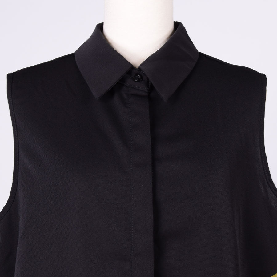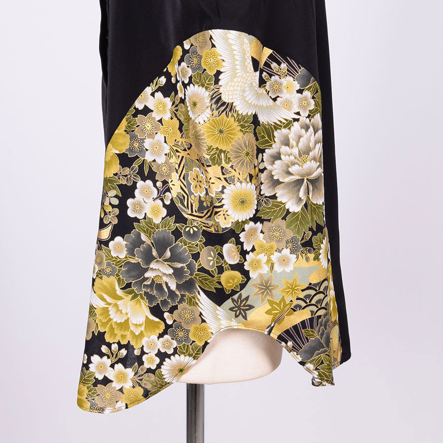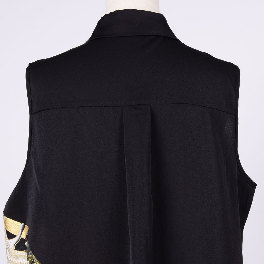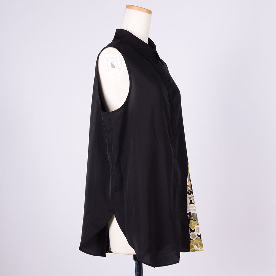 左脇にぐるっと曲線で黒地に鶴、牡丹、菊、桜、梅、扇などの吉祥文様が入った和柄を切り替えたノースリーブのシャツ。