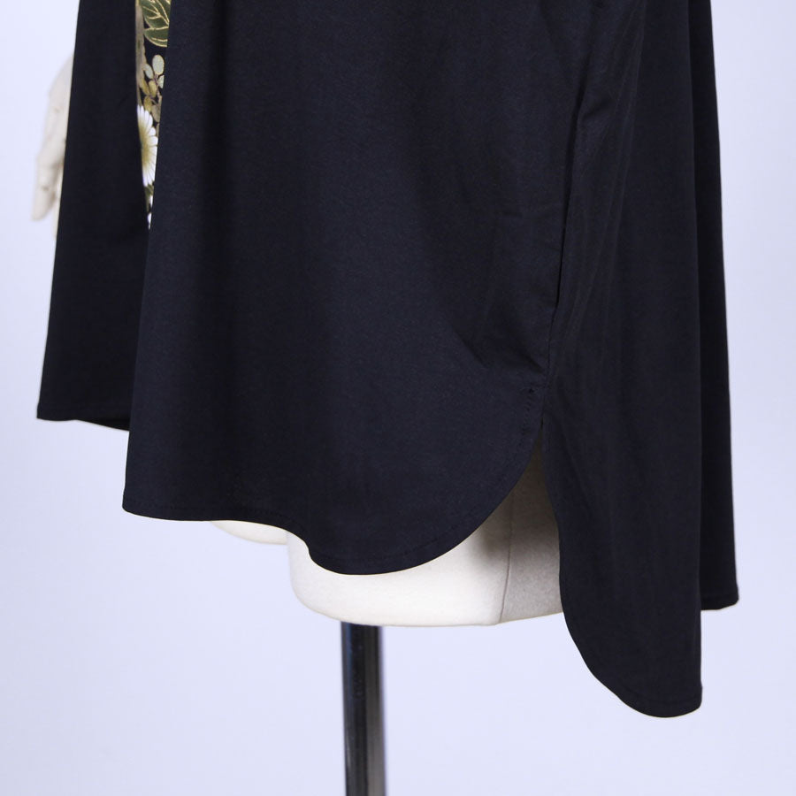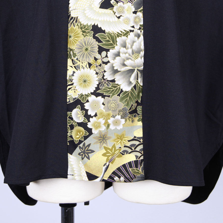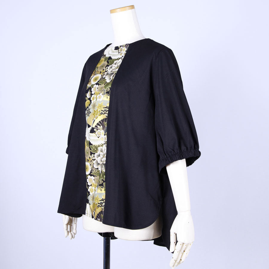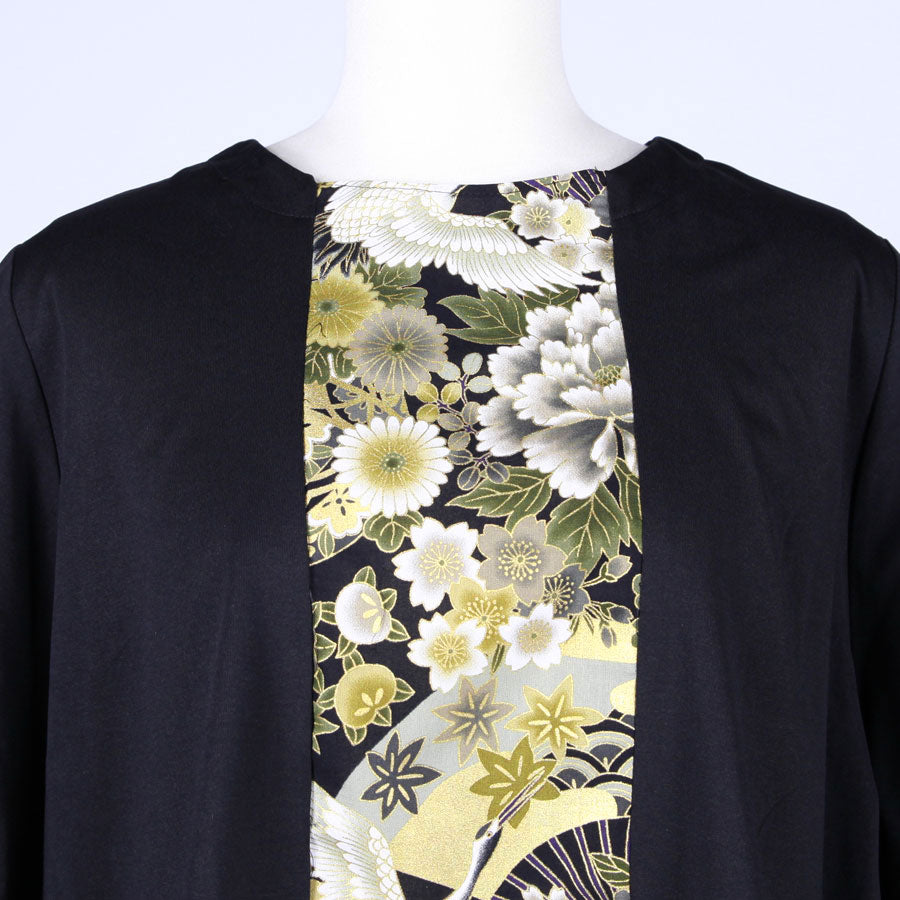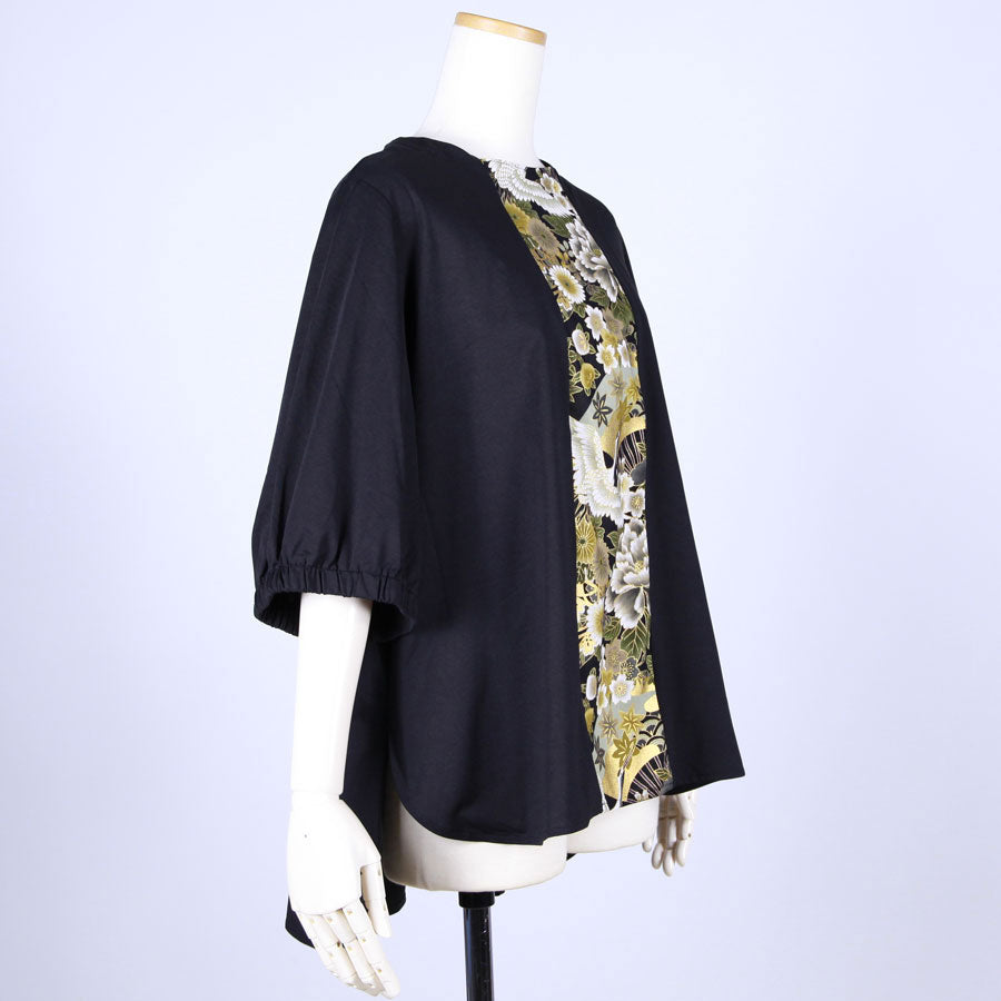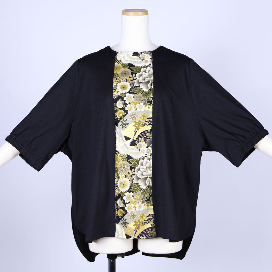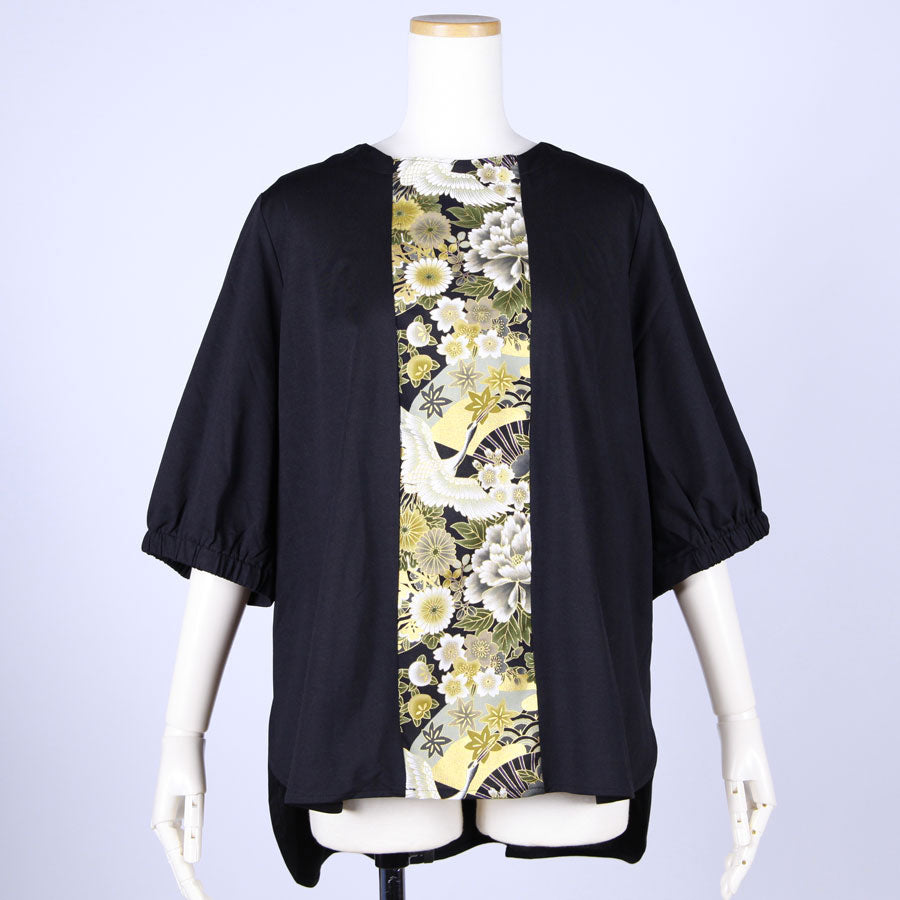前見頃に真っ直ぐ黒地に鶴、牡丹、菊、桜、梅、扇などの吉祥文様が入った和柄を切り替えたトップス。