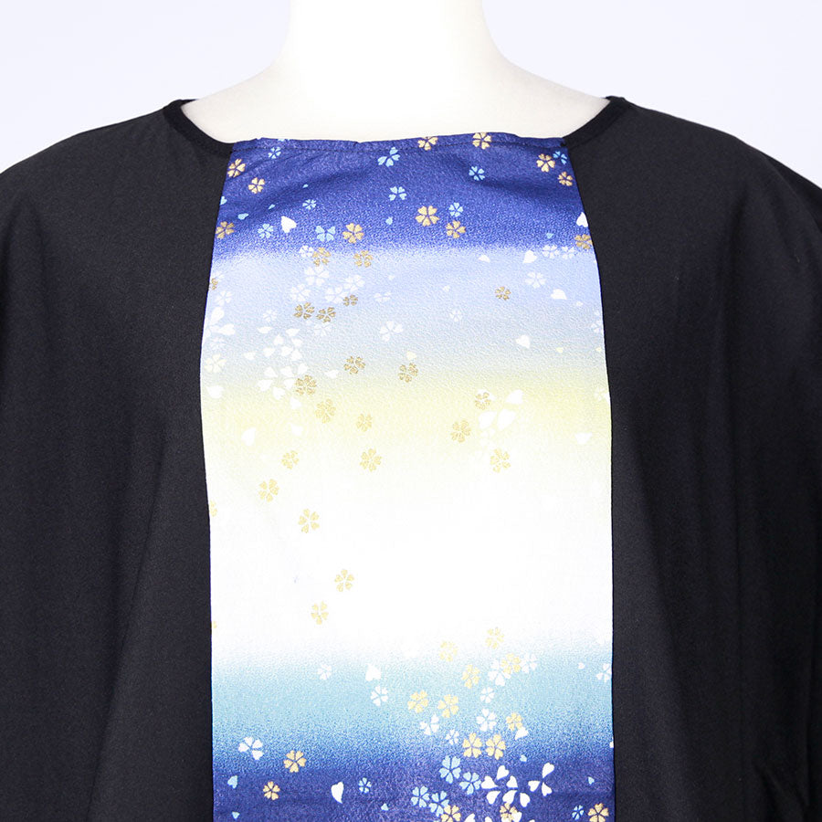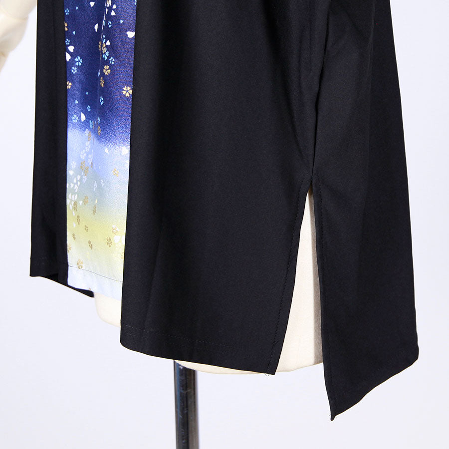 前見頃には真っ直ぐに白から青色にグラデーション染めしたような土台に小さな桜が飛んでいる和柄を切り替えてあります。