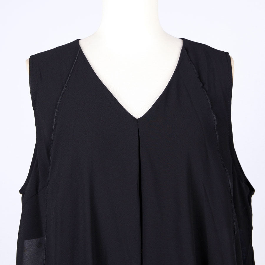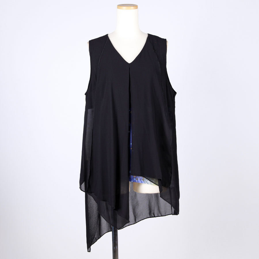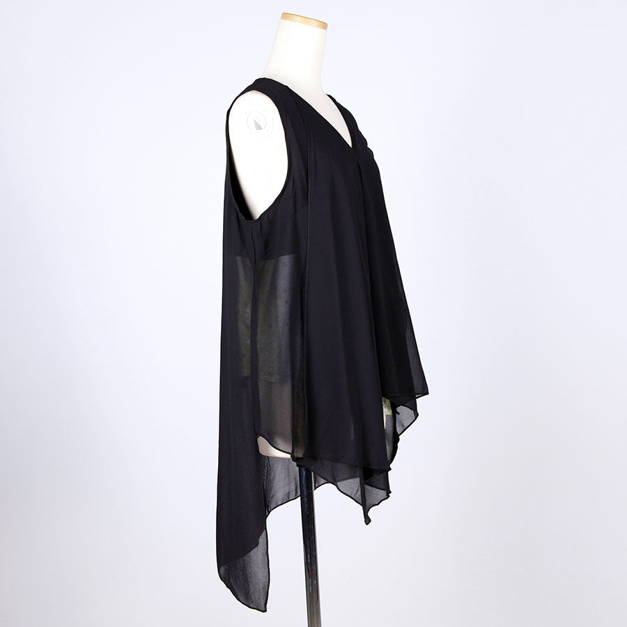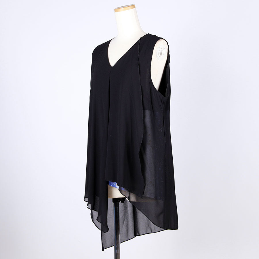 前身上を中心で両開きにし、タックにしたアシンメトリーヘムラインです。