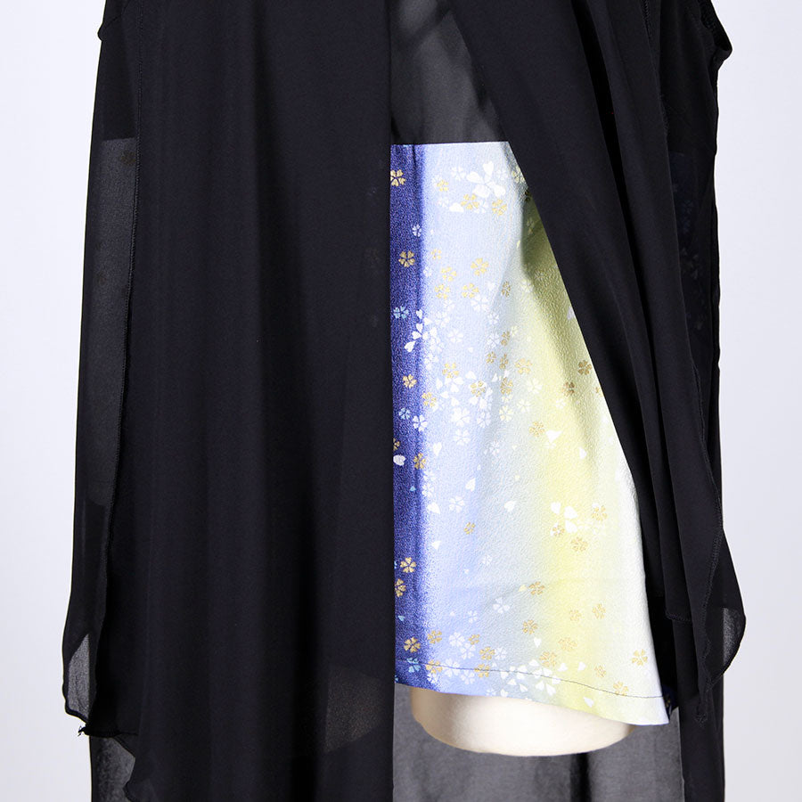 裏地には下半分を白から青色にグラデーション染めしたような土台に小さな桜が飛んでいる和柄を切り替えてあります。