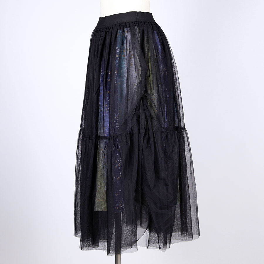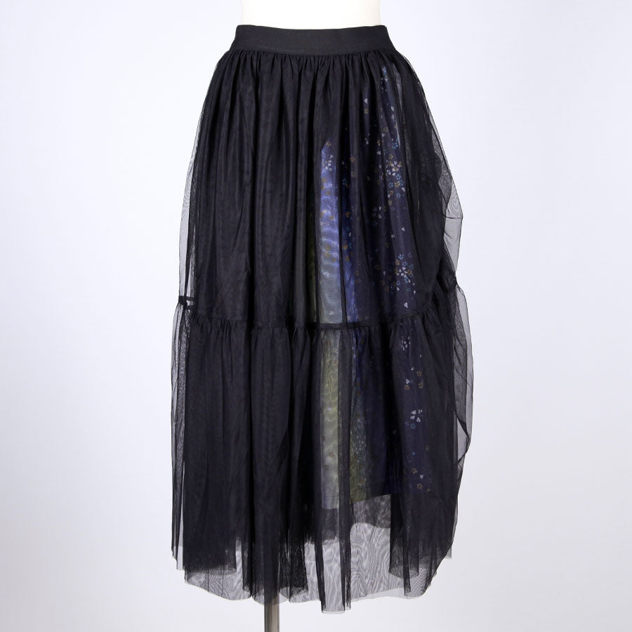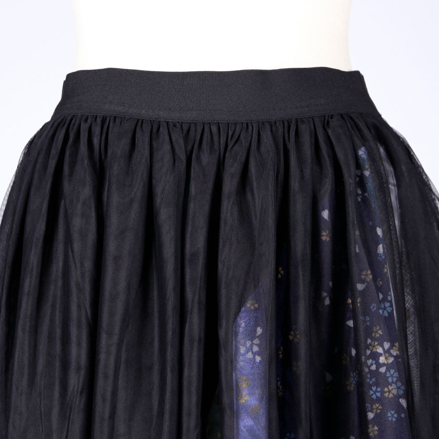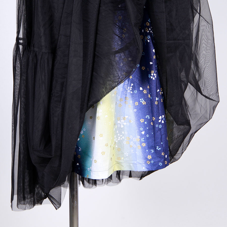 2枚重ねして2段に分かれているチュールスカートに、白から青色にグラデーション染めしたような土台に小さな桜が飛んでいる和柄を切り替えて裏地にしたスカート。