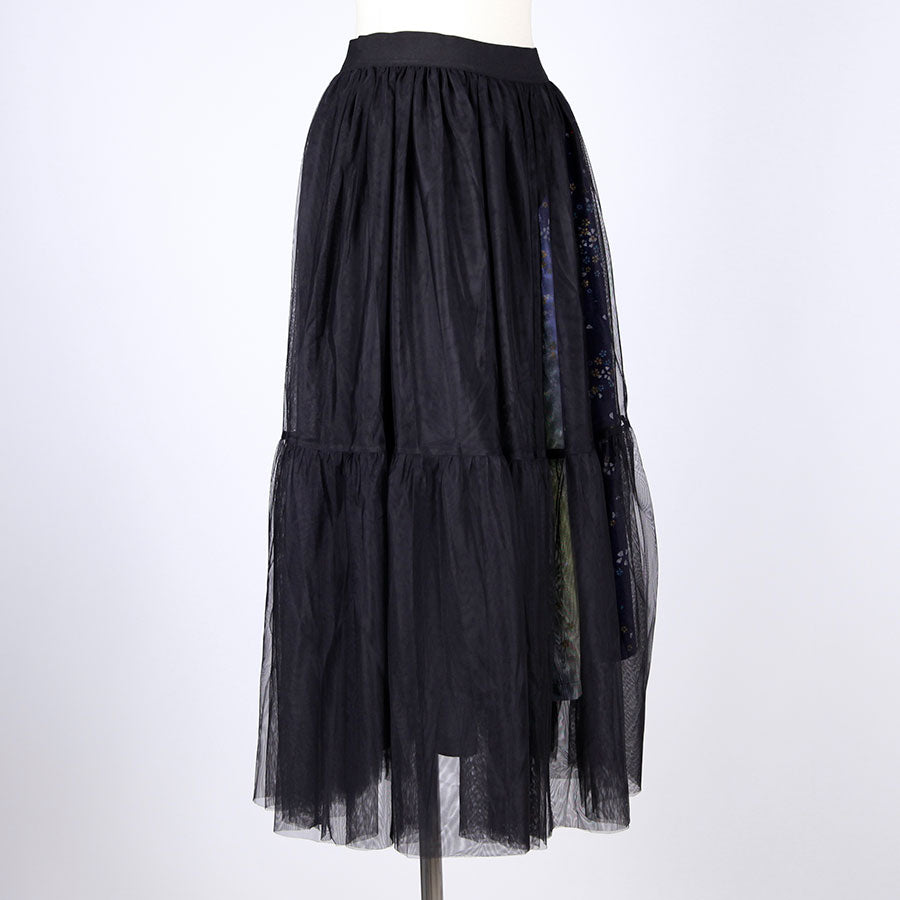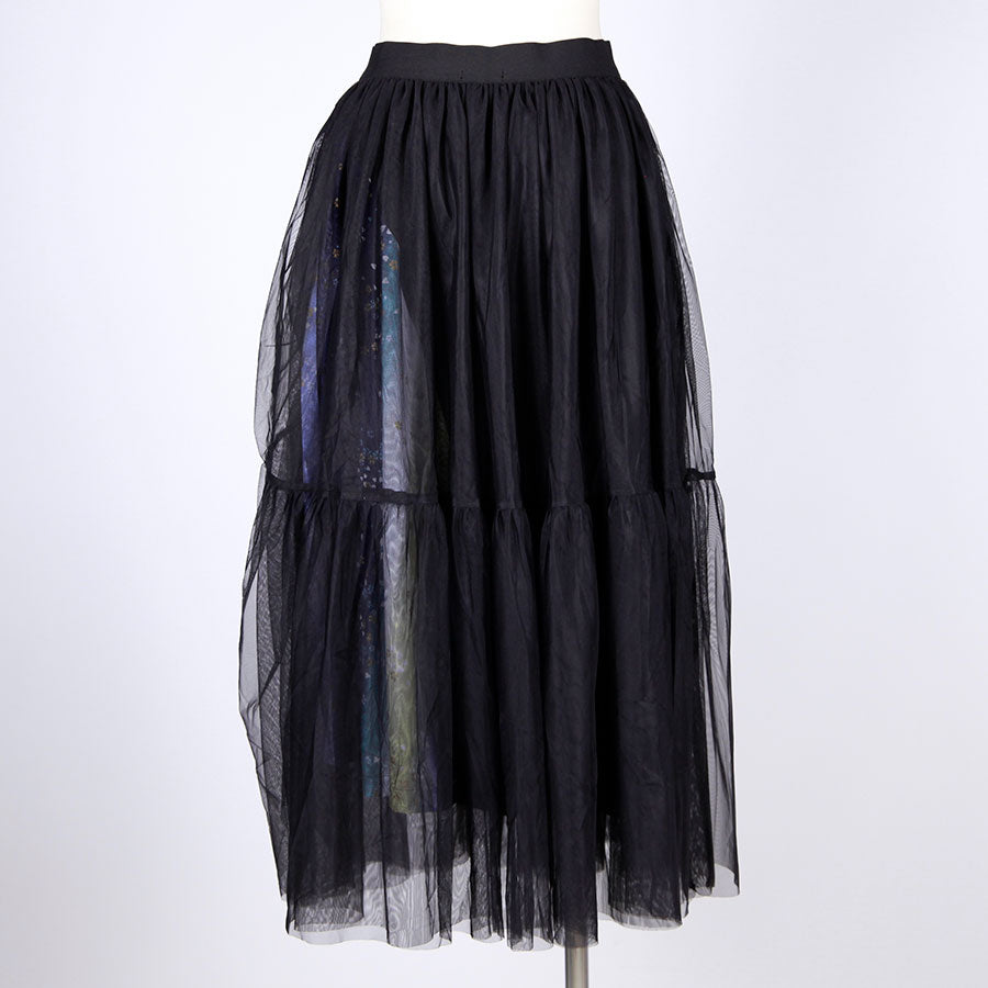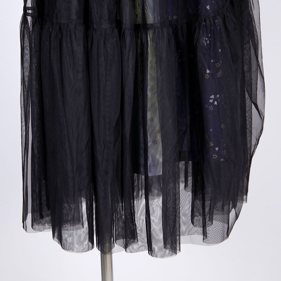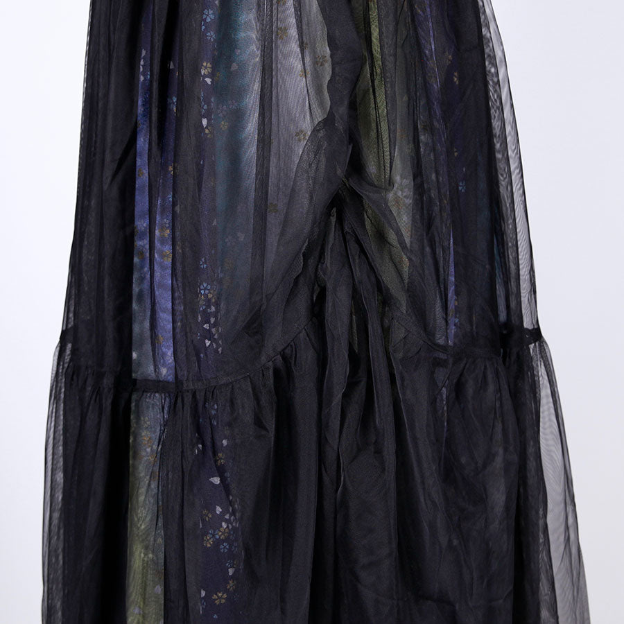 2枚重ねして2段に分かれているチュールスカートに、白から青色にグラデーション染めしたような土台に小さな桜が飛んでいる和柄を切り替えて裏地にしたスカート。