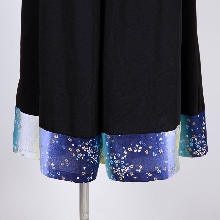 裾には、白から青色にグラデーション染めしたような土台に小さな桜が飛んでいる和柄をぐるっと切り替えてあります。
