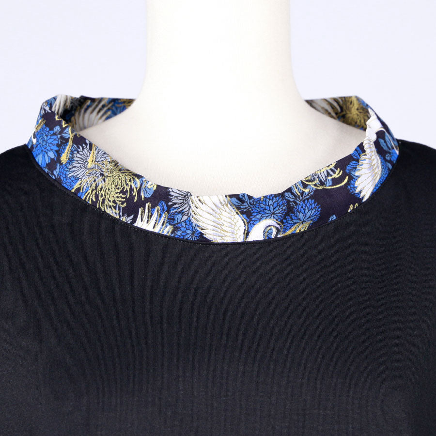 スタンドカラーと裾の左側には乱菊の中を舞っている様な鶴の和柄を使って作りました。