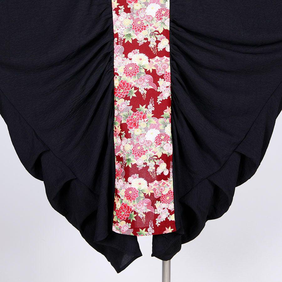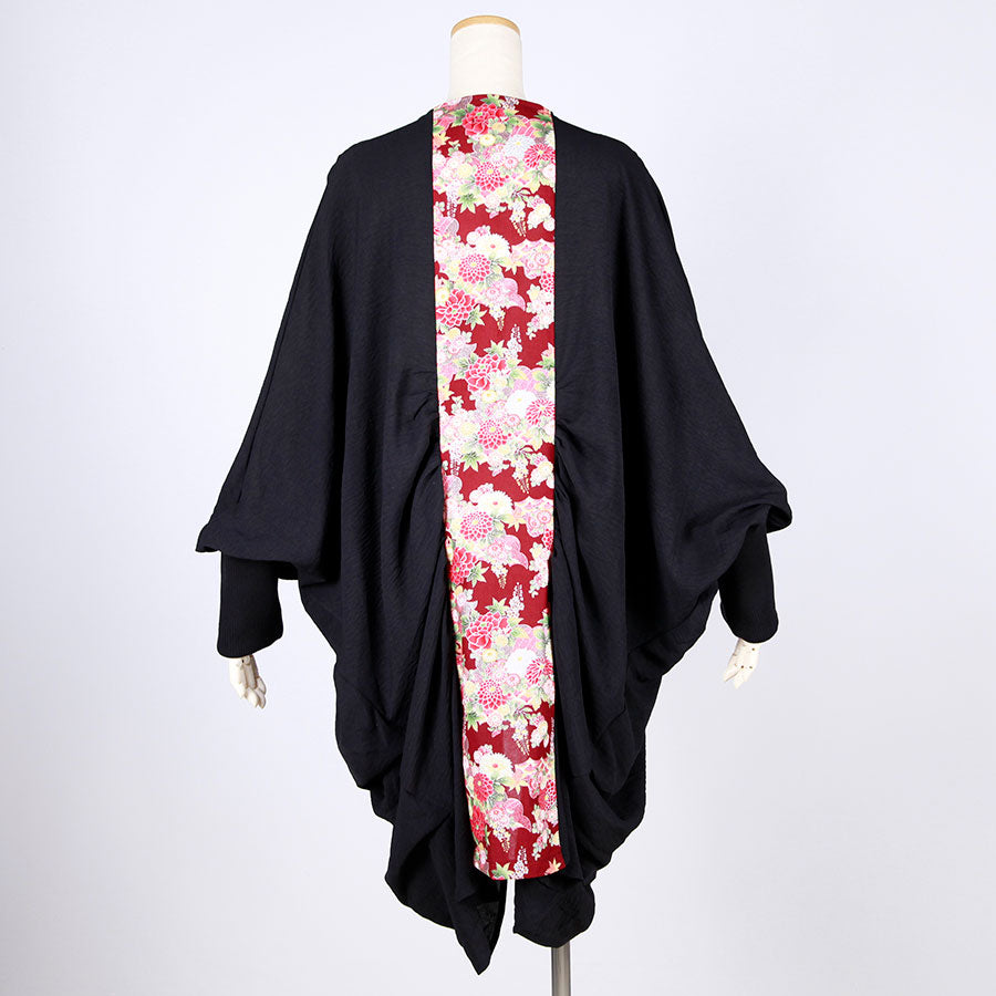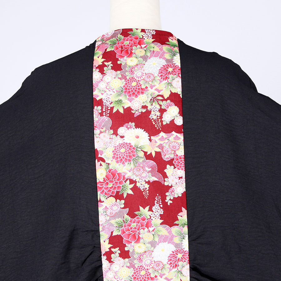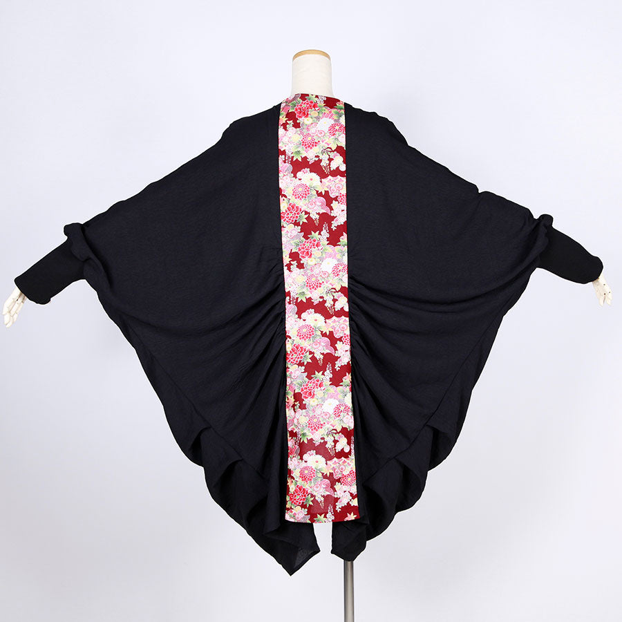 菊や牡丹、青から赤くなる紅葉などの秋の空に咲いている花の和柄を後ろ中心に真っ直ぐに切り替えたモモンガ型の羽織り。