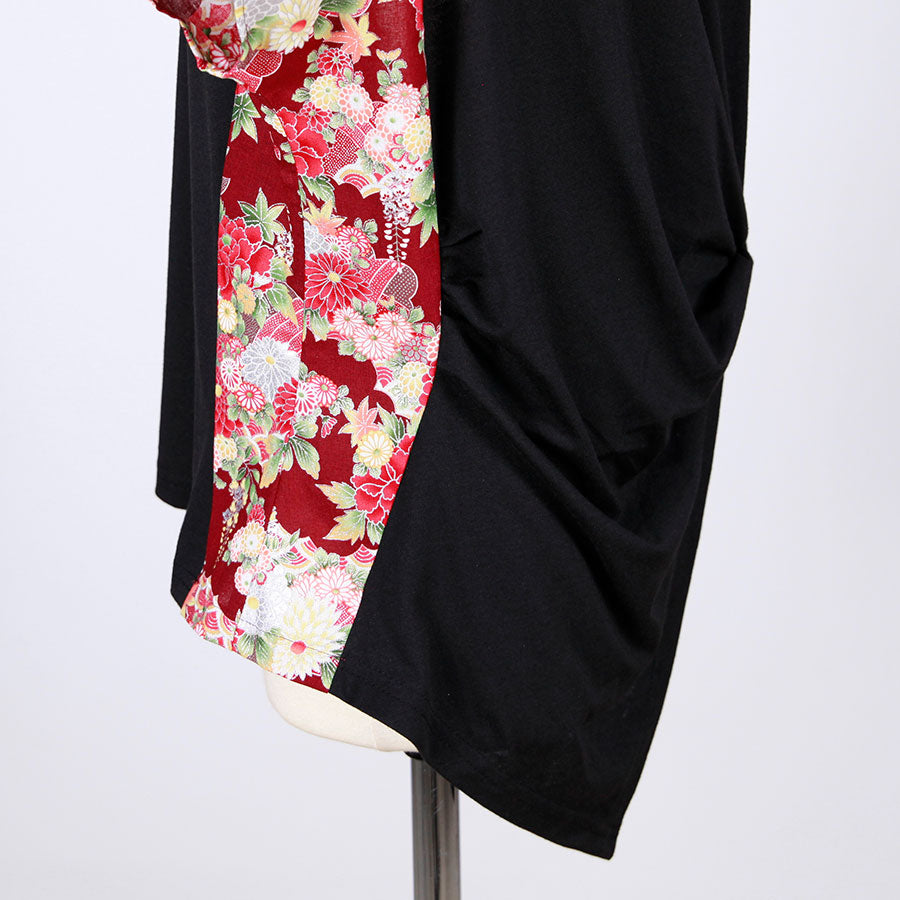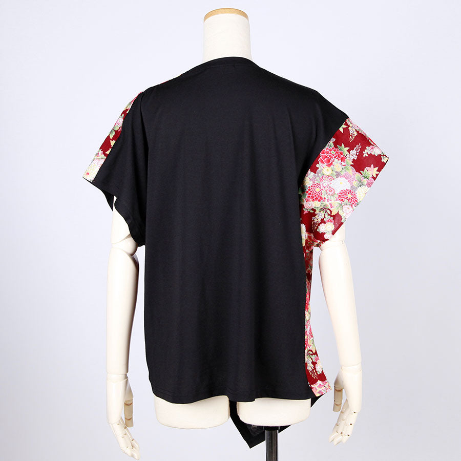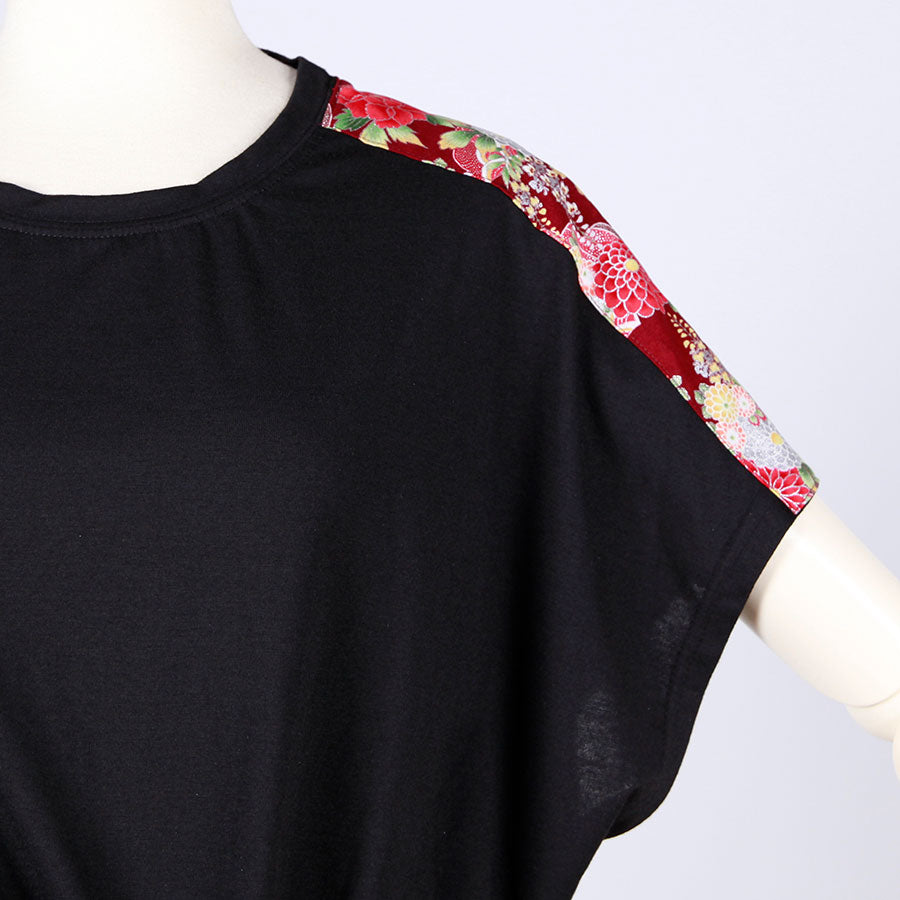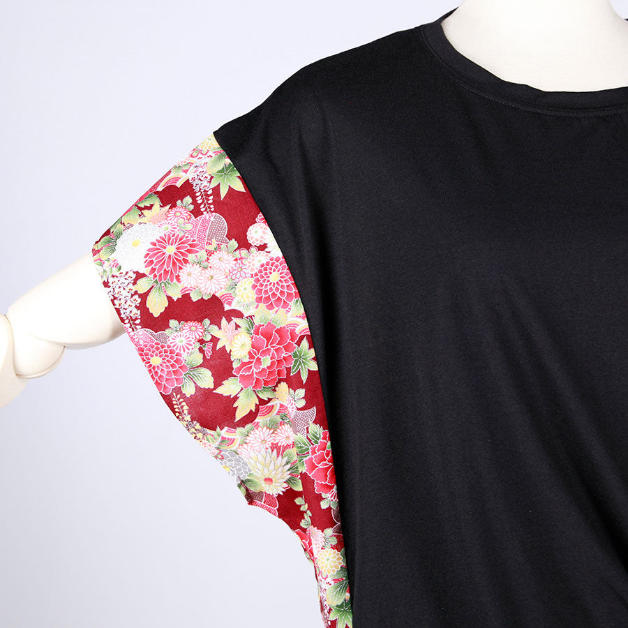 右袖と左肩線には菊や牡丹、青から赤くなる紅葉などの秋の空に咲いている花の和柄を使っています。