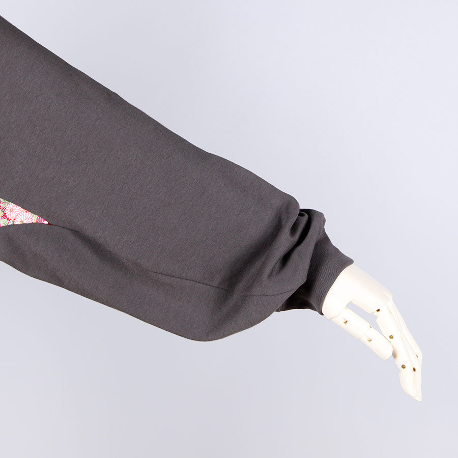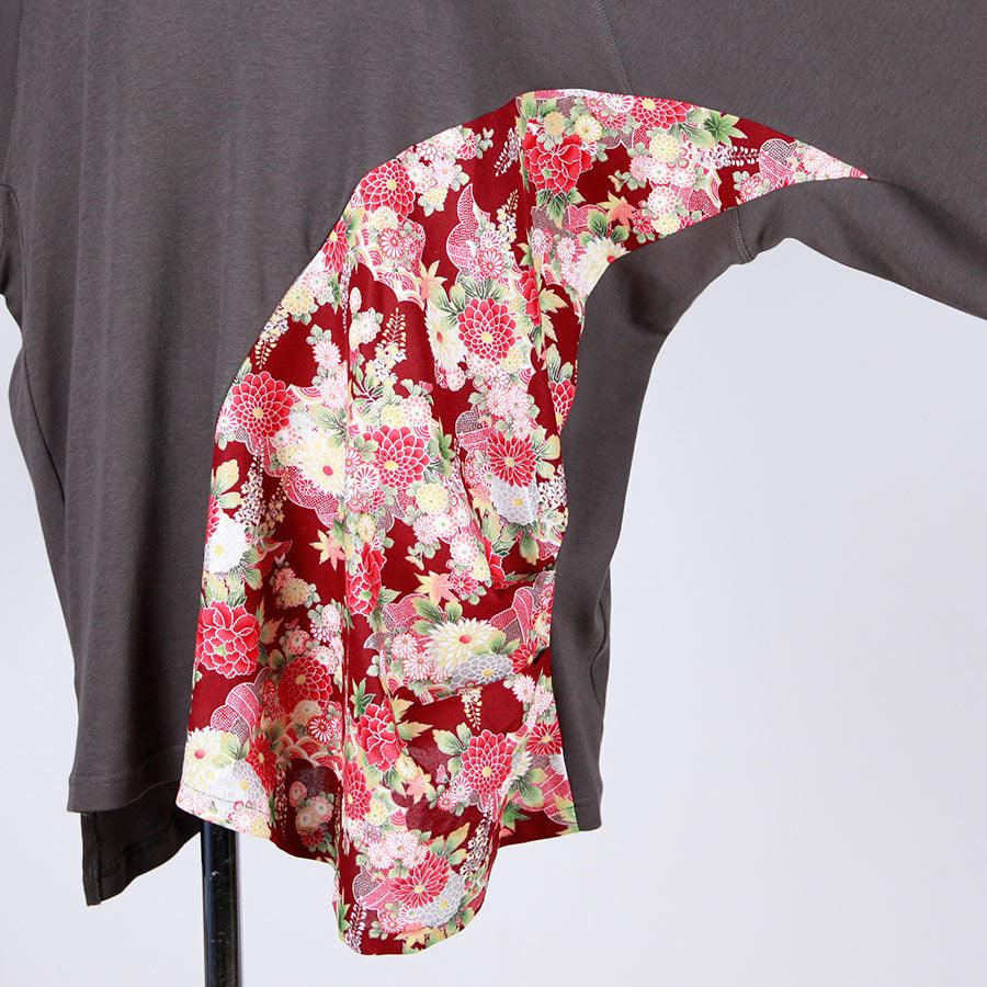 左袖下部分から左の脇に菊や牡丹、青から赤くなる紅葉などの秋の空に咲いている花の和柄を切り替えて作りました。