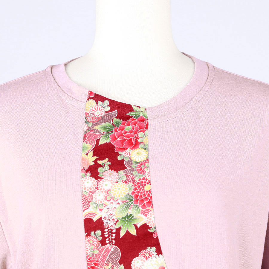 桃色と紫色のミックスしたようなカットソーと赤い菊や牡丹、青から赤くなる紅葉などの秋の空に咲いている花の和柄を合わせて作りました。