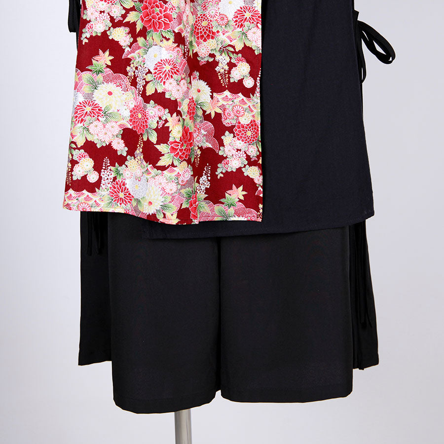 前右の腰布には赤い菊や牡丹、青から赤くなる紅葉などの秋の空に咲いている花の和柄を使っています。