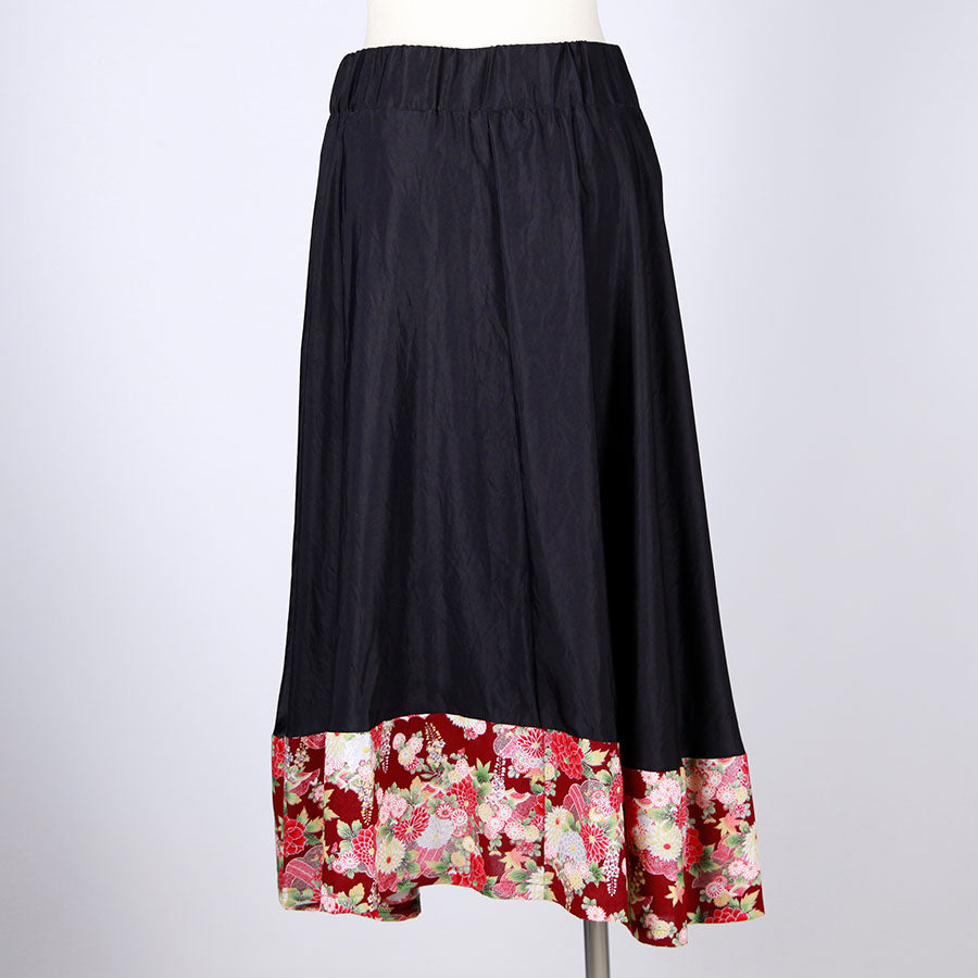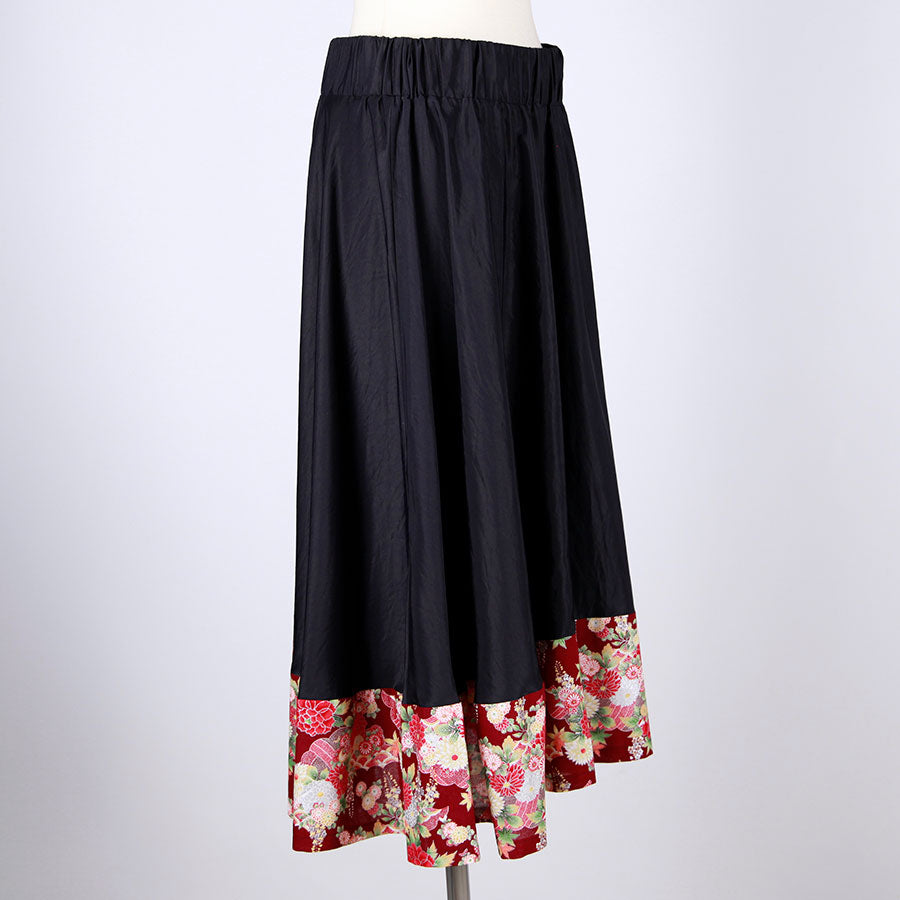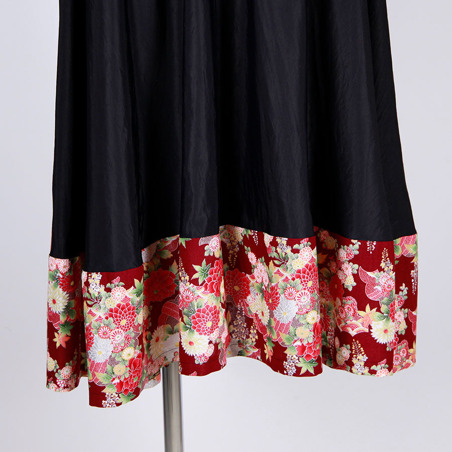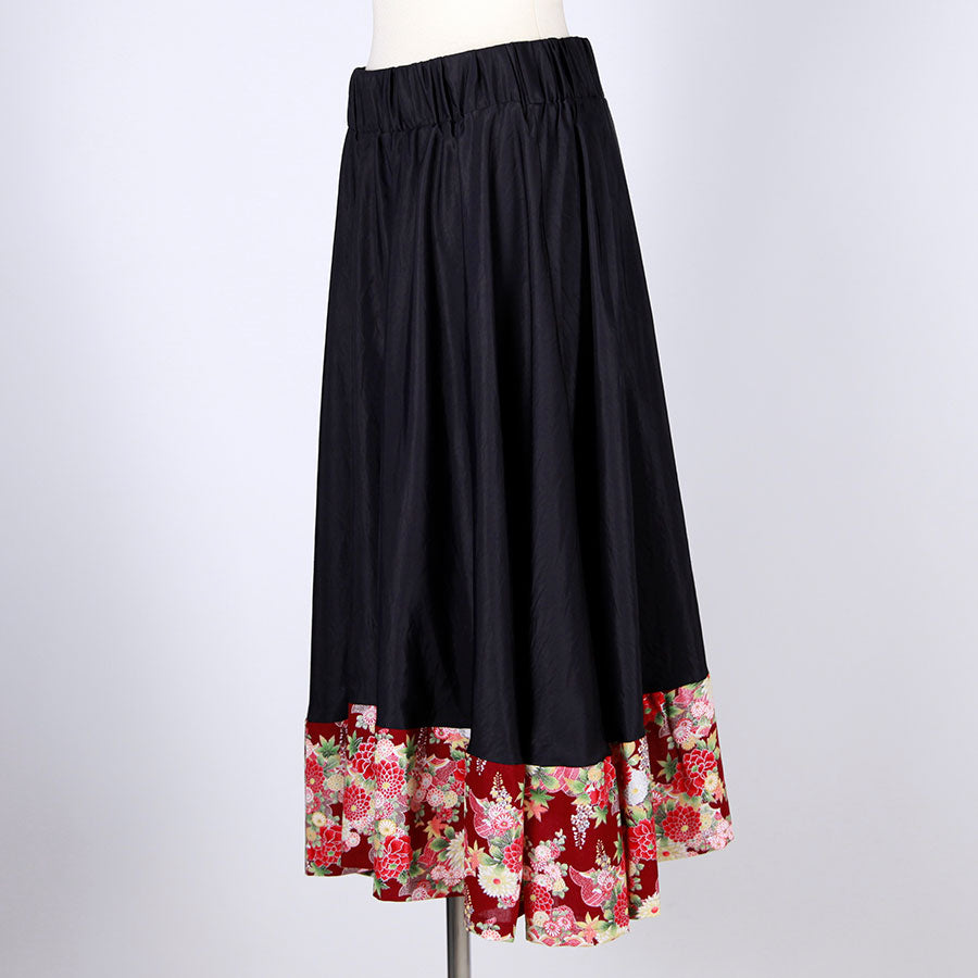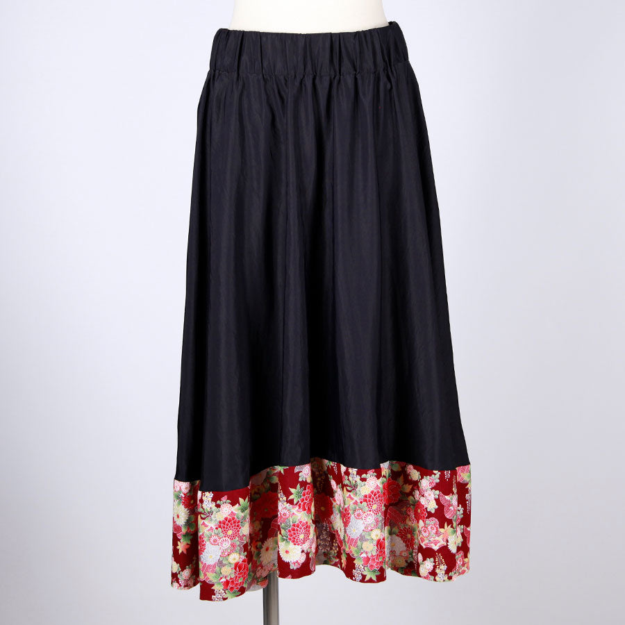 裾に太めに切り替えた赤い菊や牡丹、青から赤くなる紅葉などの秋の空に咲いている花の和柄がポイントのフレアースカート。