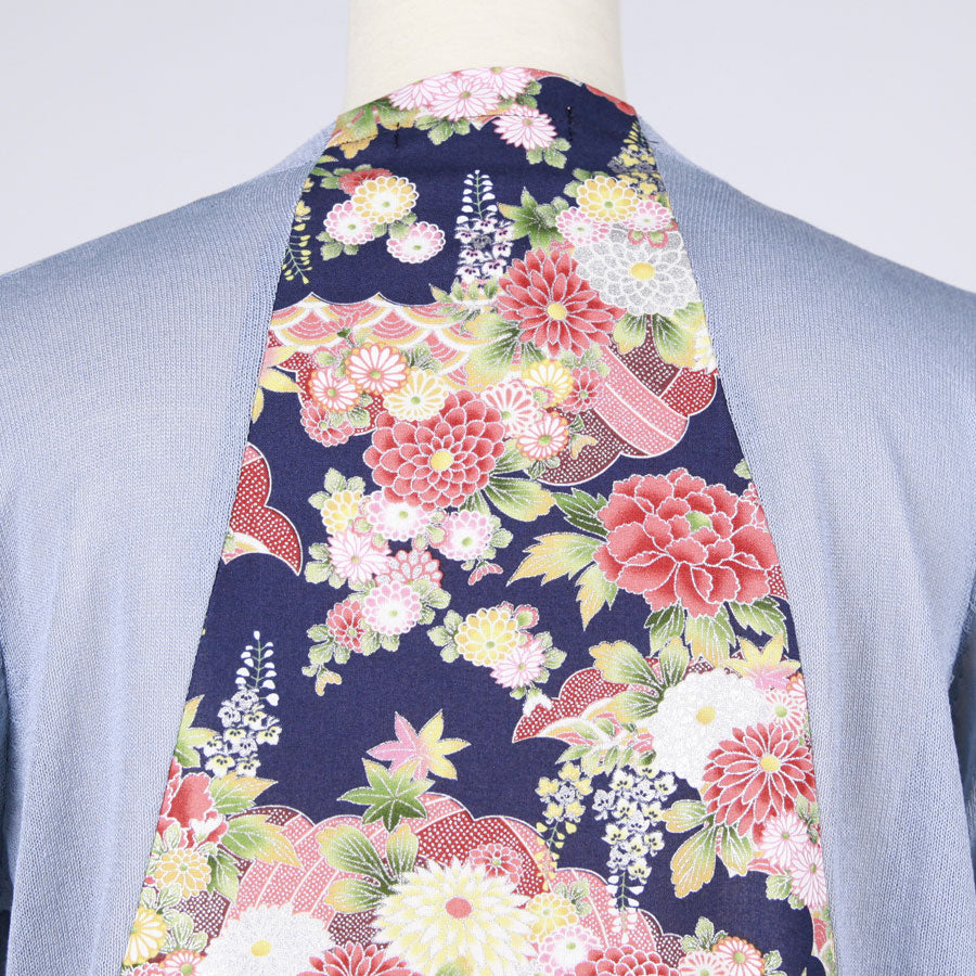 秋に咲く色々な花や紅葉しかけの葉、青海波などと共に描かれた和柄を後ろに大きく使った水色の薄手のカーディガン。