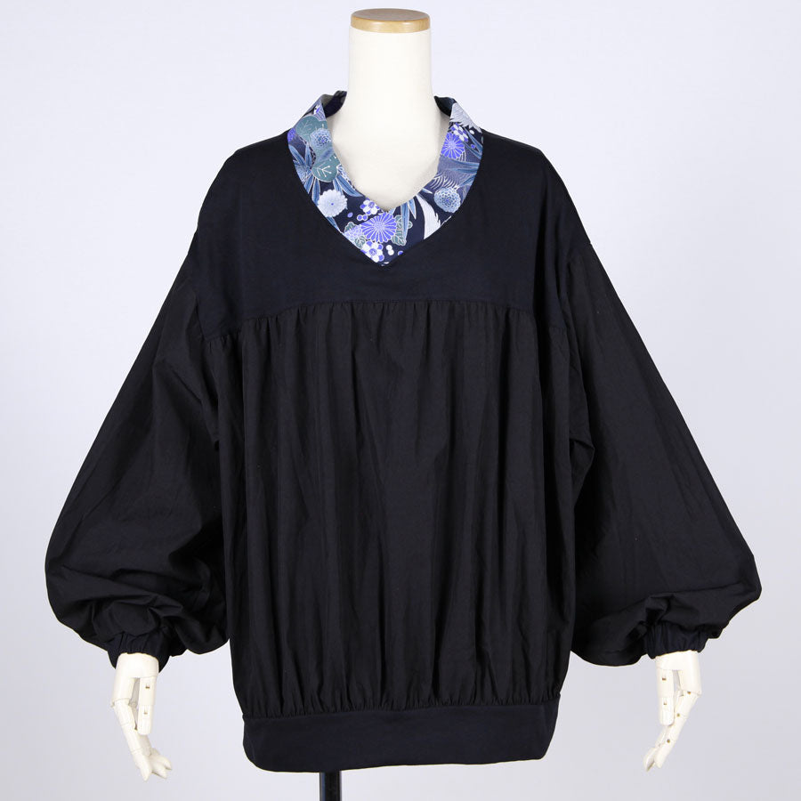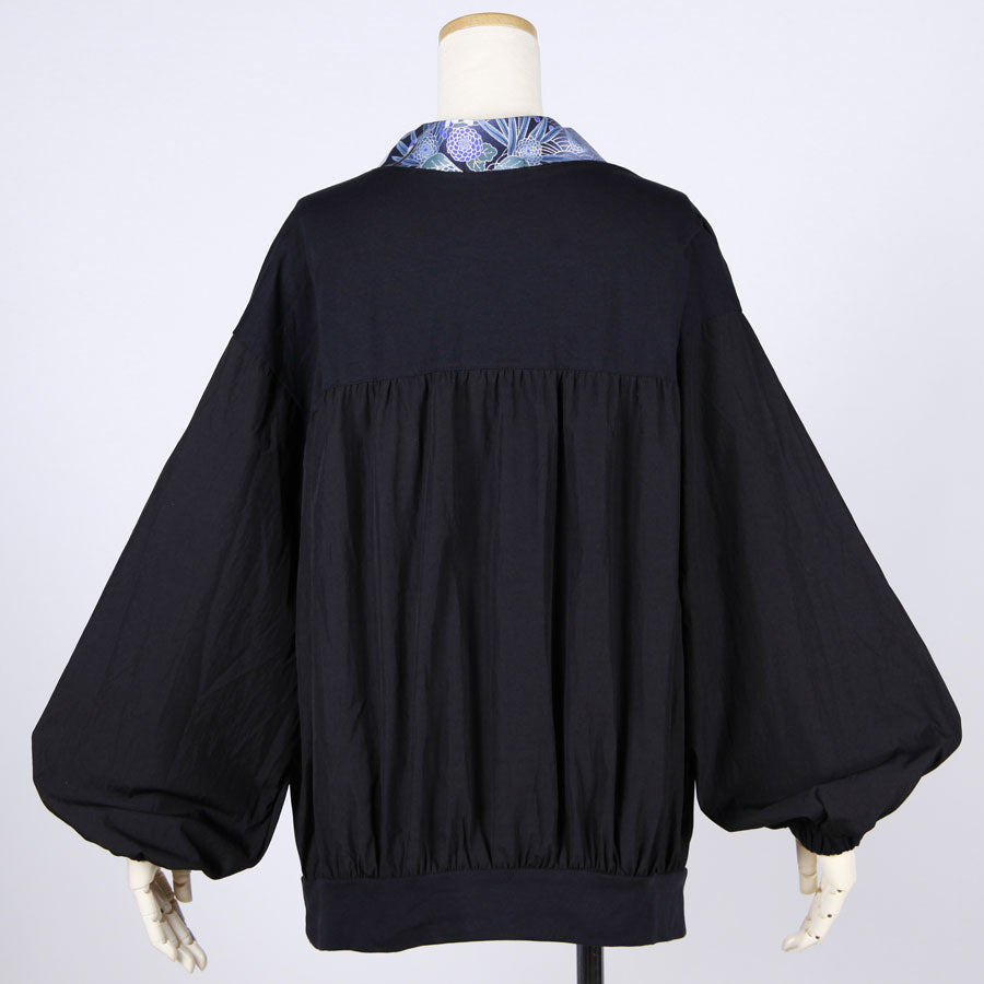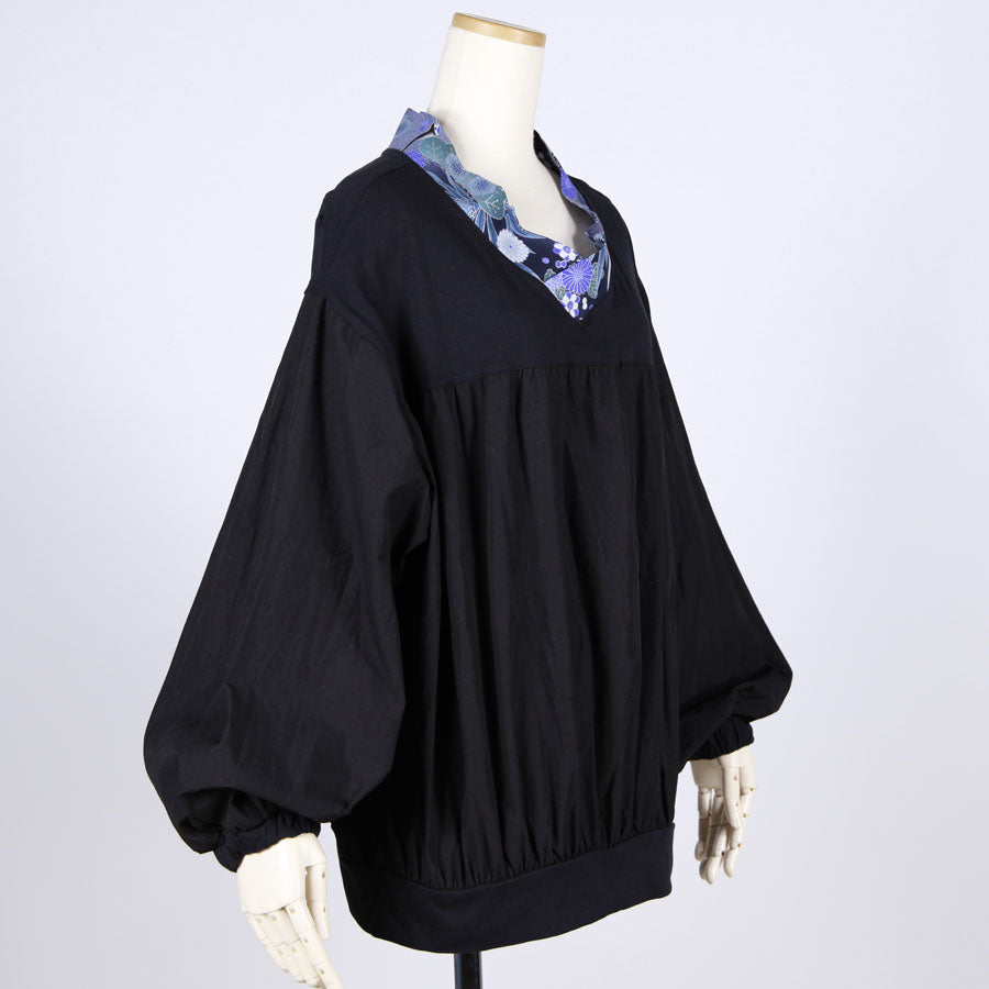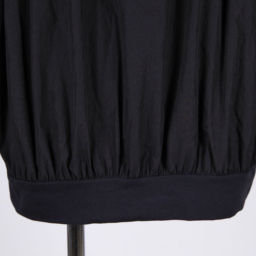 袖と見頃下半分をポリエステル生地でギャザーを入れて切り替えたトップス。