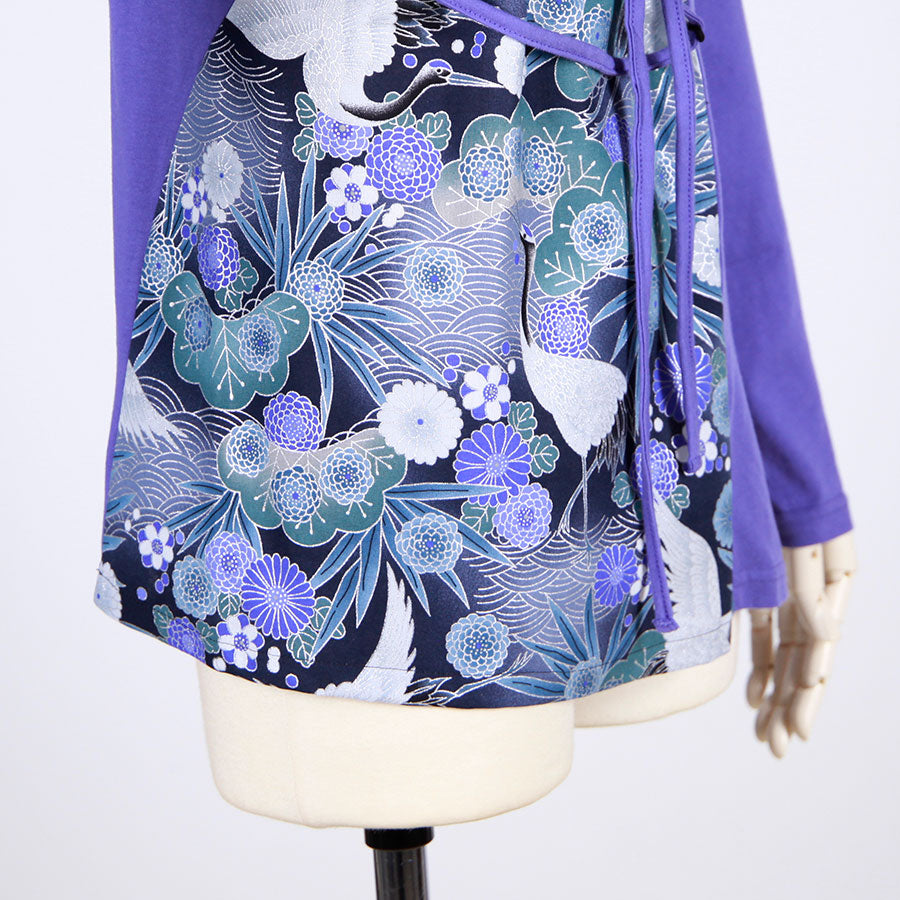 前から右脇にかけて菊、青海波、梅の中を大きく羽ばたく全体的に蒼い雰囲気の和柄を切り替え、編み上げの紐通しをつけて編み上げにしてみました。