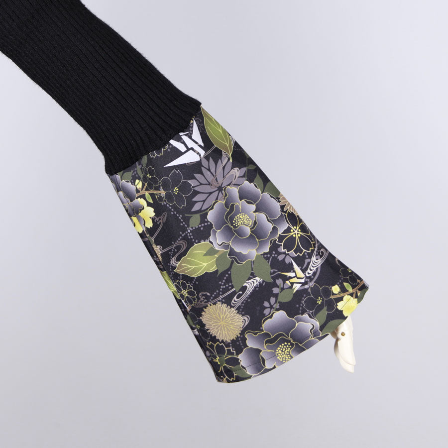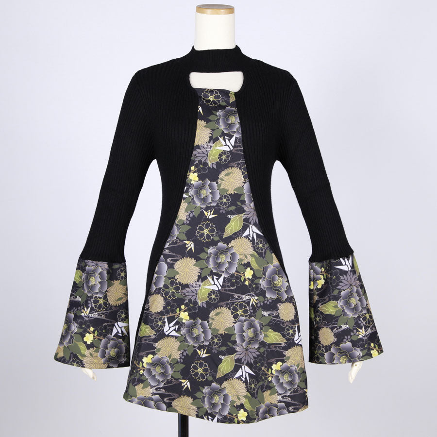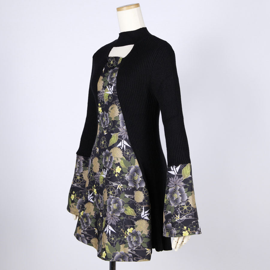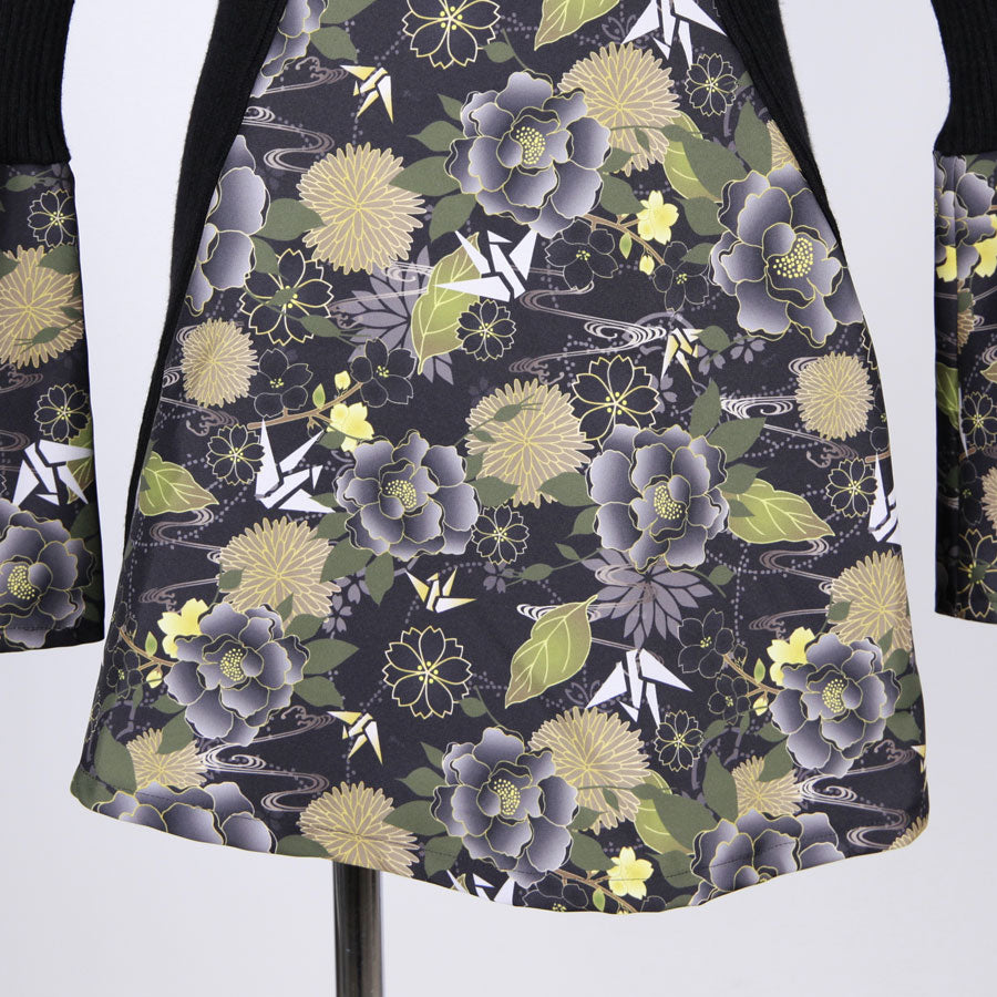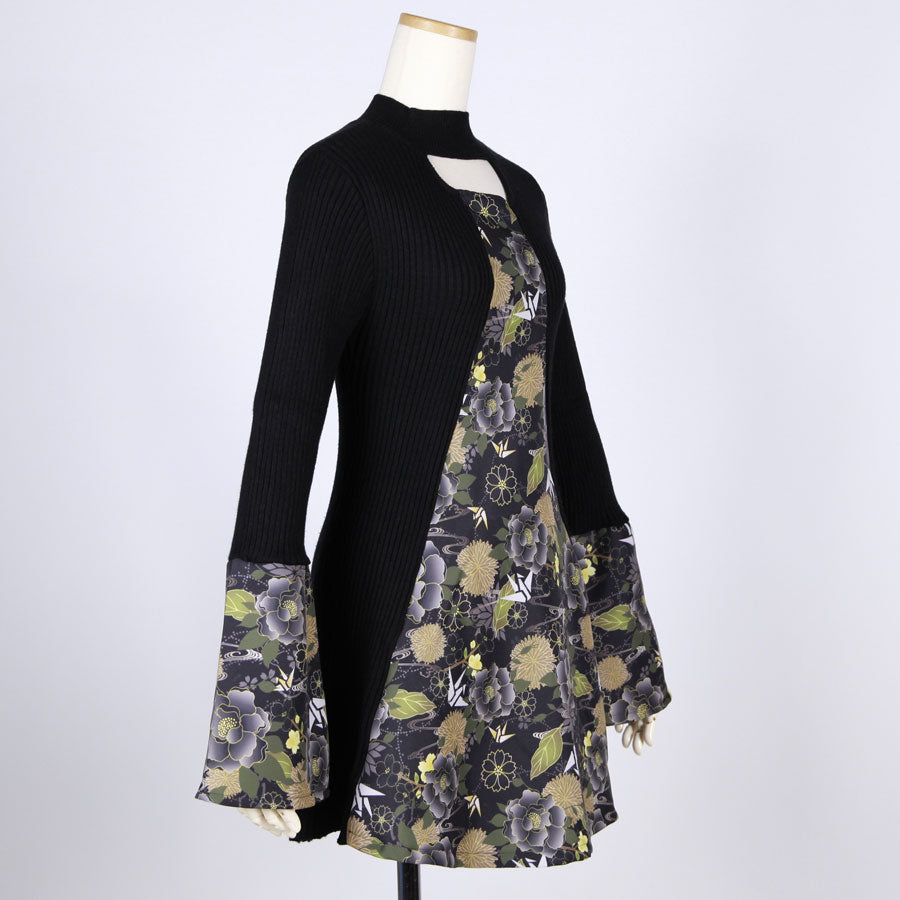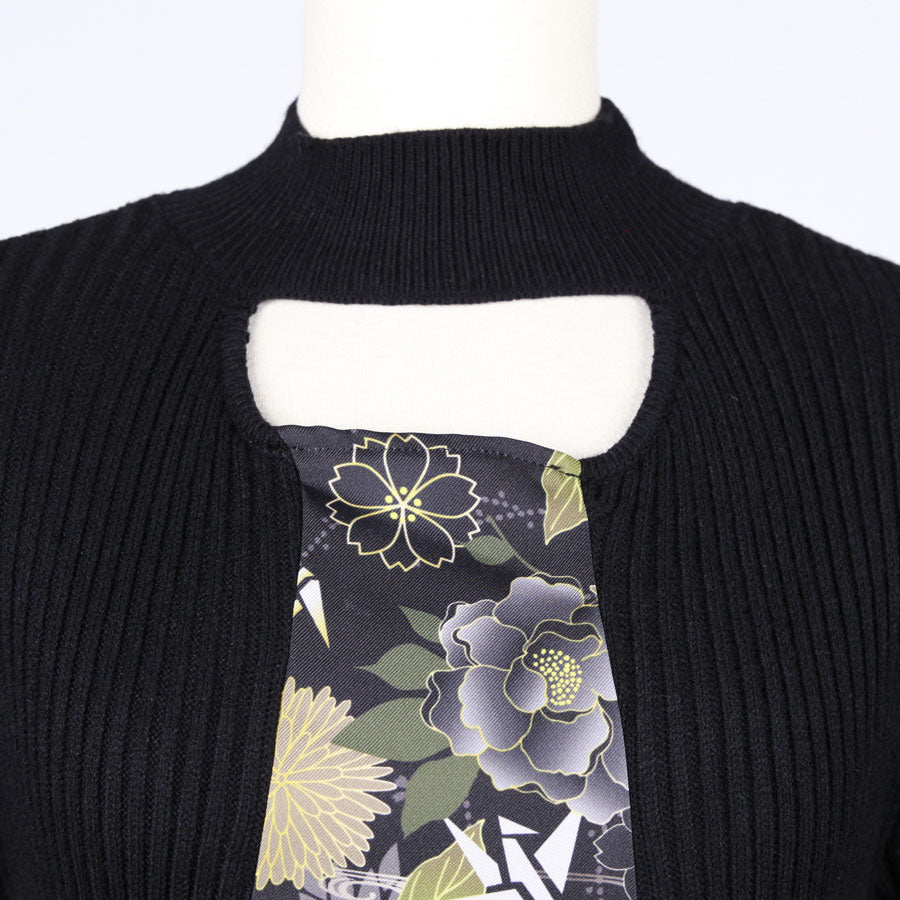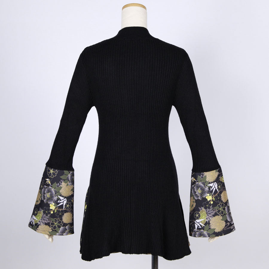 前見頃と袖口に菊や芍薬、八重桜などの吉祥花の中に跳ぶ折り鶴の新しい黒色ベースの新しい和柄を使ったリブあみのロング丈のニット。