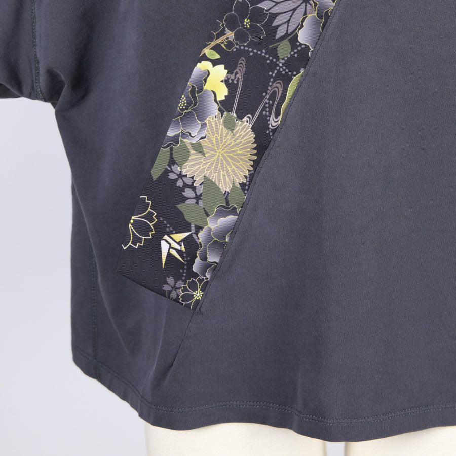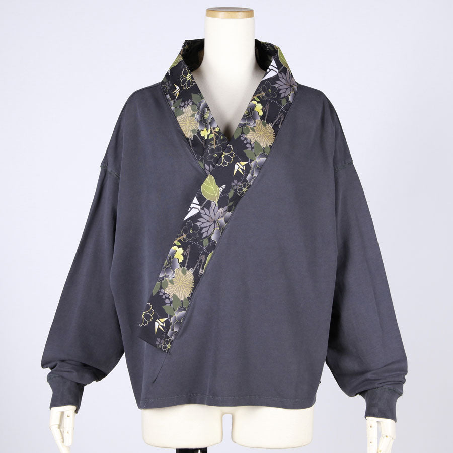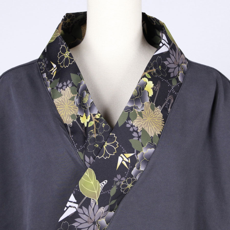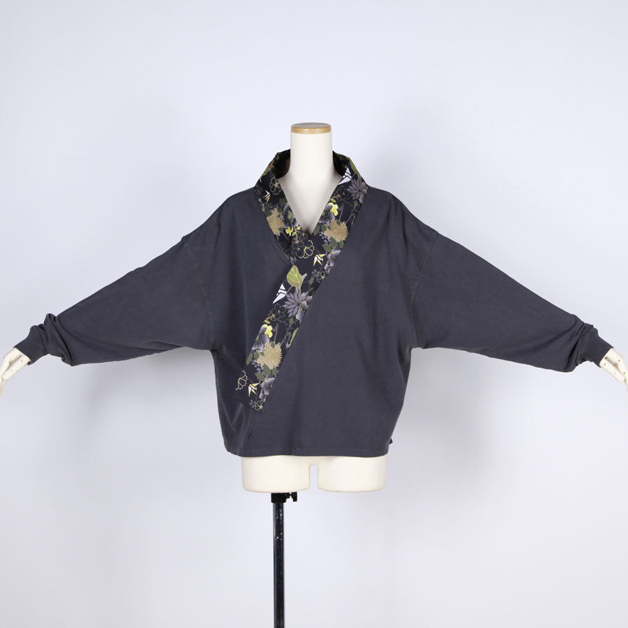 【一点物】TKg 花中の折り鶴黒 着物襟ゆったりトップス